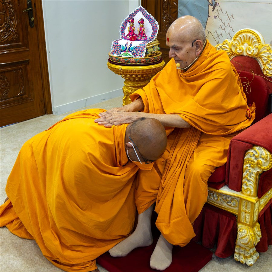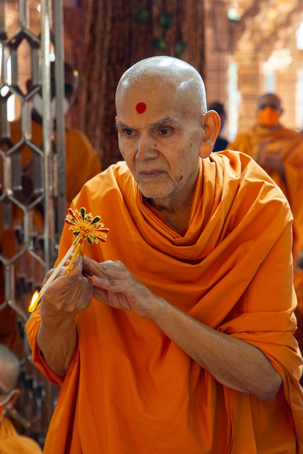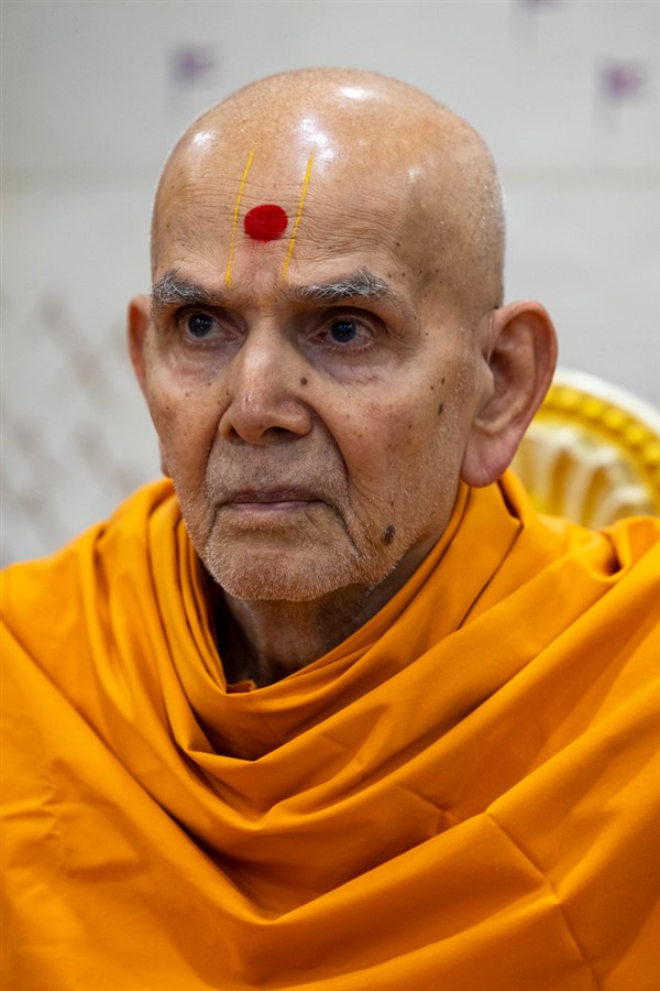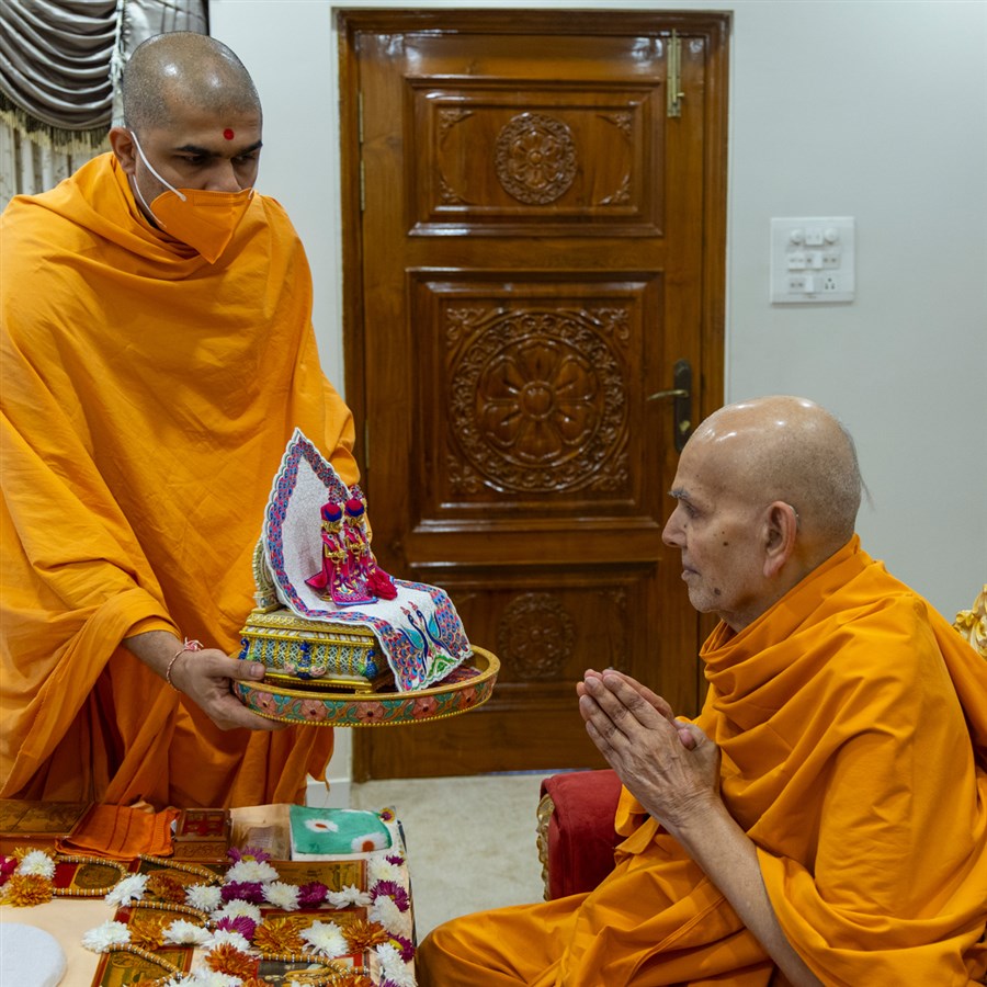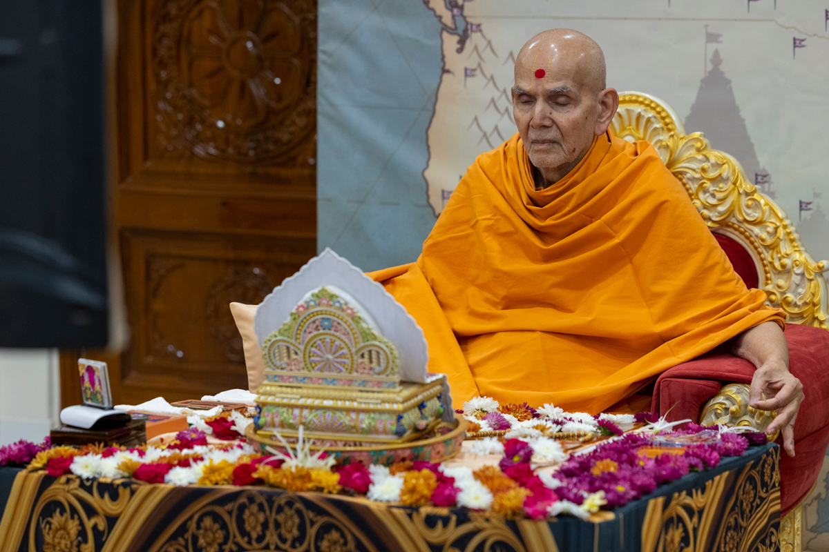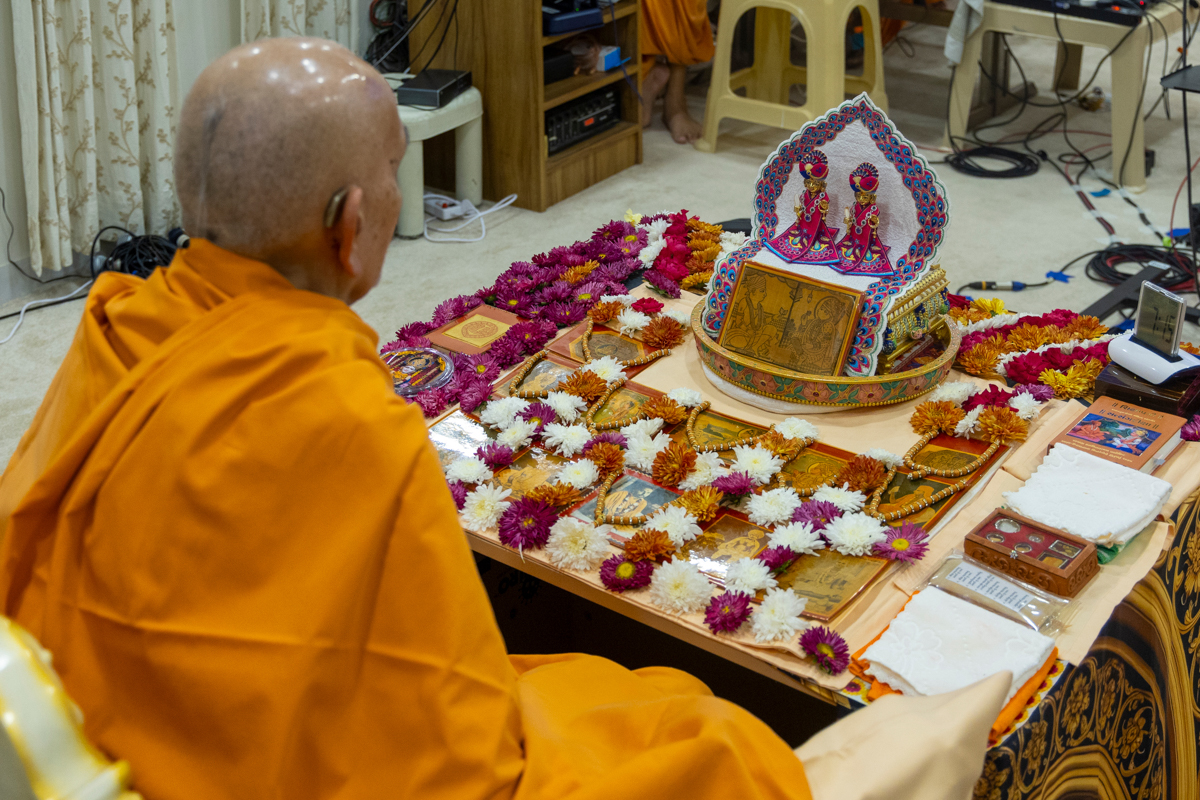 Param Pujya Mahant Swami Maharaj engrossed in darshan of Shri Harikrishna Maharaj and Shri Gunatitanand Swami Maharaj