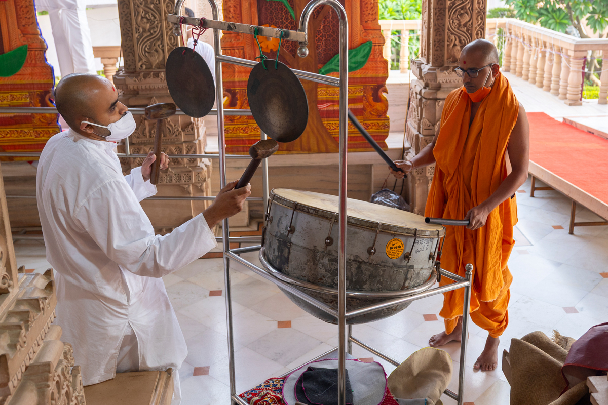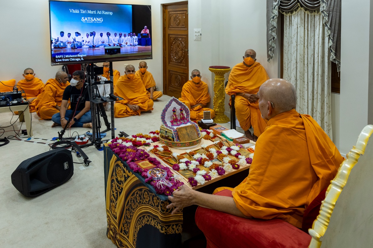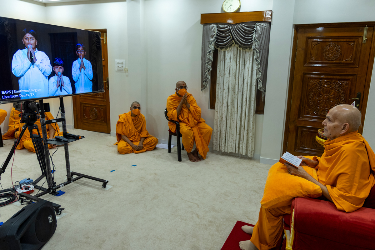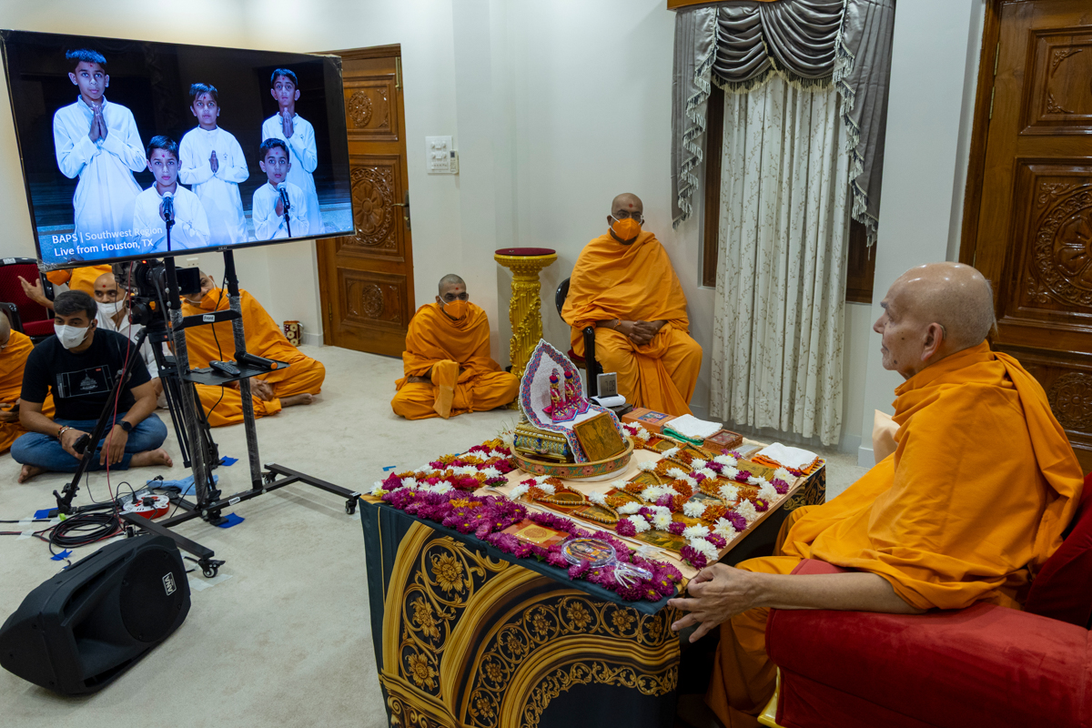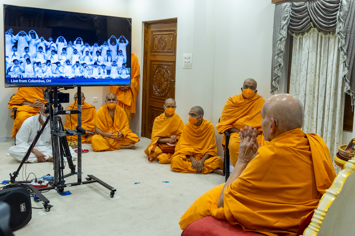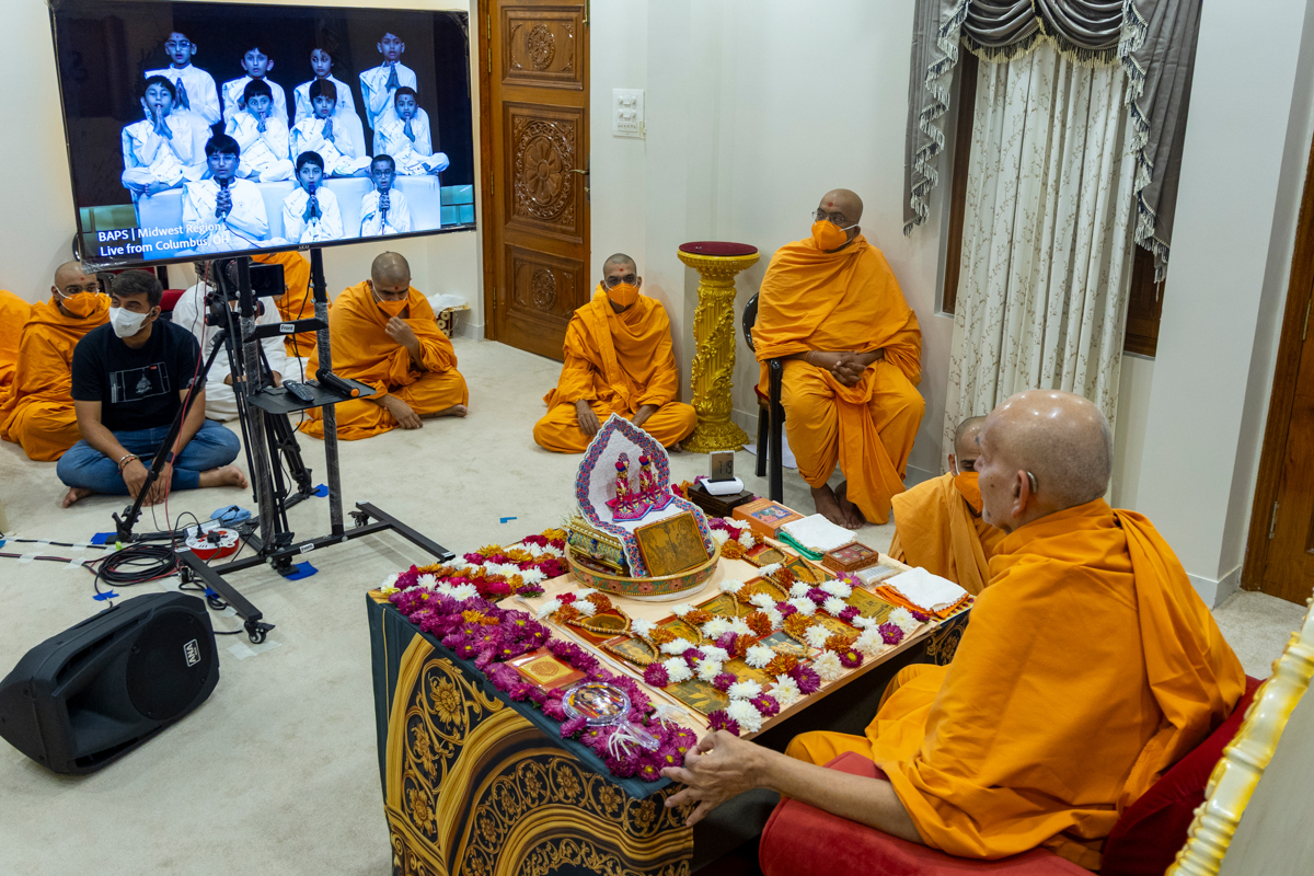Youths from Chicago, USA, sing kirtans in Swamishri's daily puja via video conference