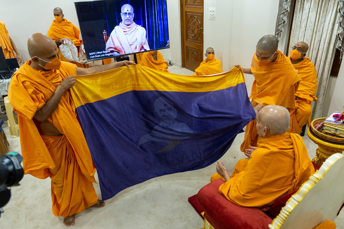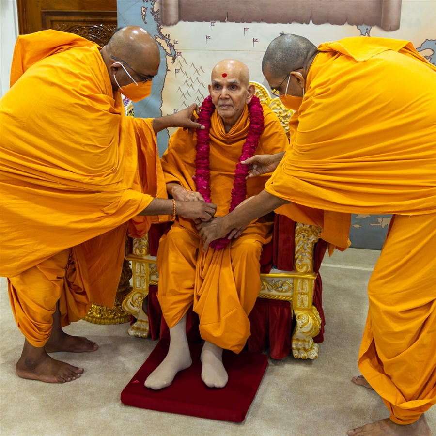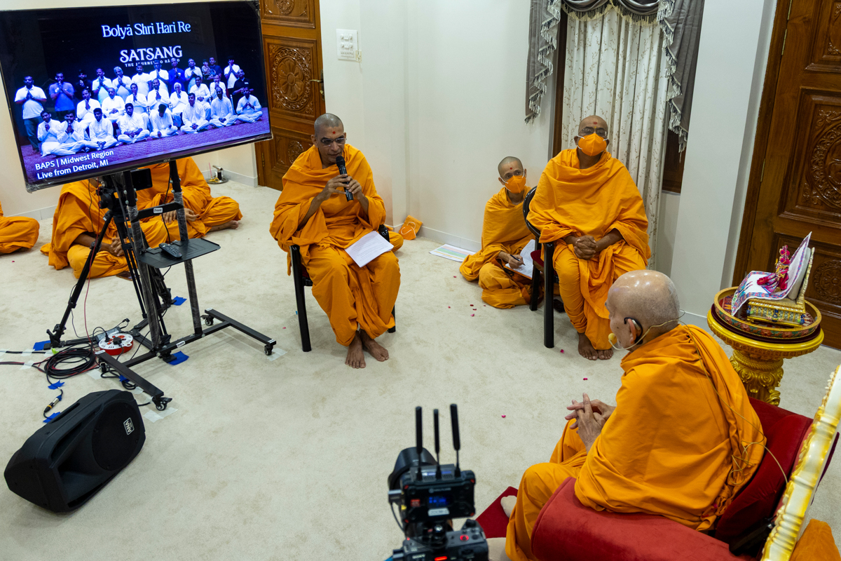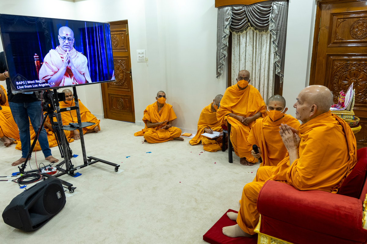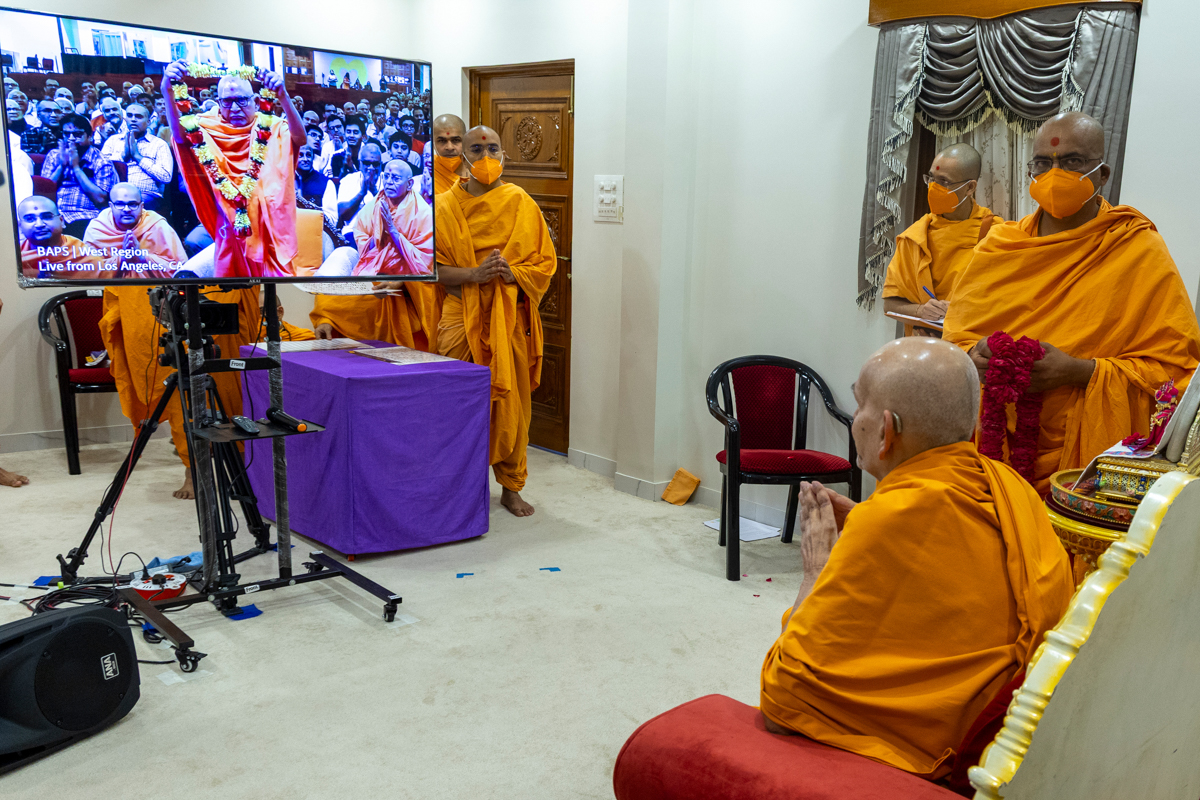 Pujya Bhaktipriya Swami (Kothari Swami) honors Swamishri with a garland via video conference