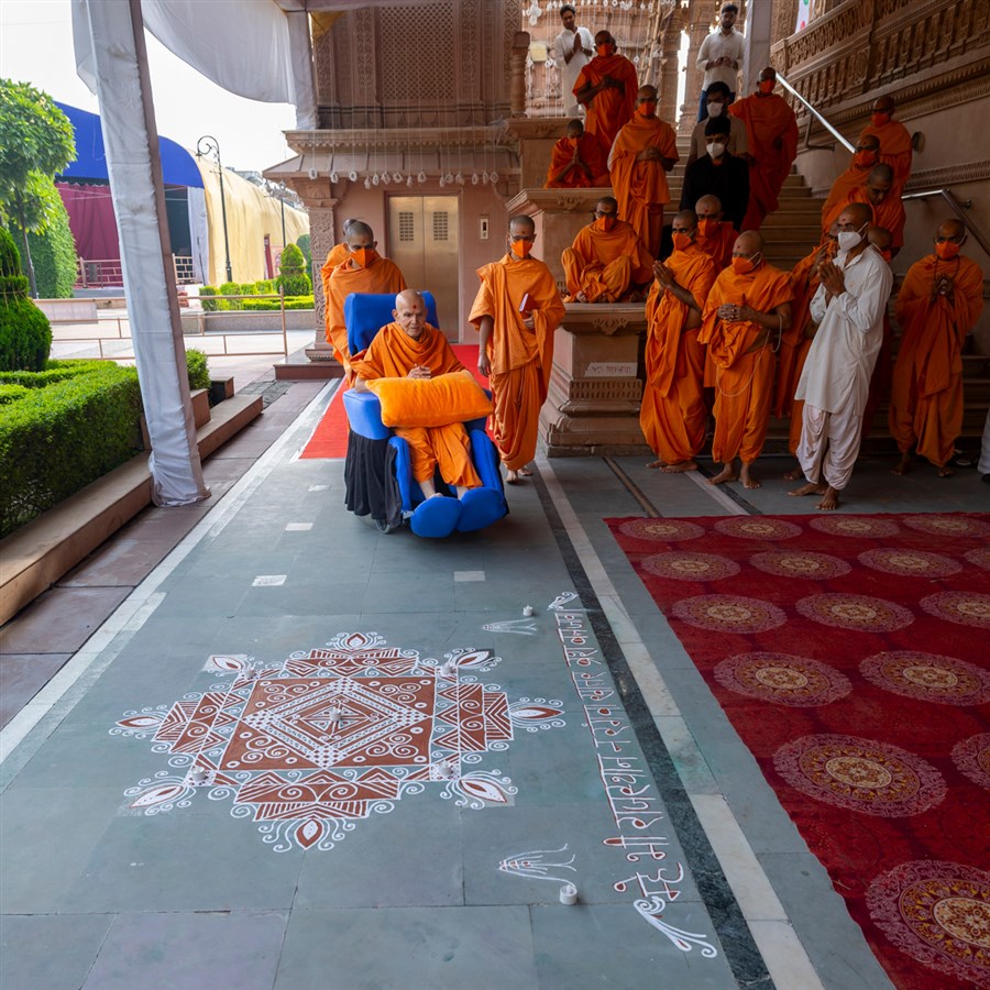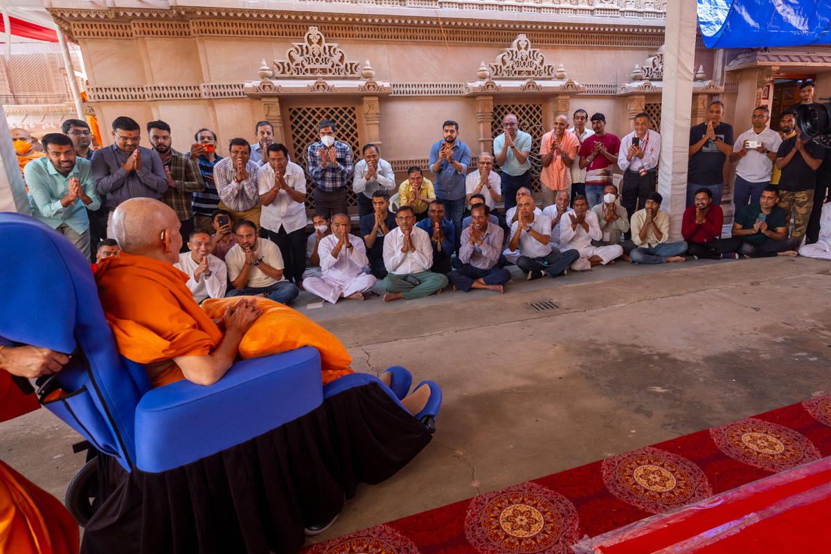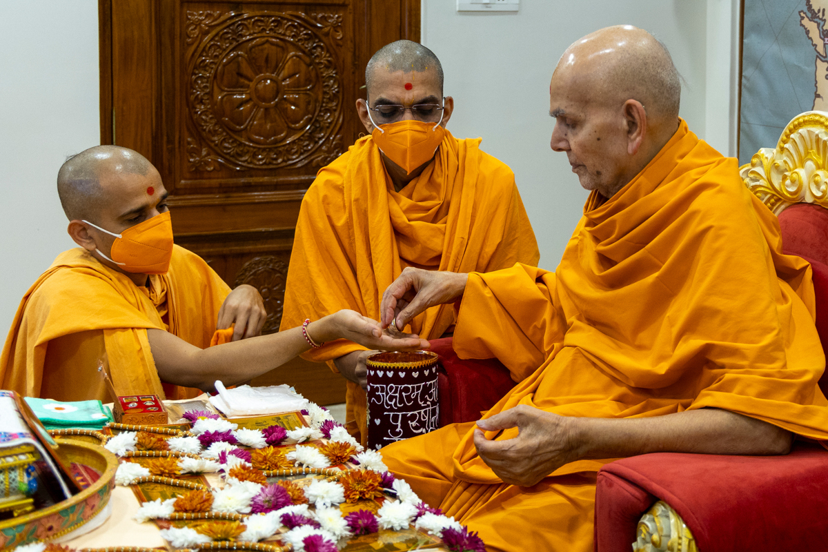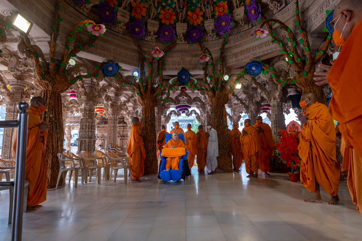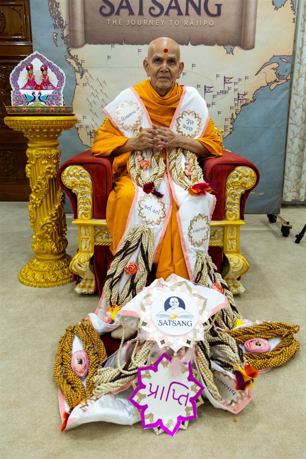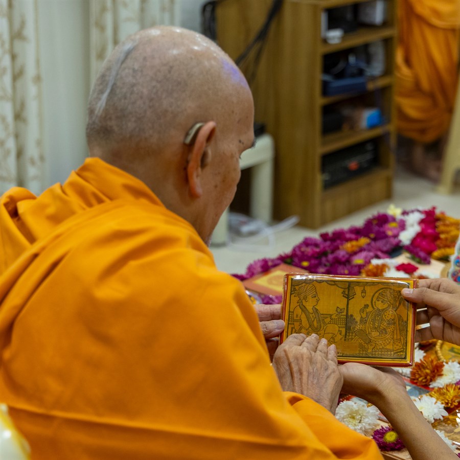 Pujya Bhaktipriya Swami (Kothari Swami) honors Swamishri with a garland via video conference