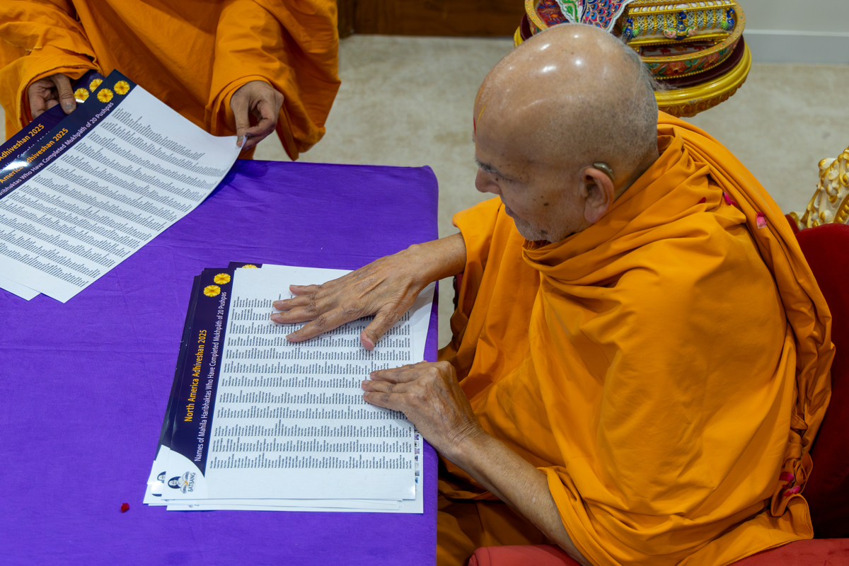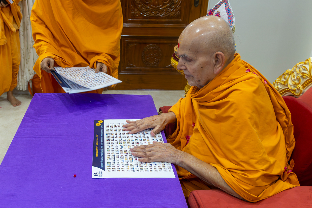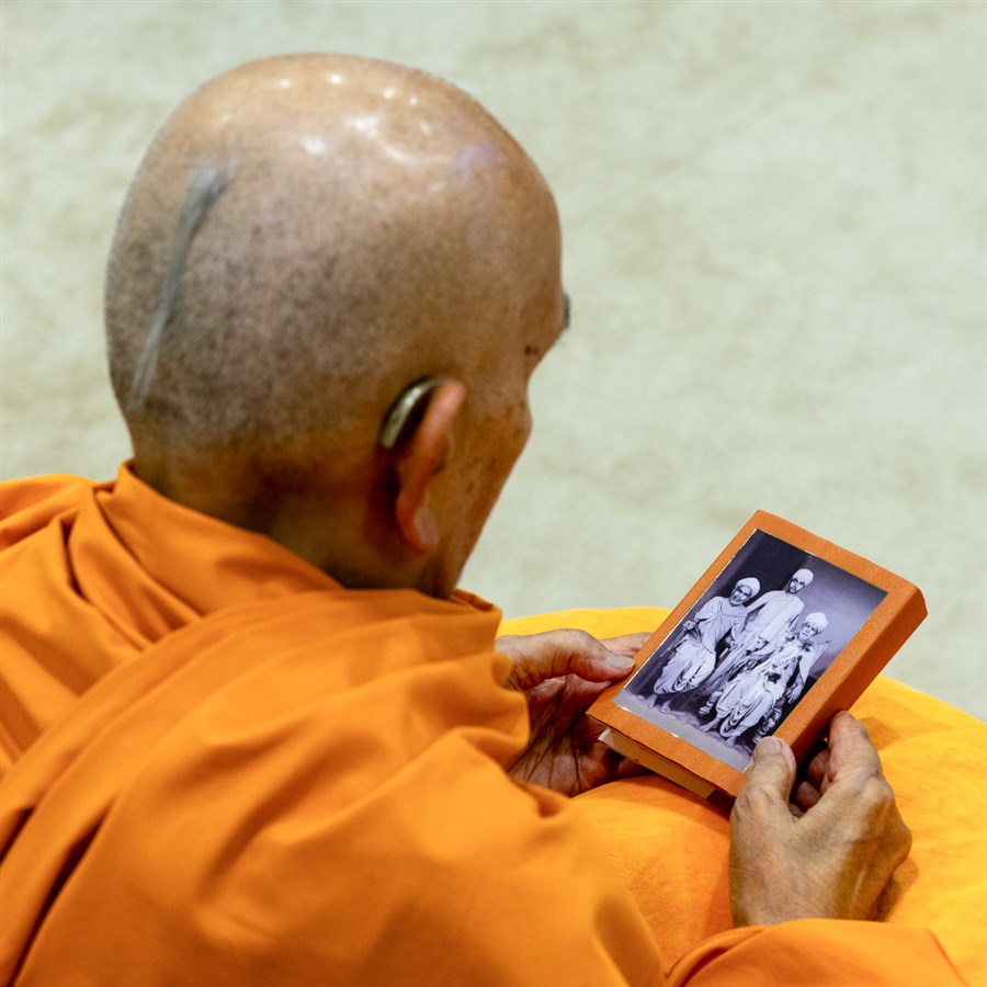 Swamishri engrossed in darshan of Shri Guru Parampara