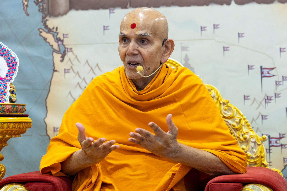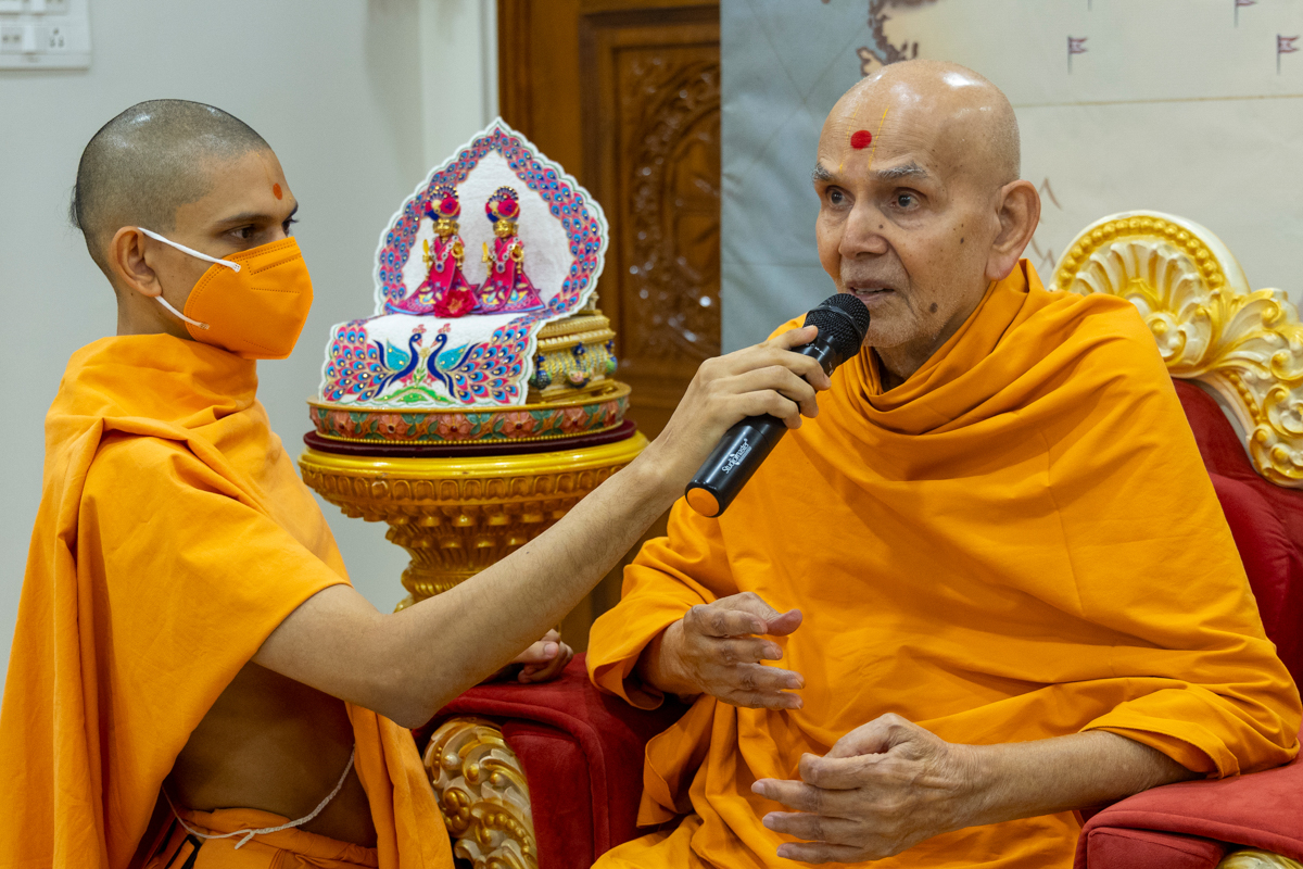 Adarshjivan Swami poses questions to Swamishri during an interactive session