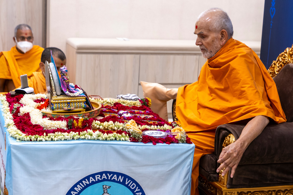 Param Pujya Mahant Swami Maharaj performs the morning arti