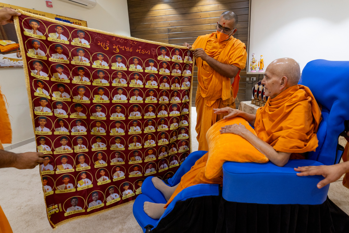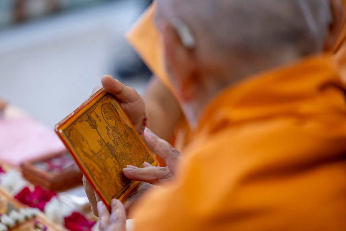 Param Pujya Mahant Swami Maharaj observes a shawl