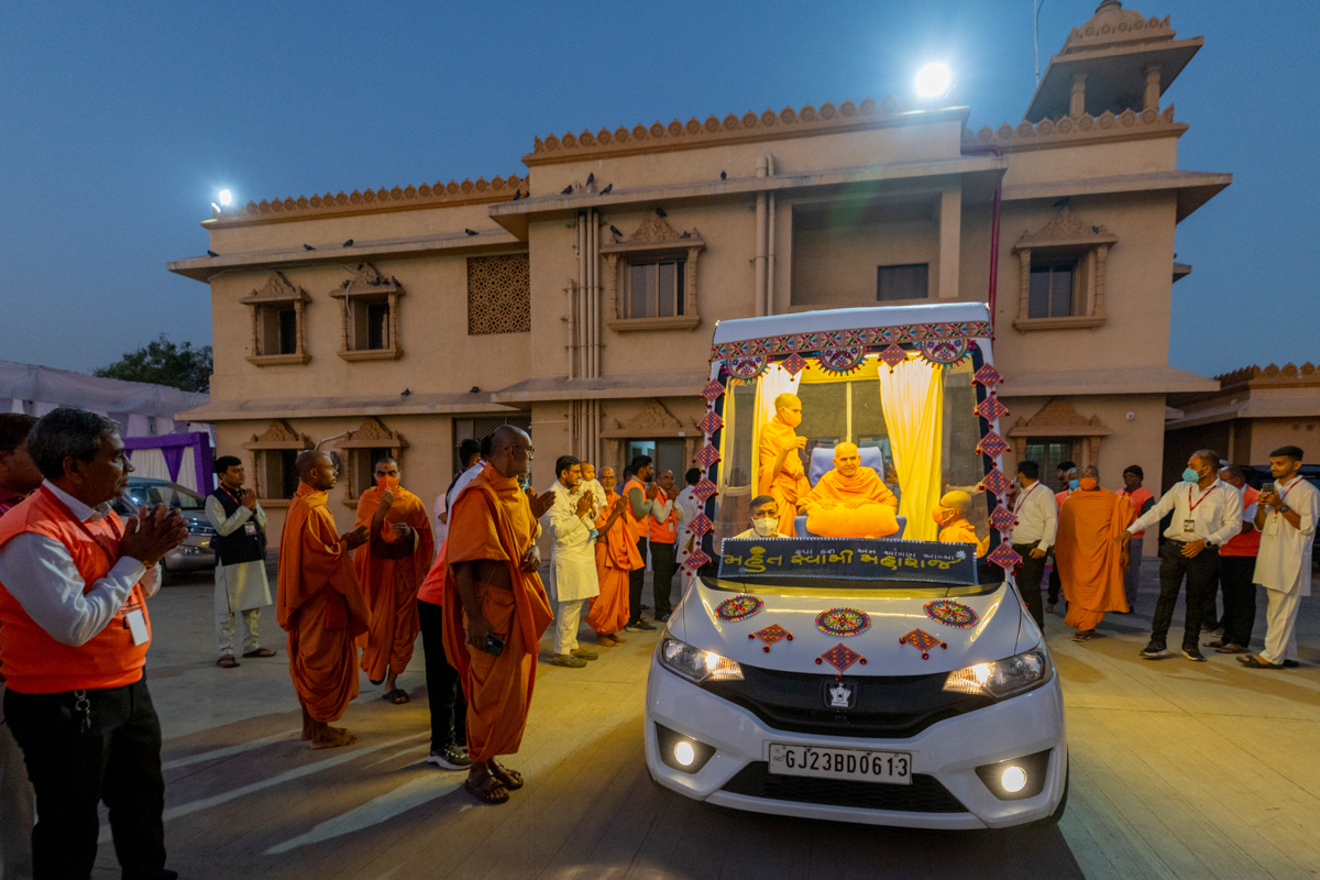 Swamishri on his way for Thakorji's darshan