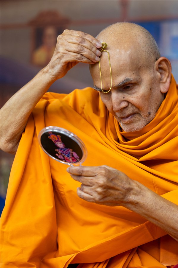 Swamishri applies a tilak on his forehead