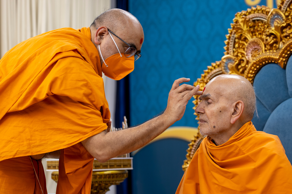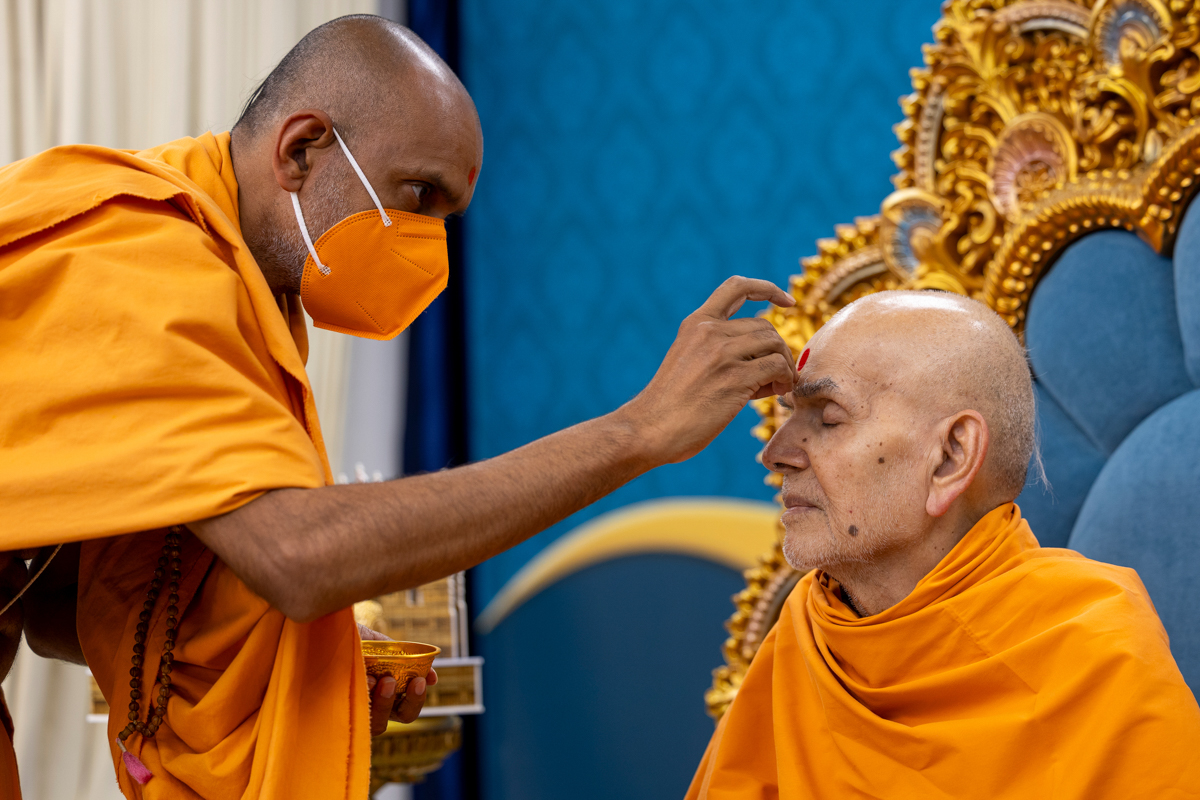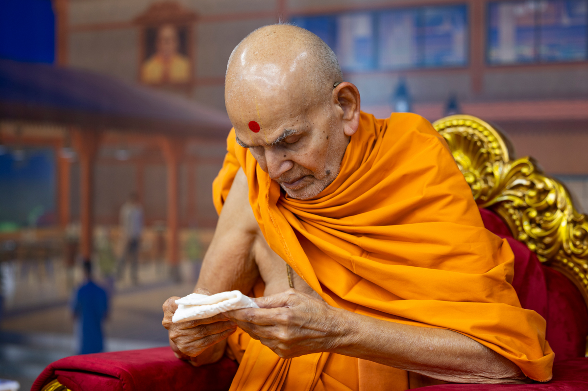 Swamishri clears loose kumkum from his forehead