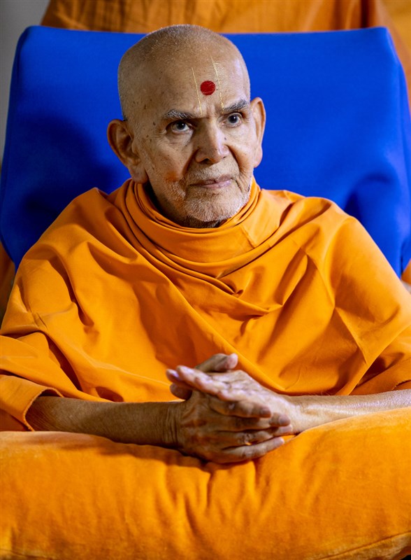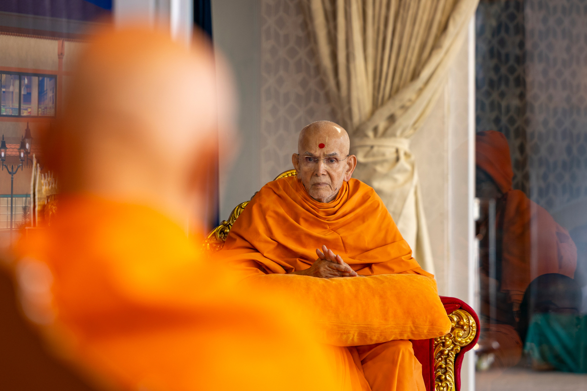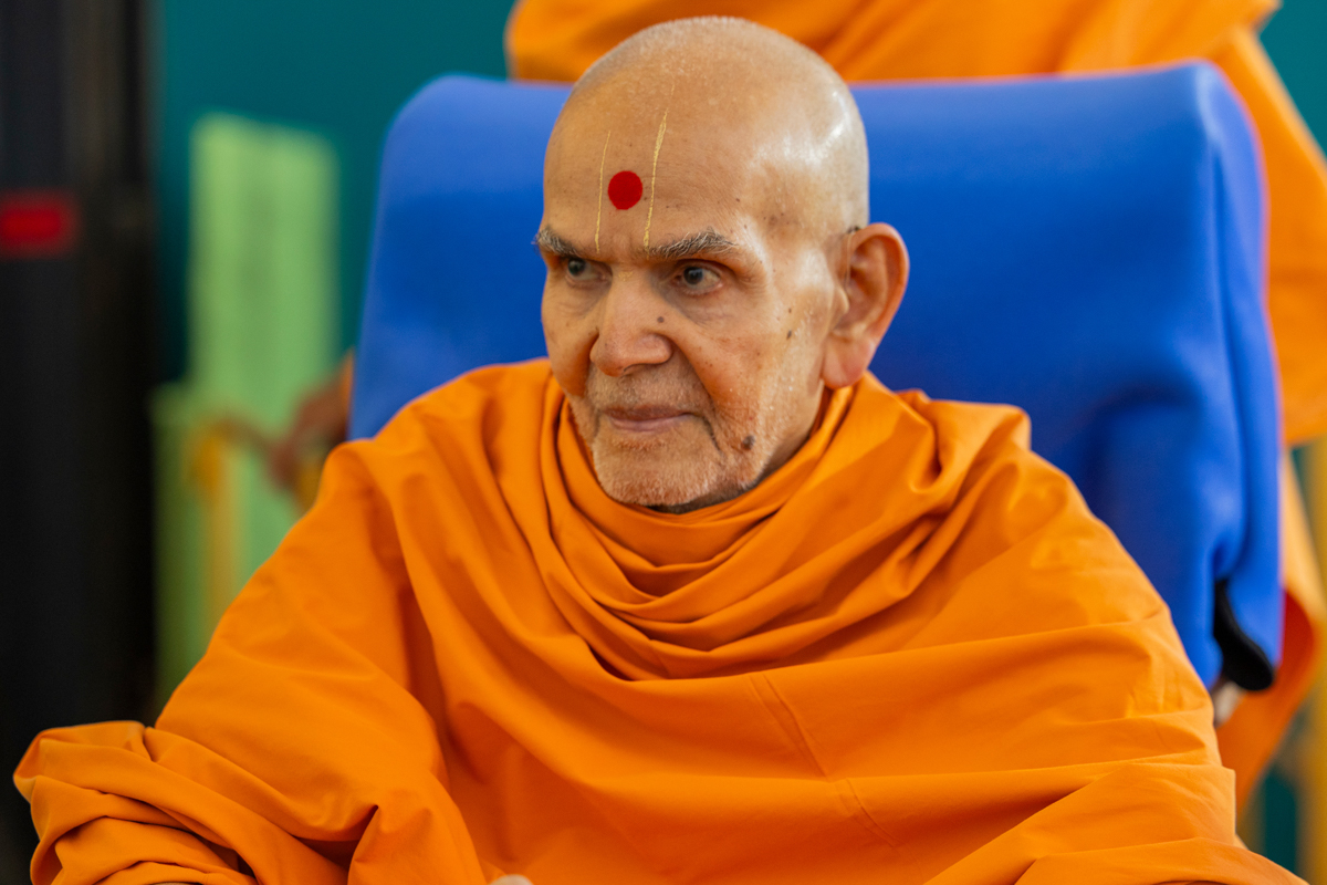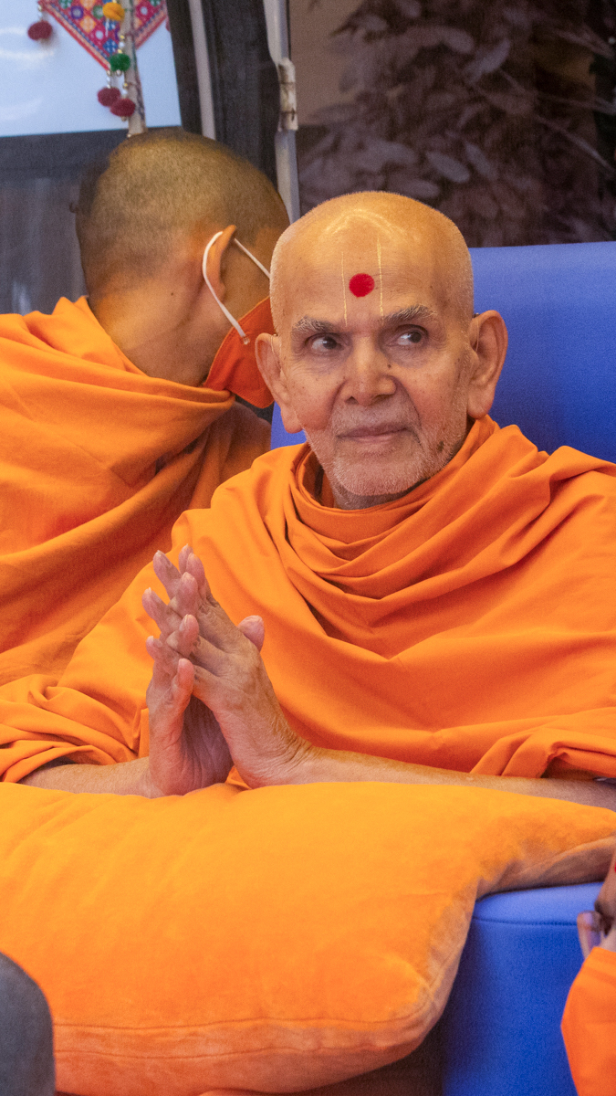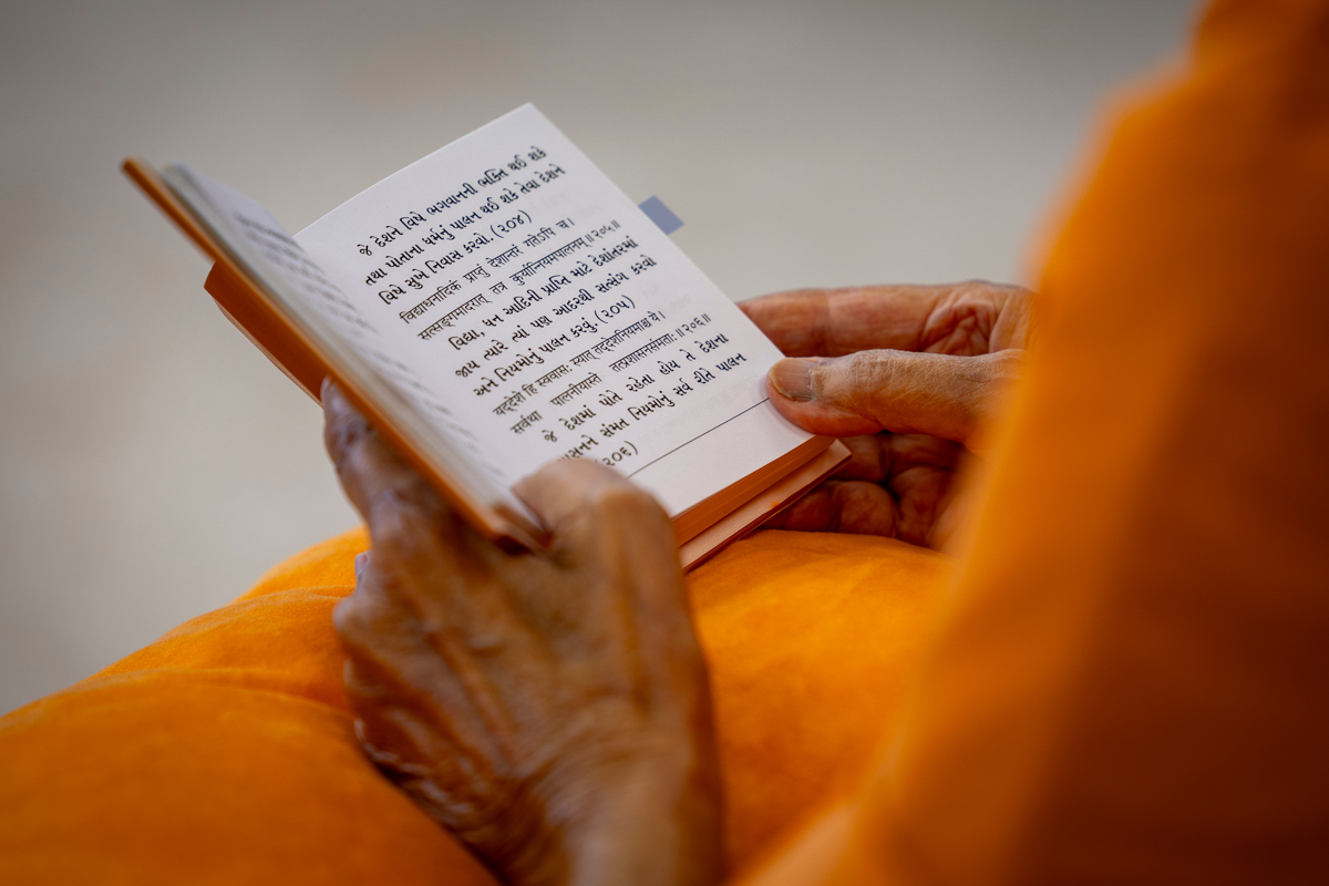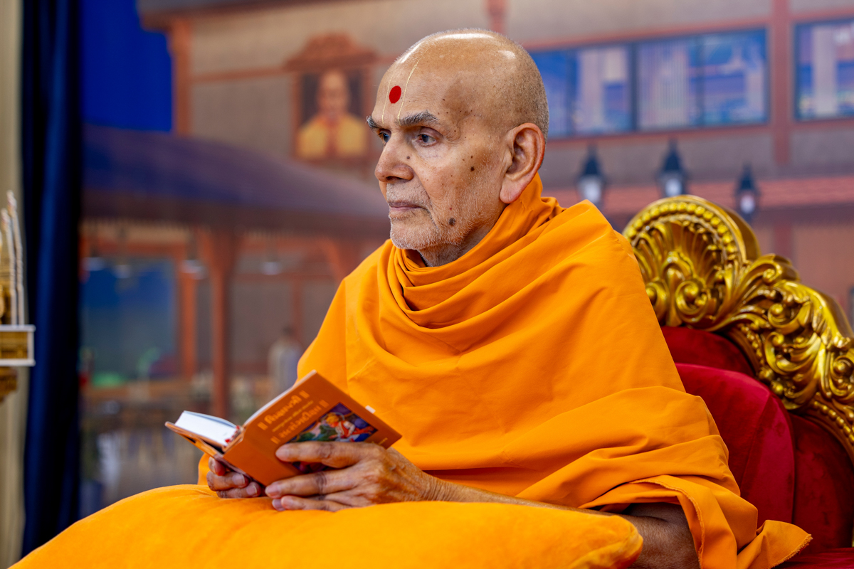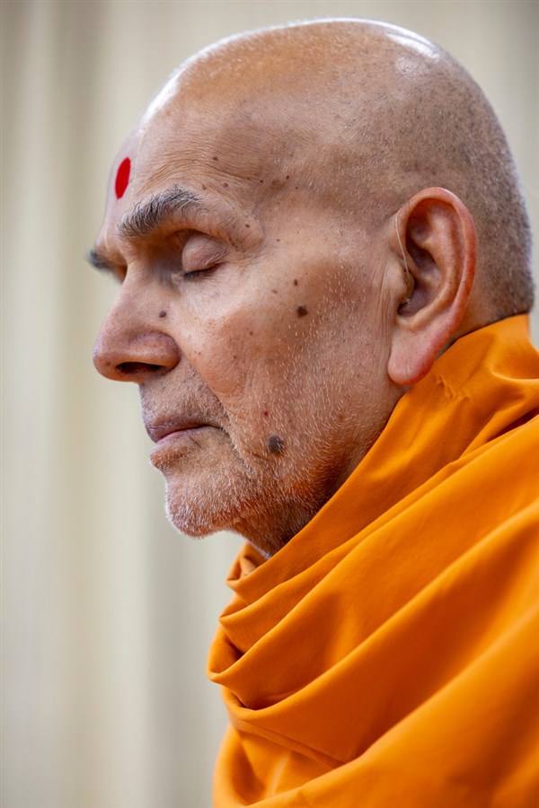 Swamishri listens to the sadhana mantra and daily prayer