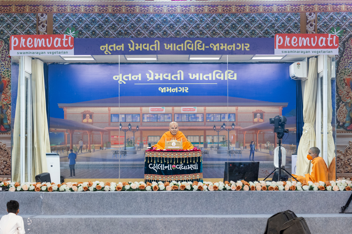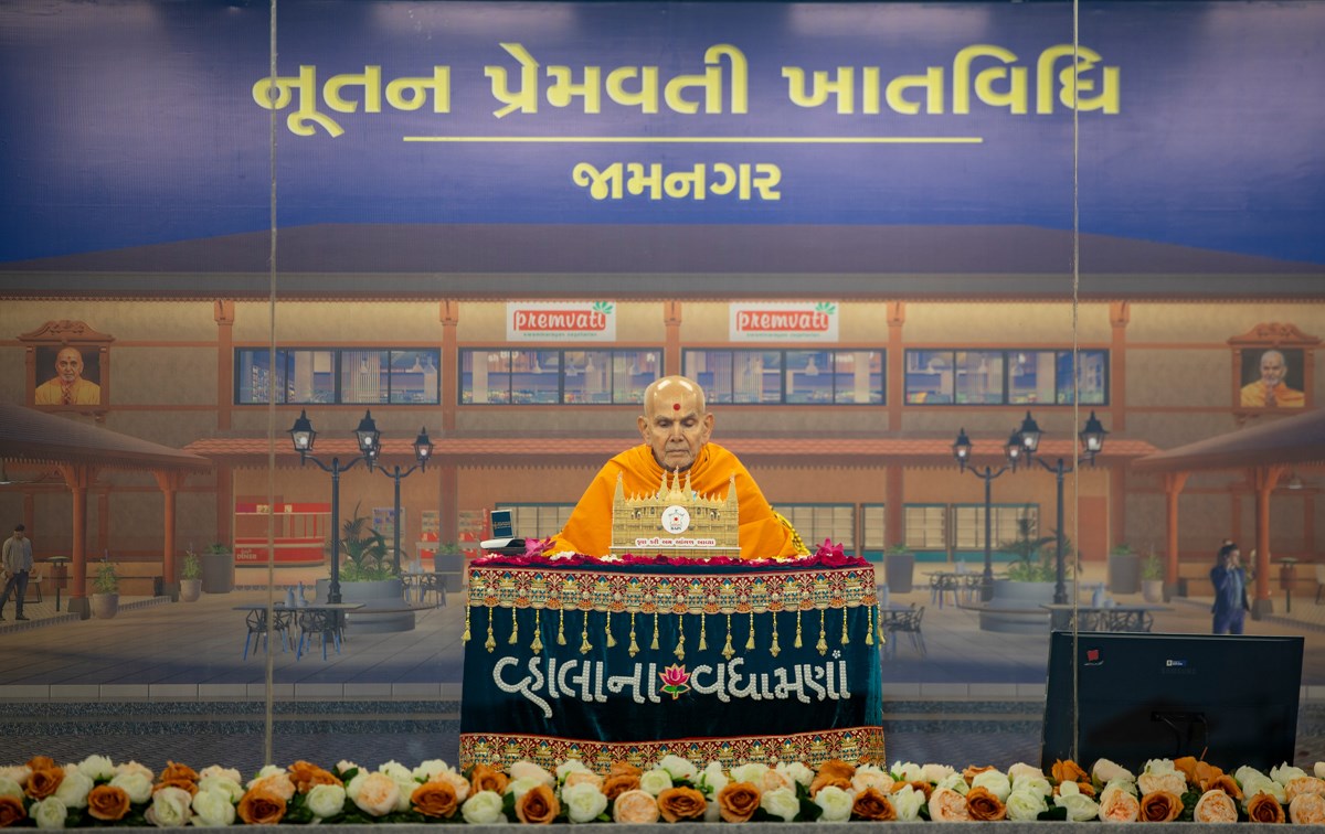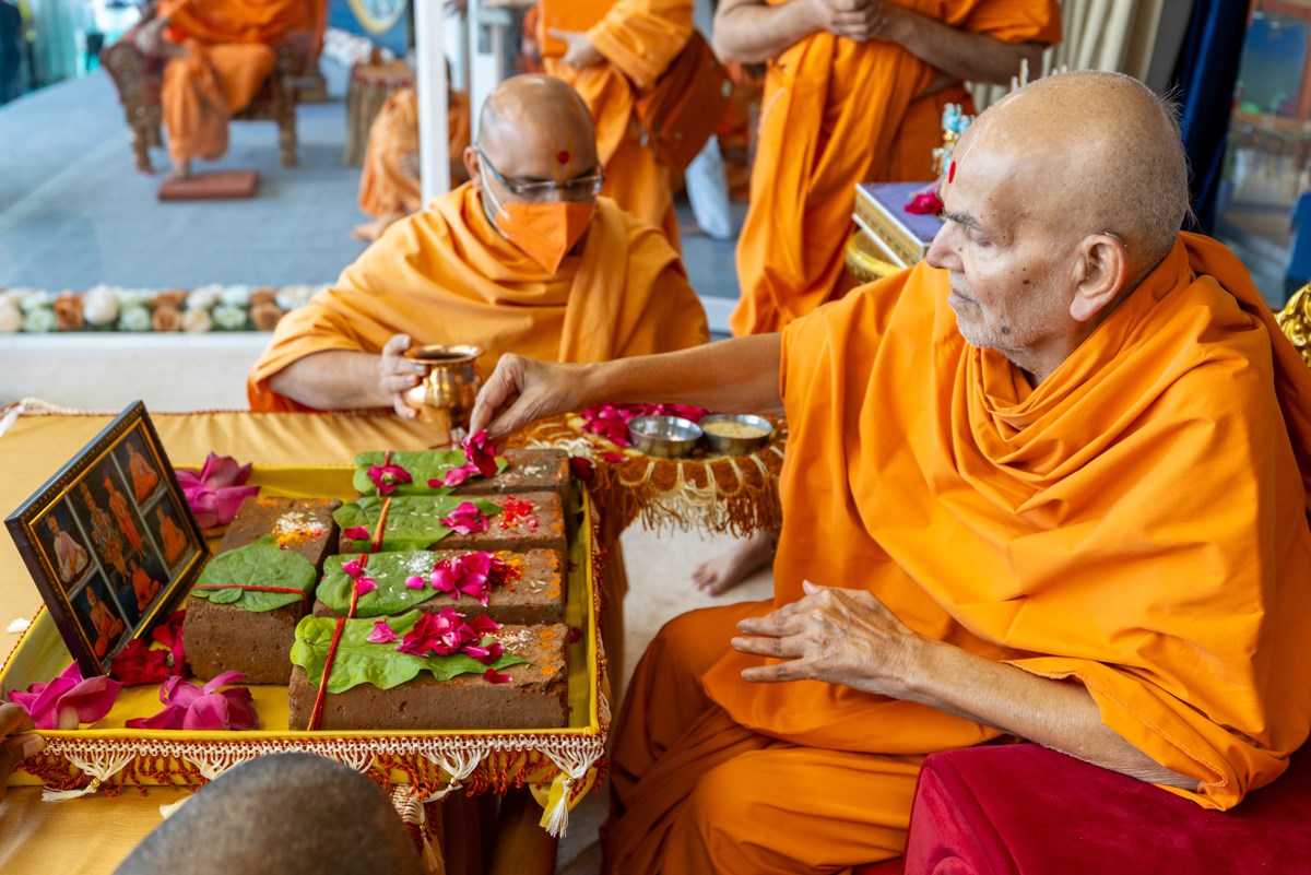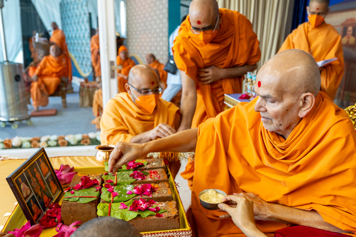 Swamishri sanctifies bricks to start construction of the new Premvati building at BAPS Shri Swaminarayan Mandir, Jamnagar