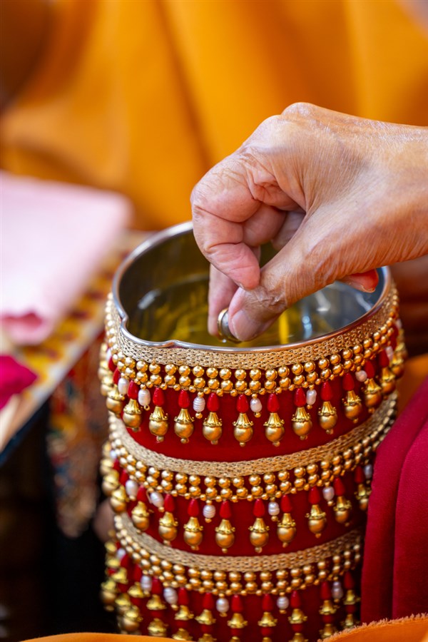 Swamishri sanctifies water with the holy relics of Bhagwan Swaminarayan and the Guru Parampara