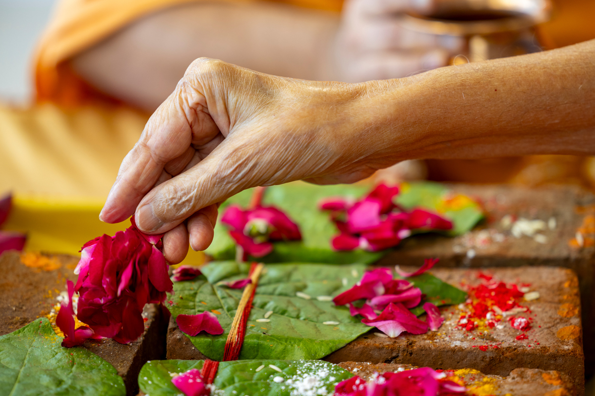 A swami performs pujan of Swamishri