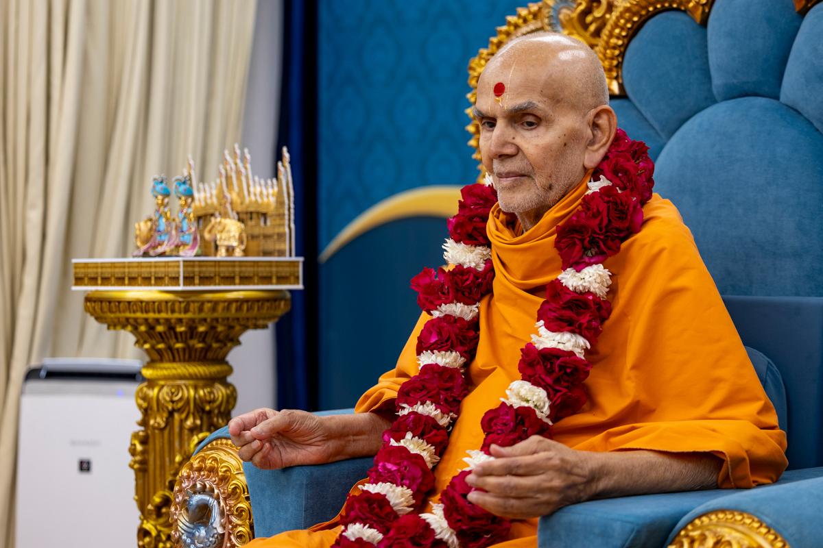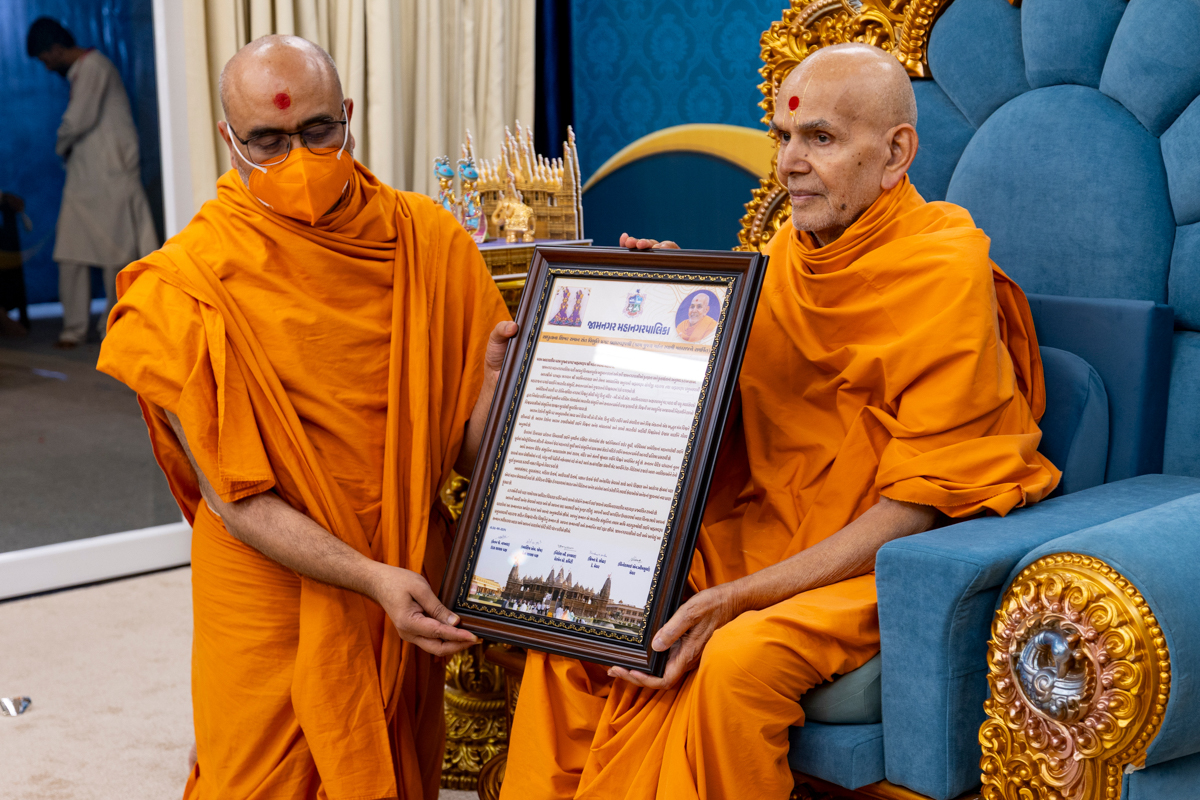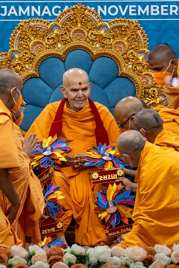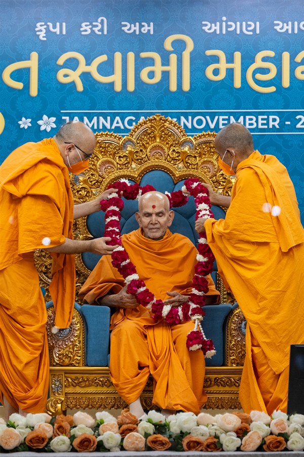 Swamis honor Swamishri with a garland