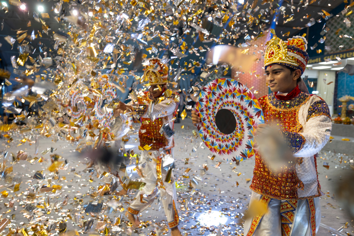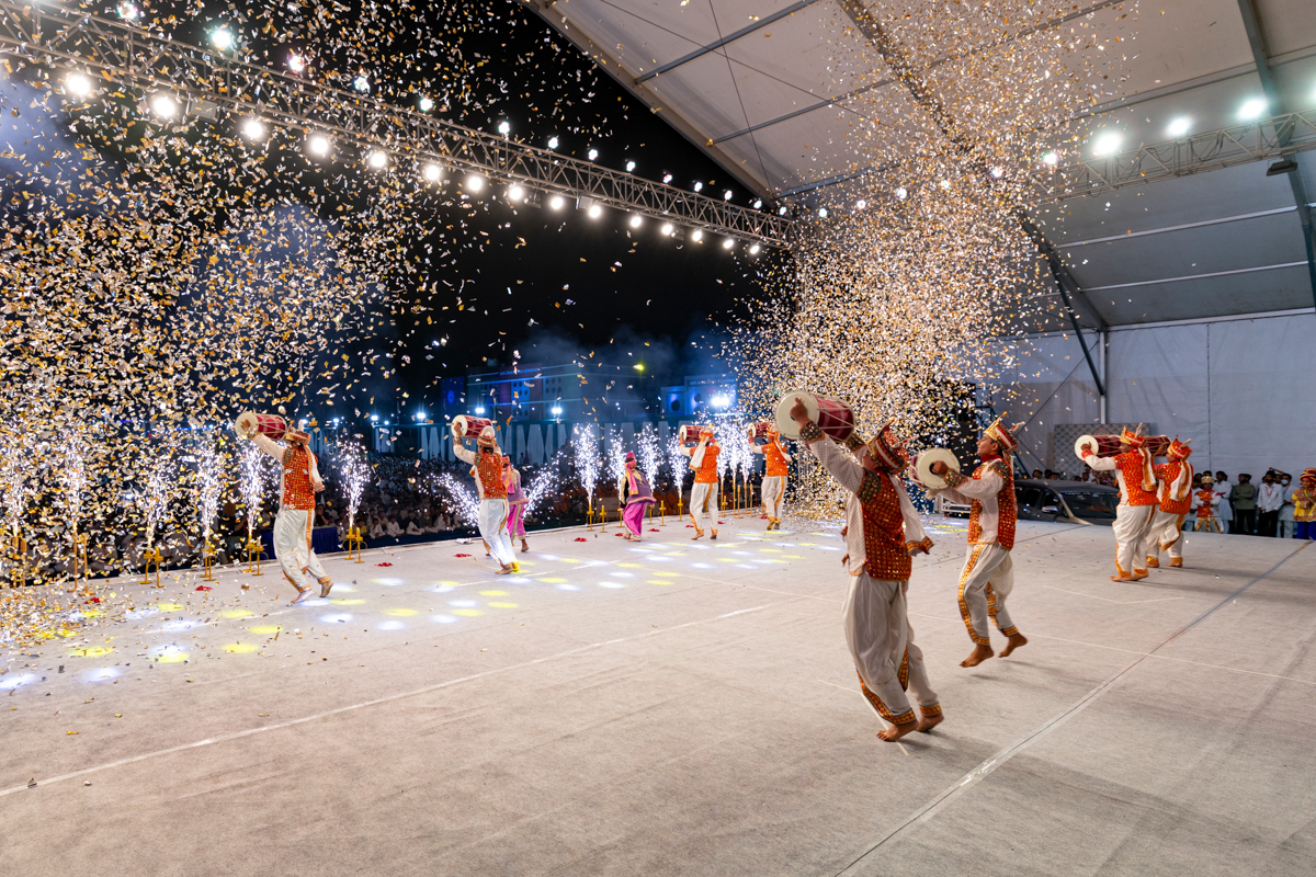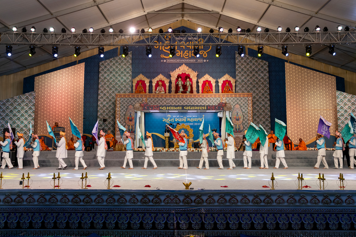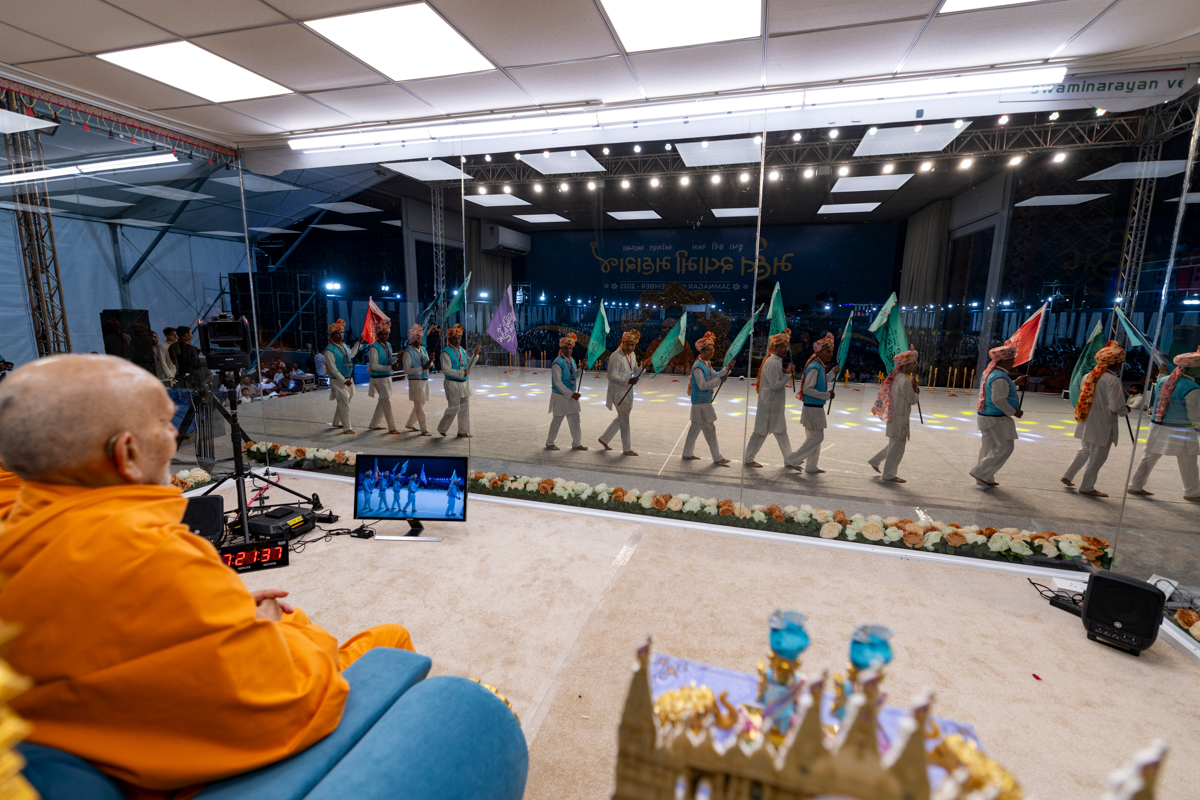 Devotees perform a parade before Swamishri