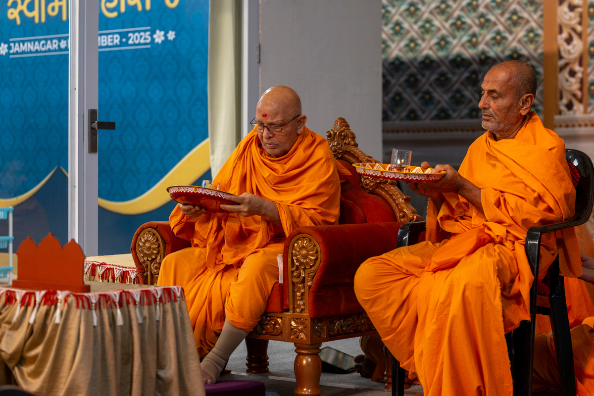 Pujya Ghanshyamcharan Swami and Dharmakuvar Swami perform the arti