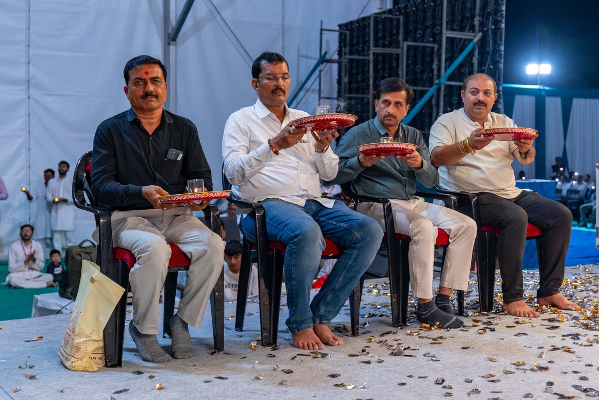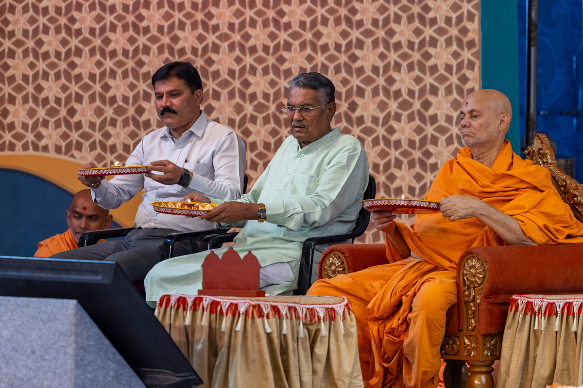 Pujya Viveksagar Swami and dignitaries perform the arti