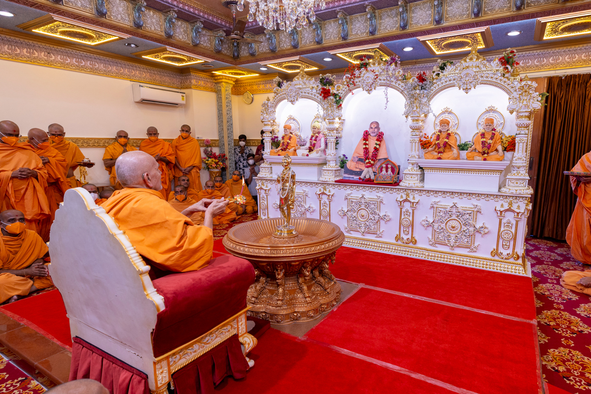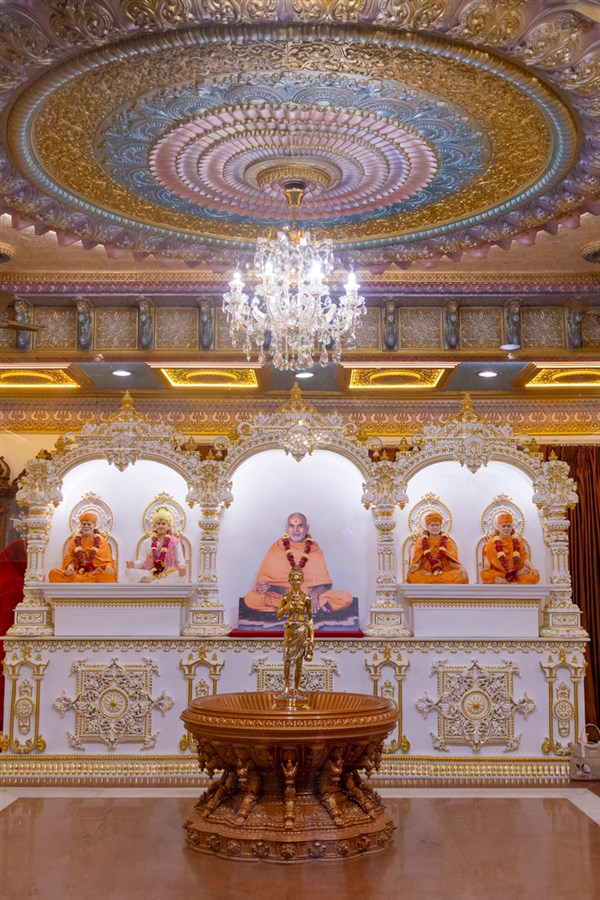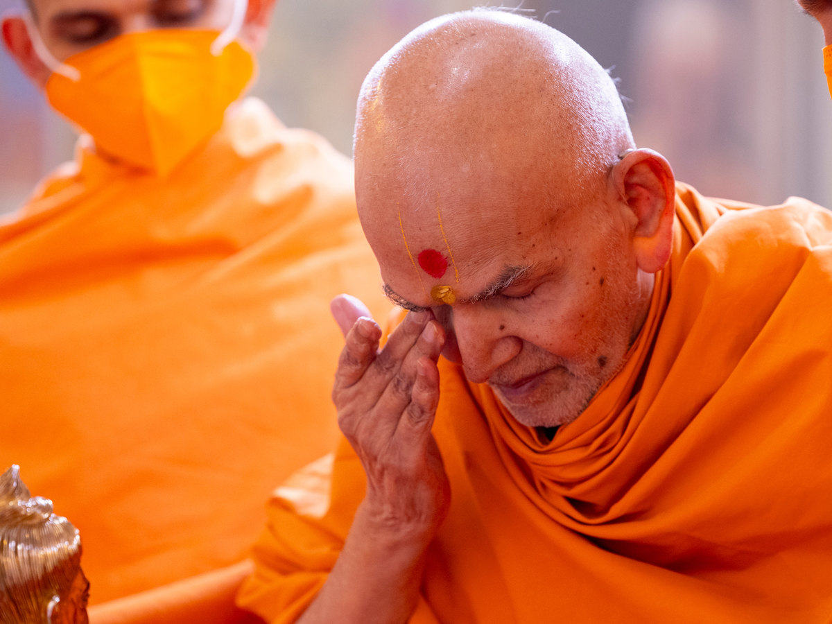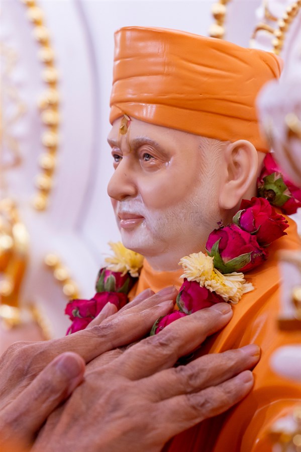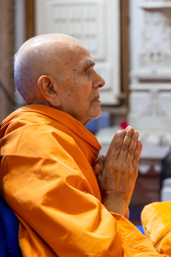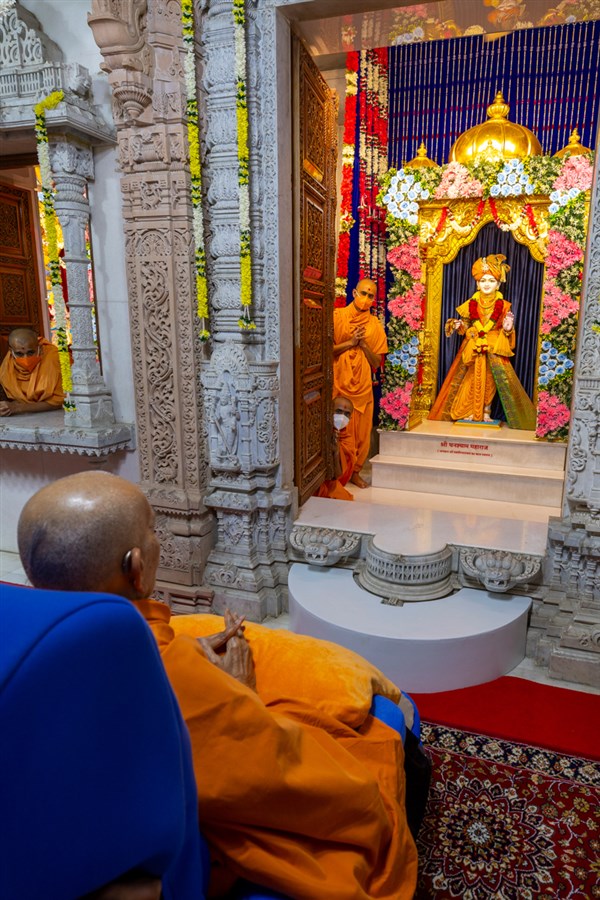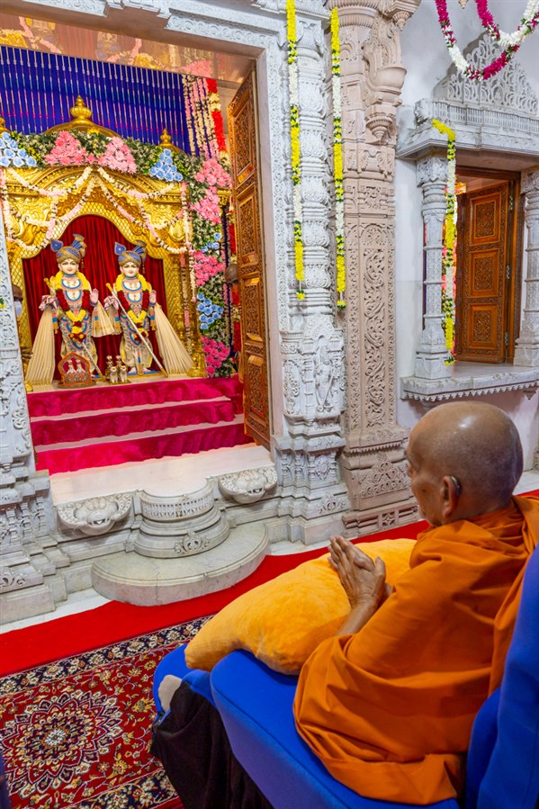 Swamishri engrossed in darshan of Bhagwan Swaminarayan and Aksharbrahma Gunatitanand Swami Maharaj