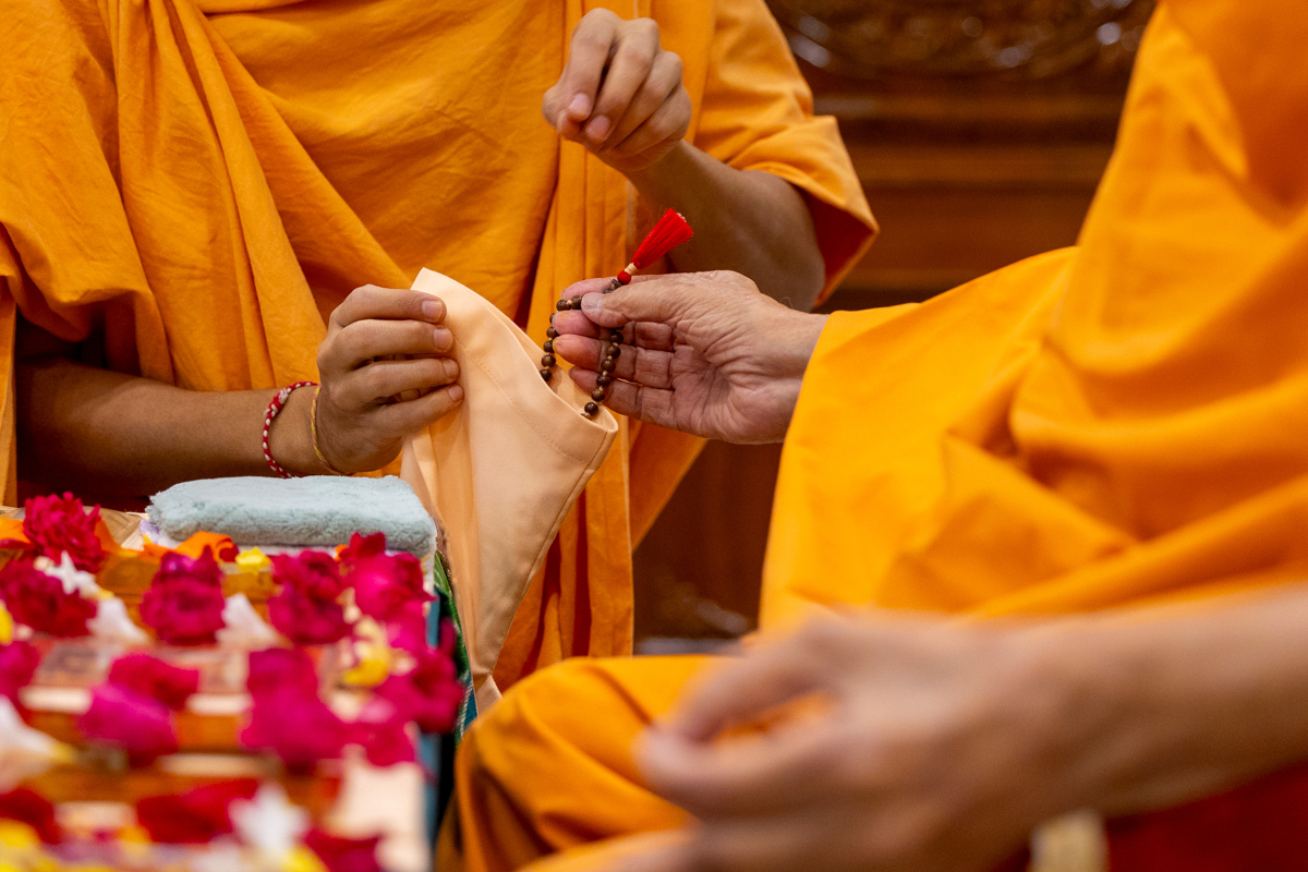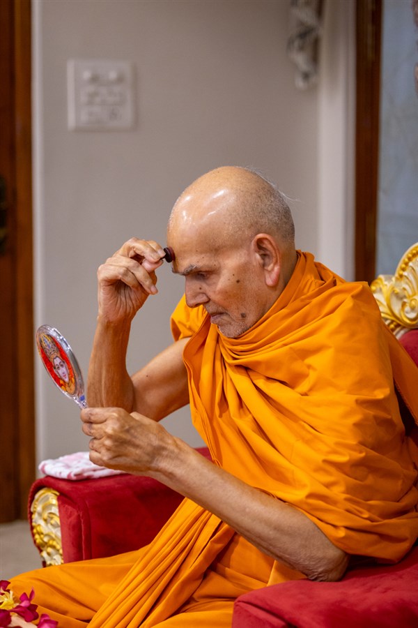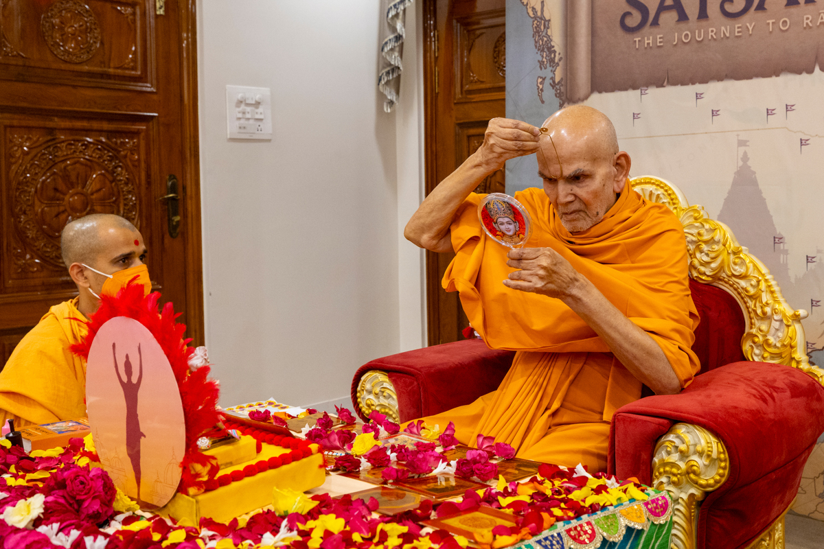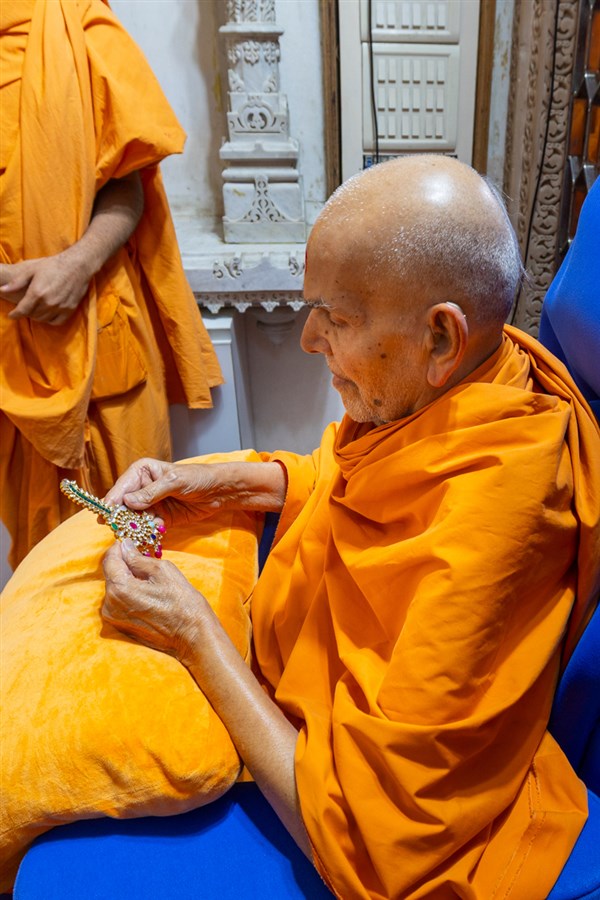 Swamishri observes an ornament of Shri Ghanshyam Maharaj
