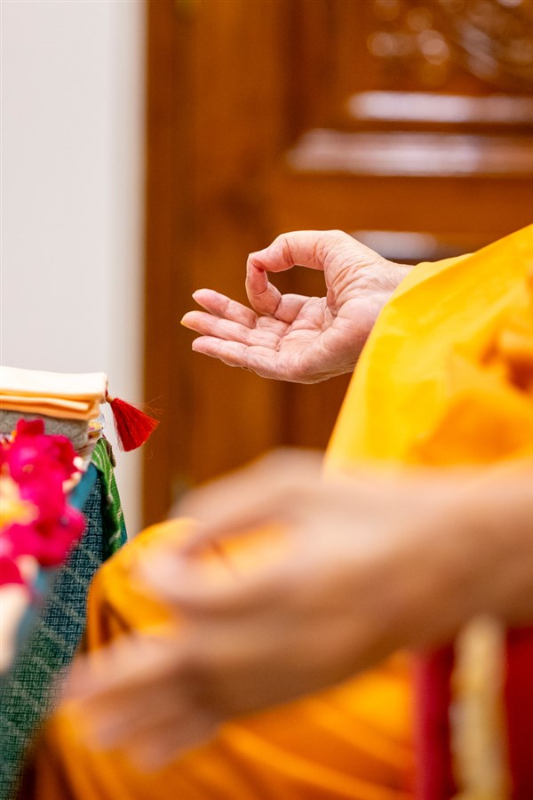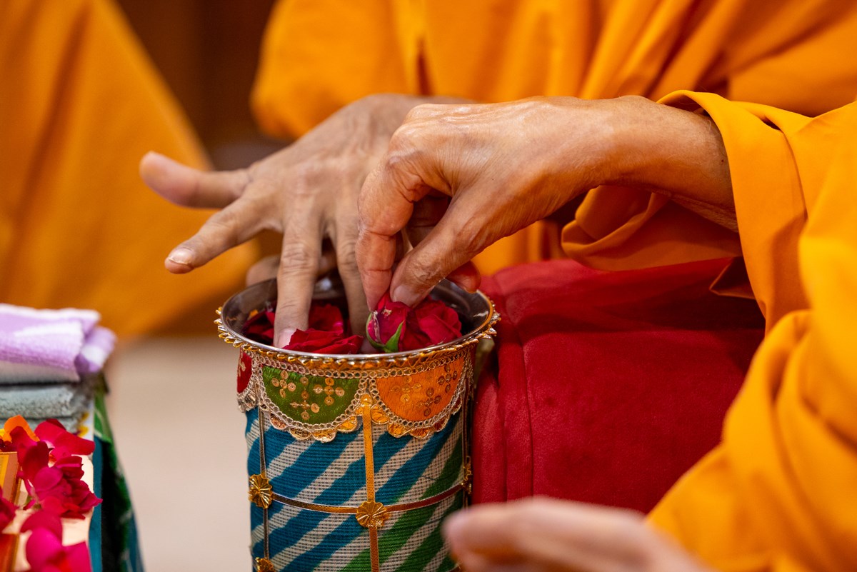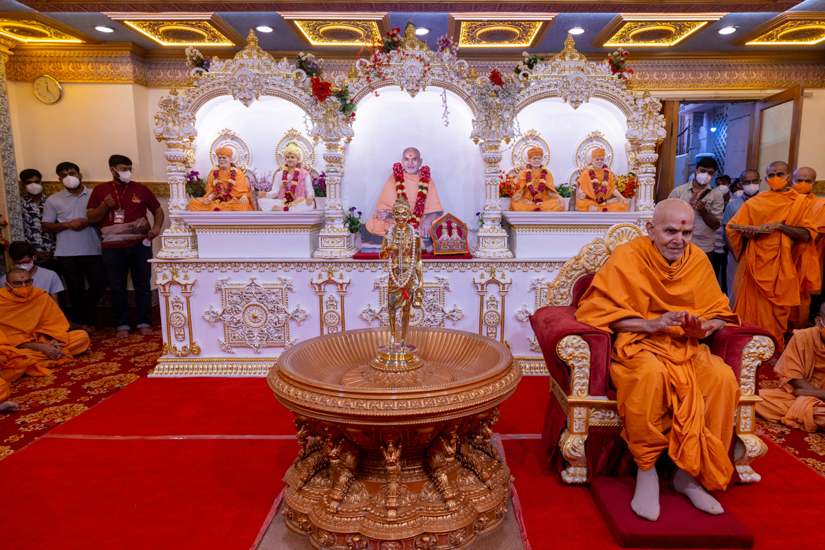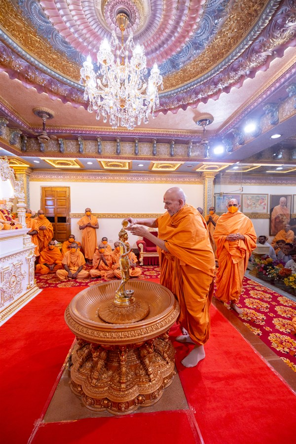 Swamishri sanctifies water with the holy relics of Bhagwan Swaminarayan and the Guru Parampara