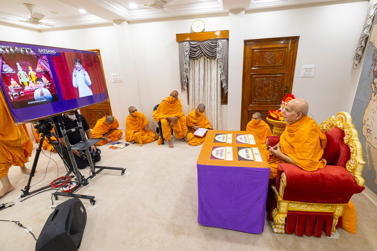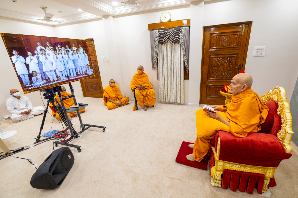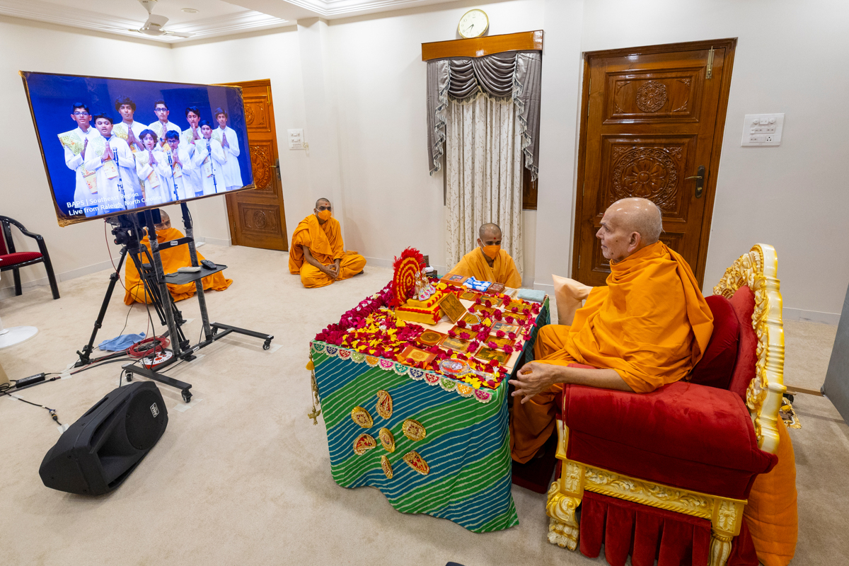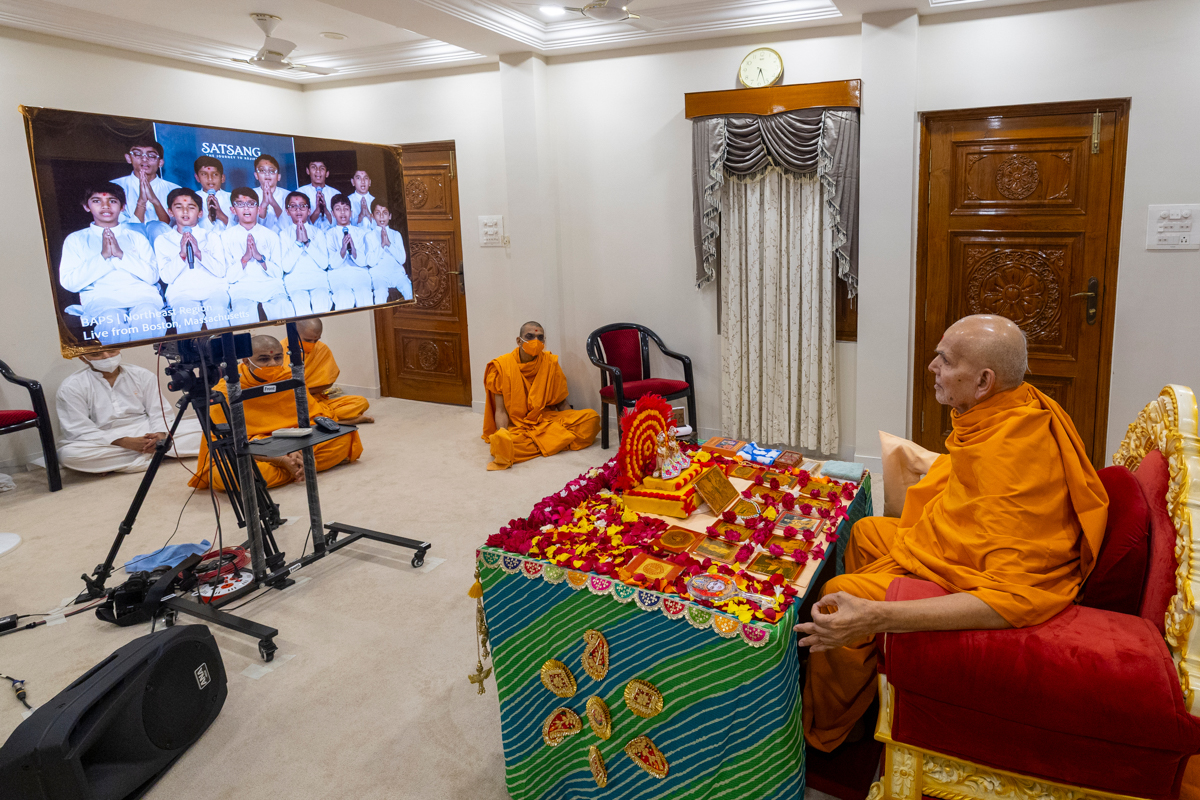 Children from Boston, USA, sing kirtans in Swamishri's daily puja via video conference