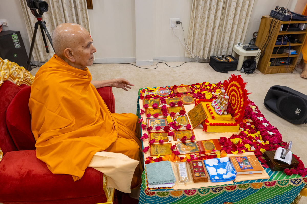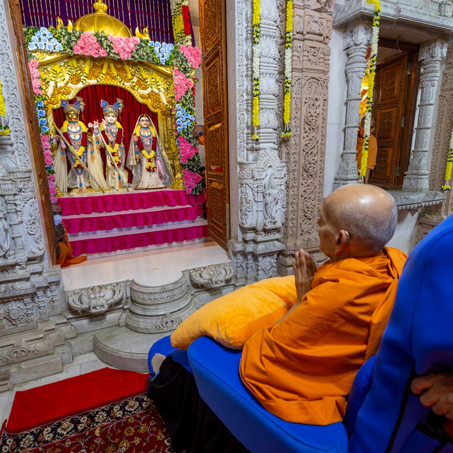 Swamishri engrossed in darshan of Shri Harikrishna Maharaj, Bhagwan Shri Govind Devji and Shri Radhaji