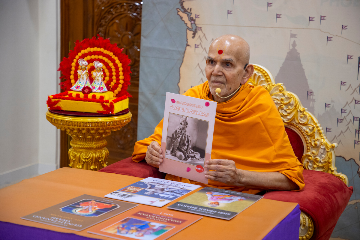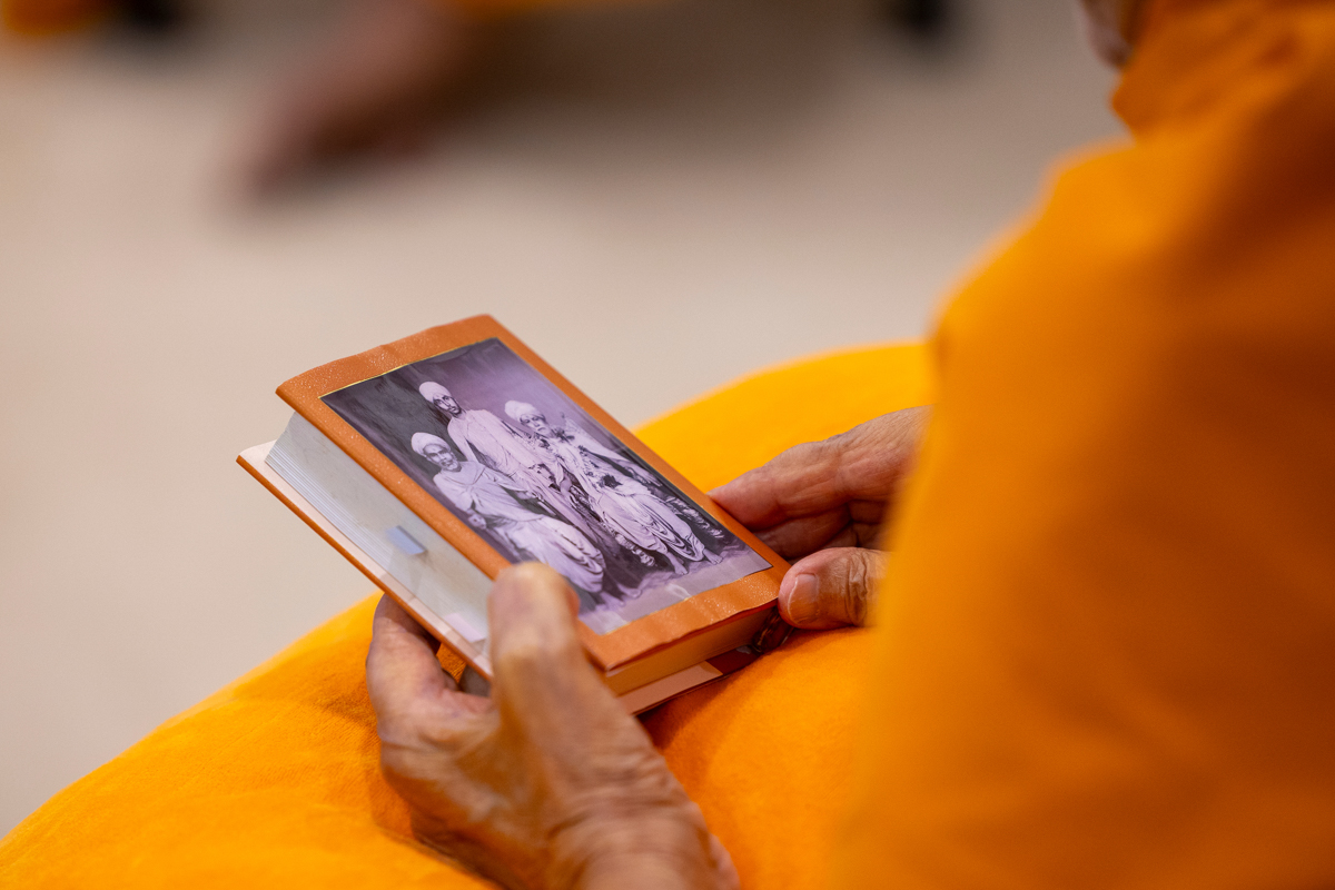 Swamishri engrossed in darshan of Shri Guru Parampara