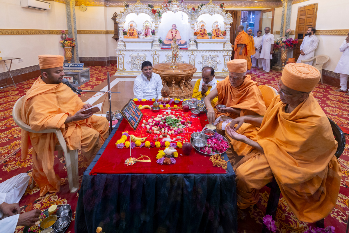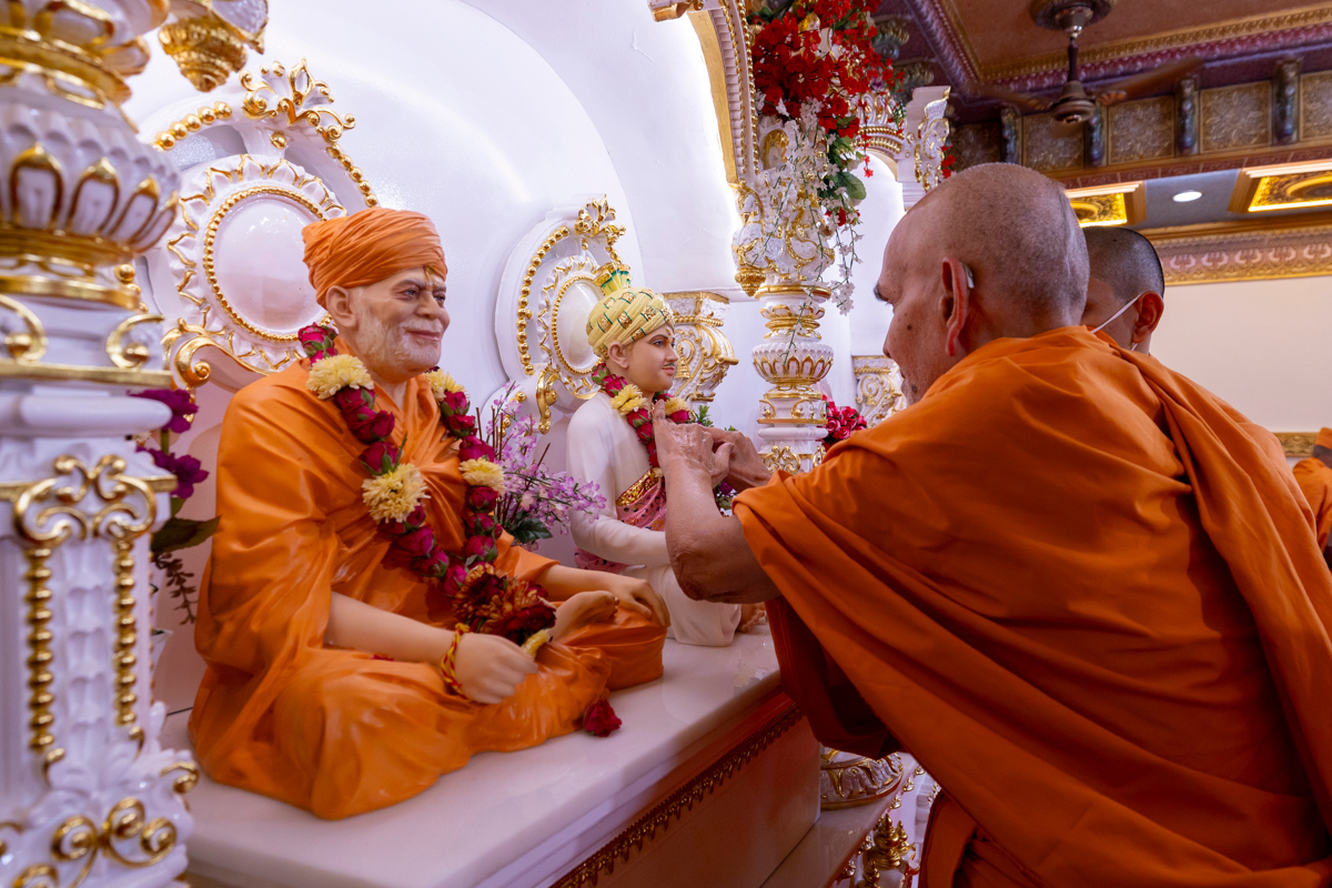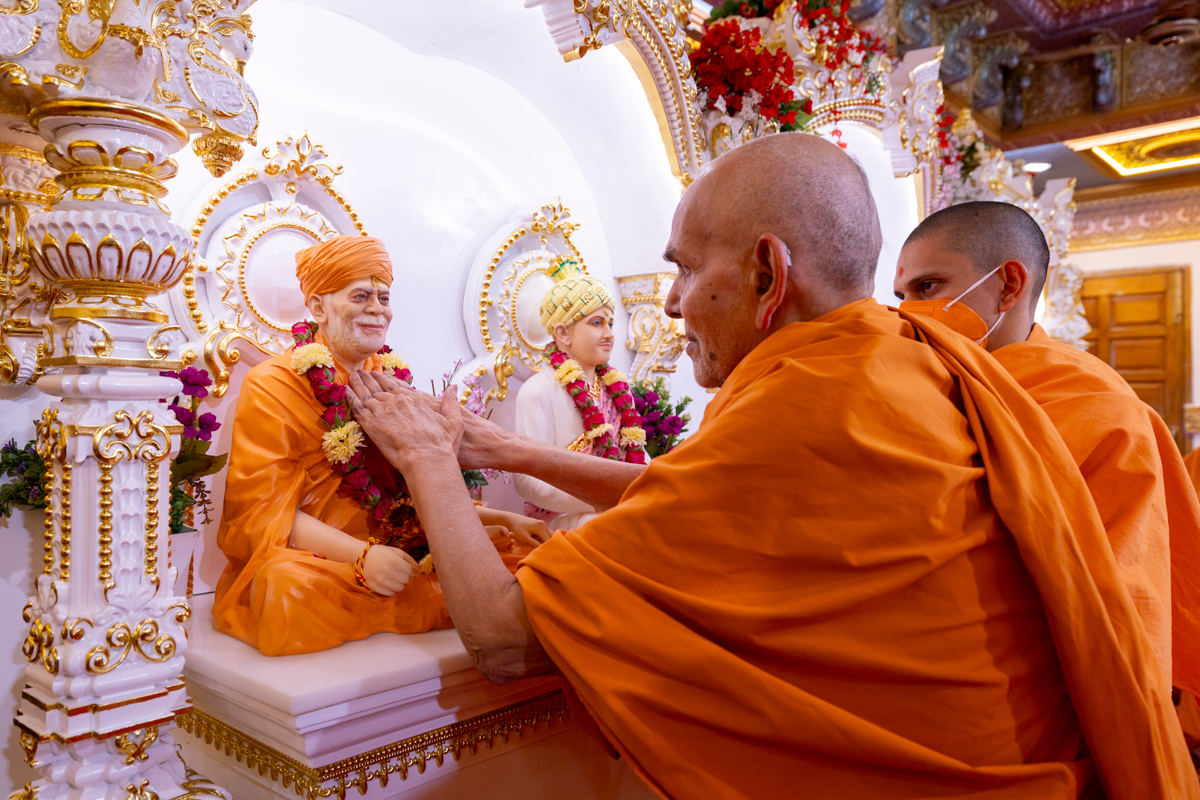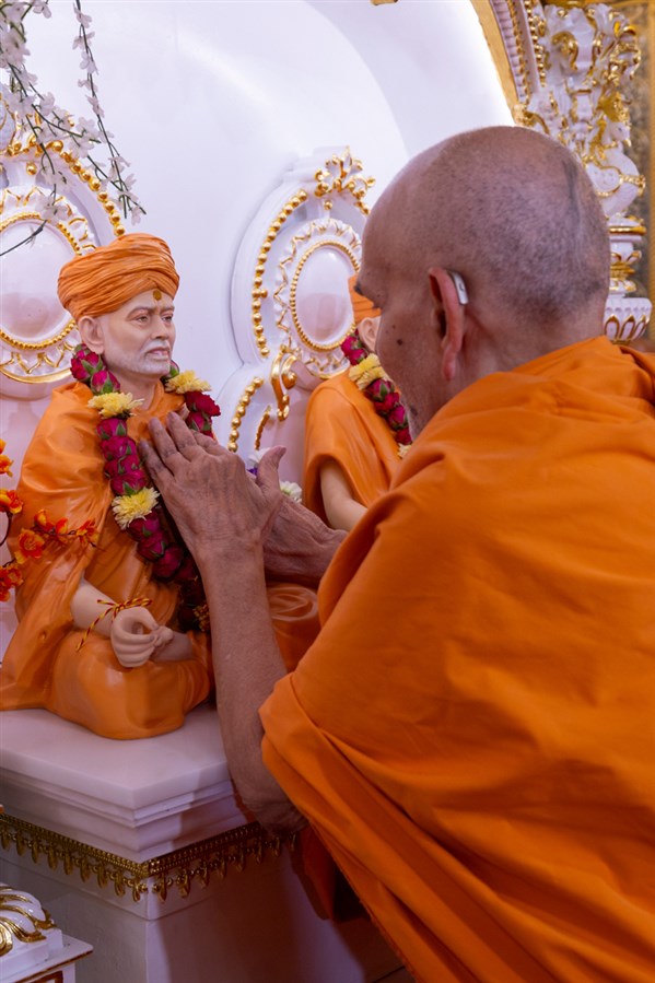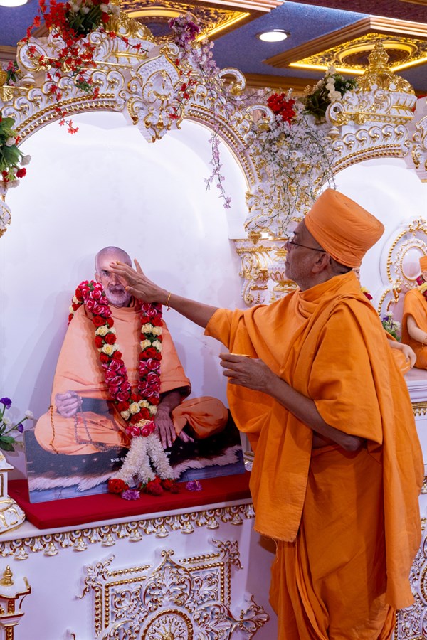 Param Pujya Mahant Swami Maharaj engrossed in darshan of Shri Harikrishna Maharaj and Shri Gunatitanand Swami Maharaj