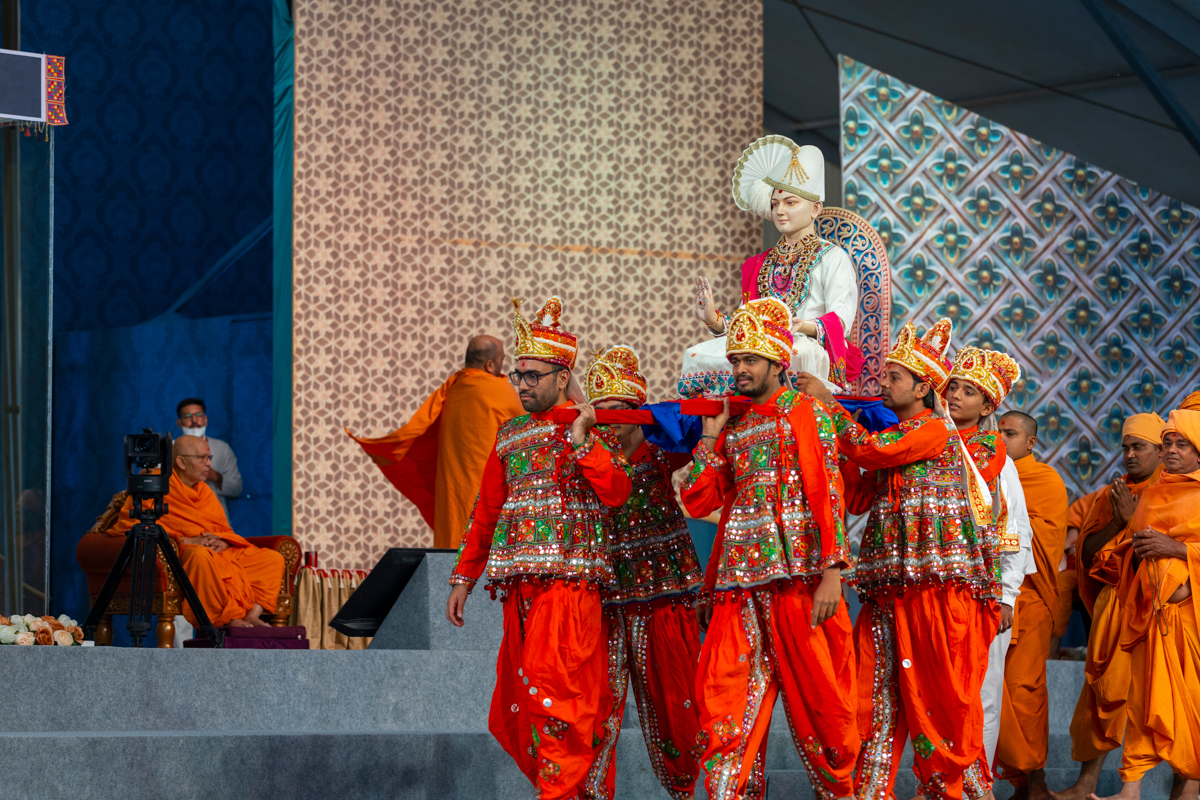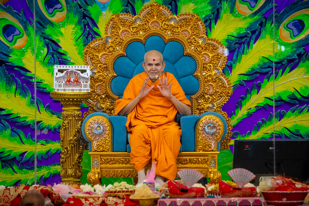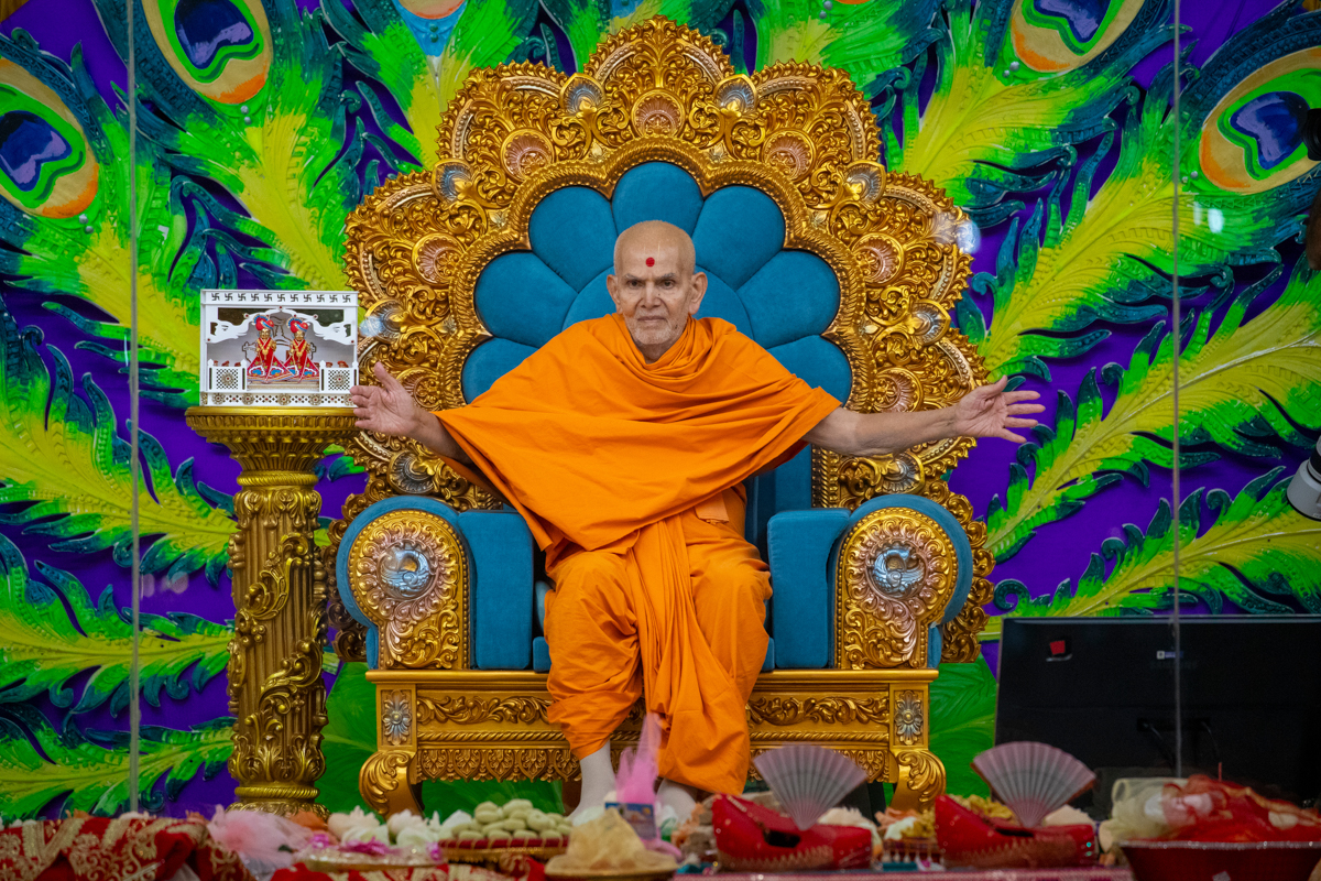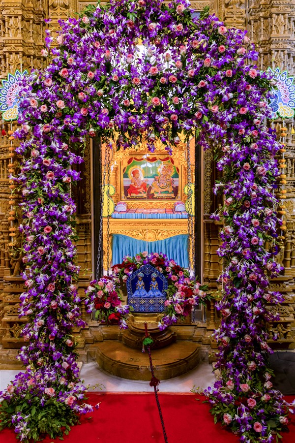 Swamishri swings Shri Akshar-Purushottam Maharaj in a hindolo