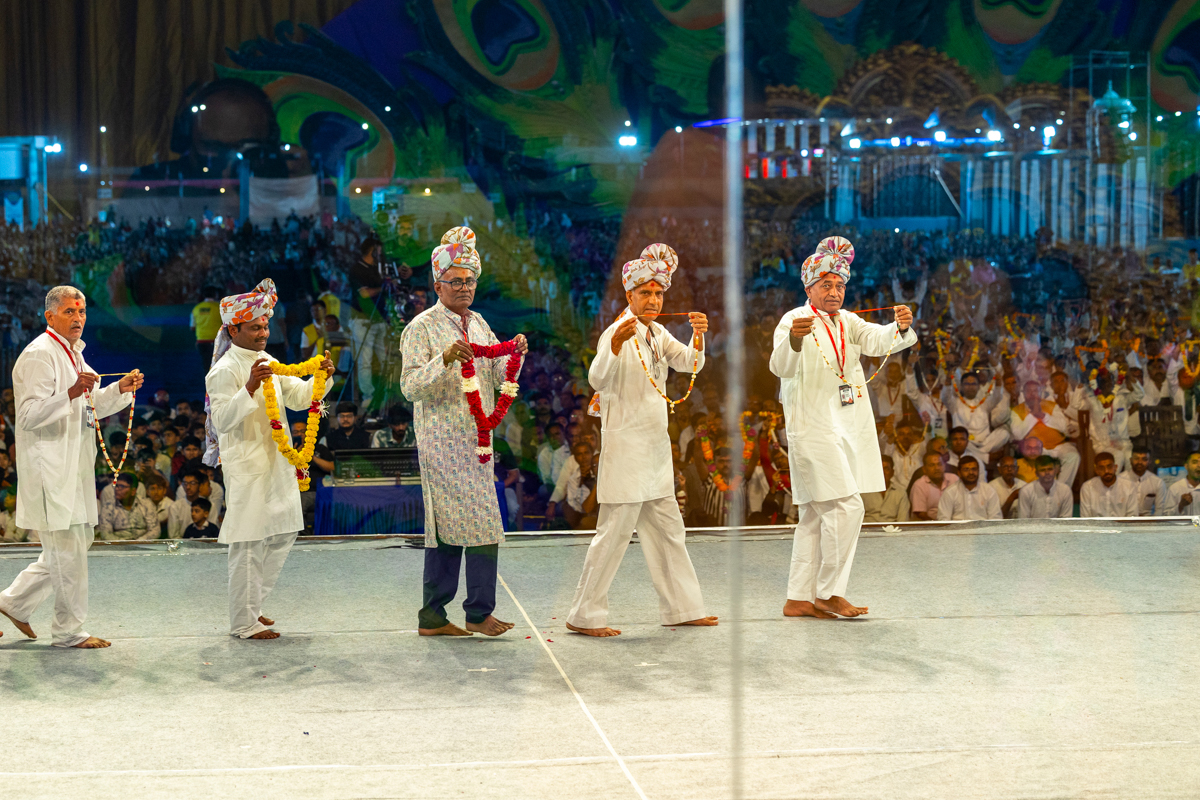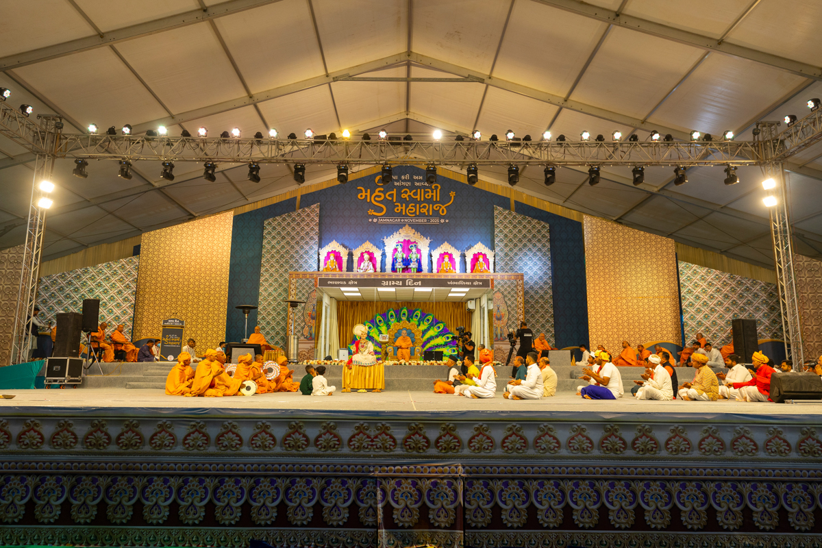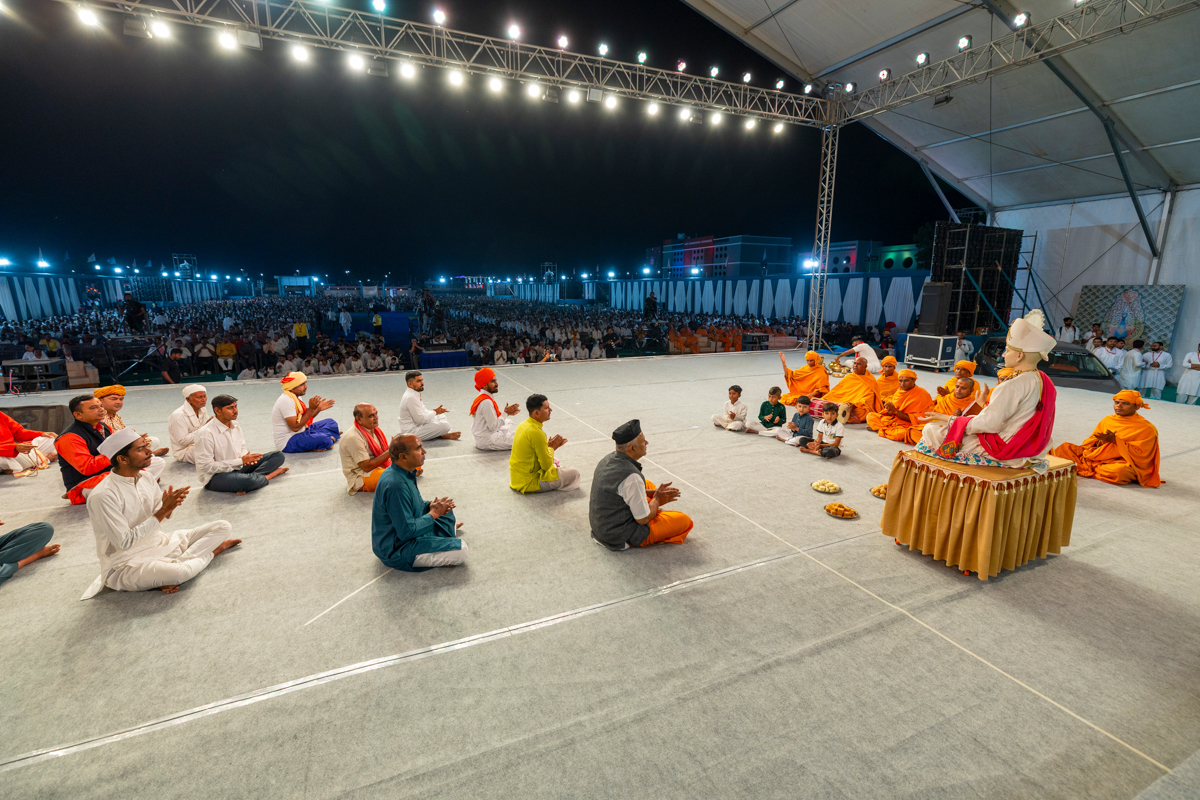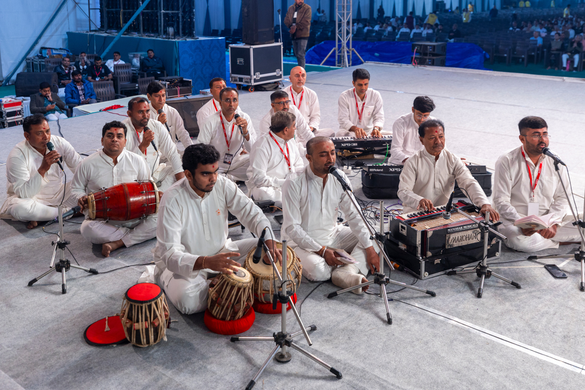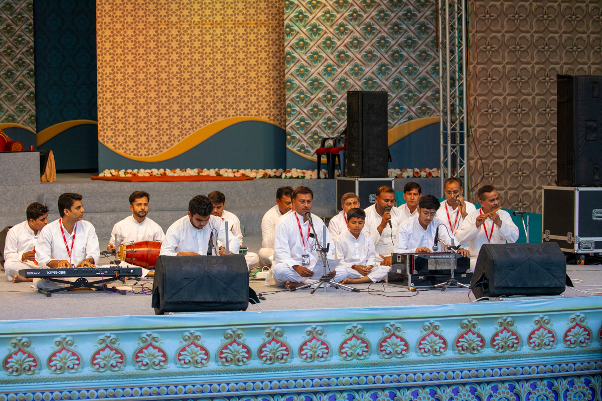 Devotees sing kirtans at the beginning of the evening Gramya Din assembly
