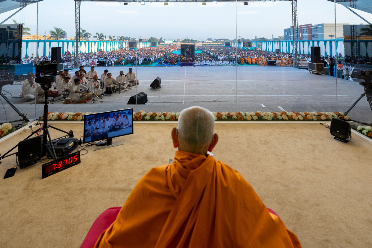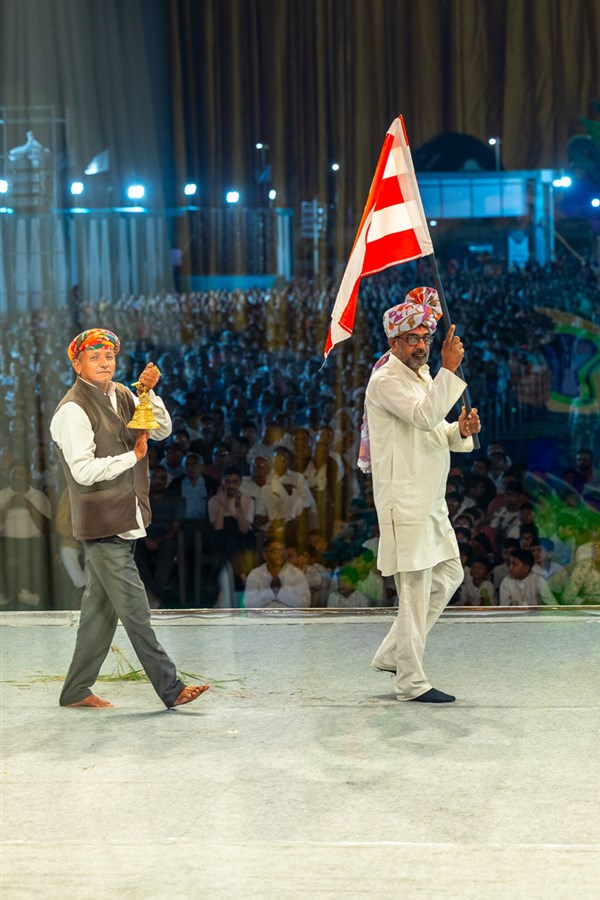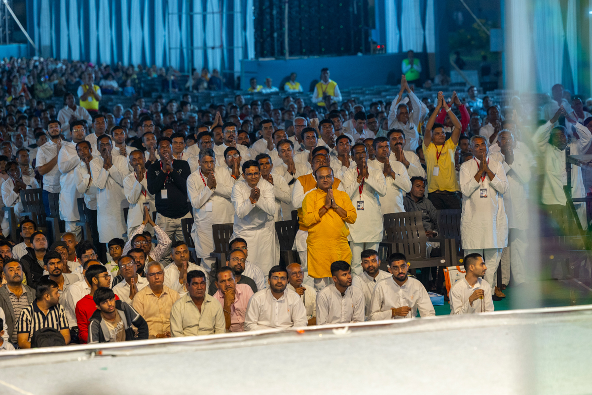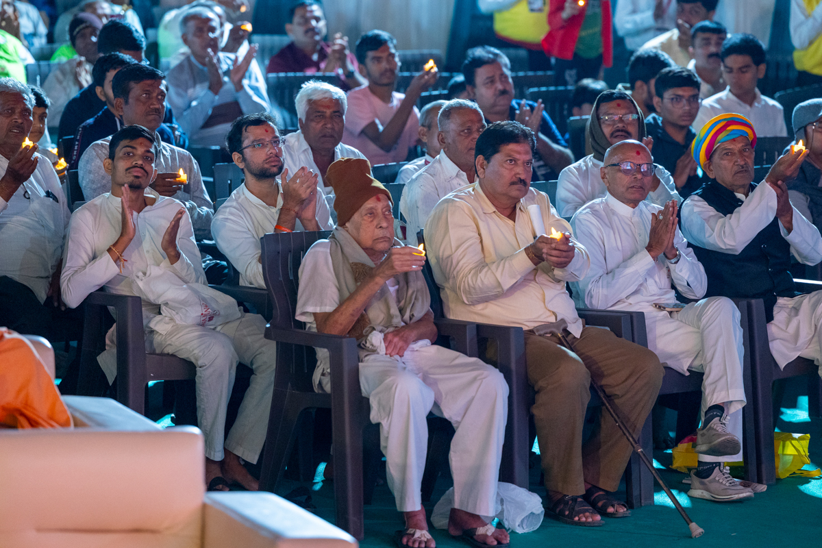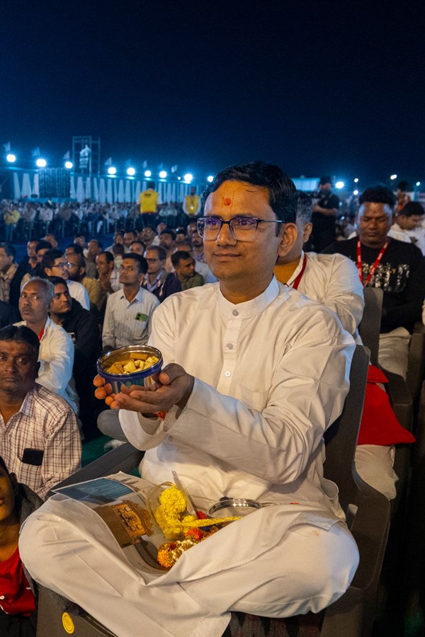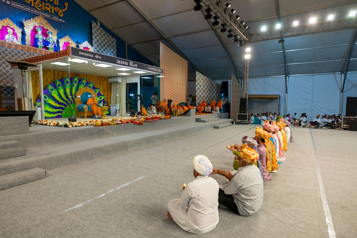 Devotees sing kirtans at the beginning of the evening Gramya Din assembly