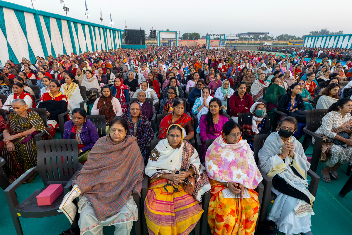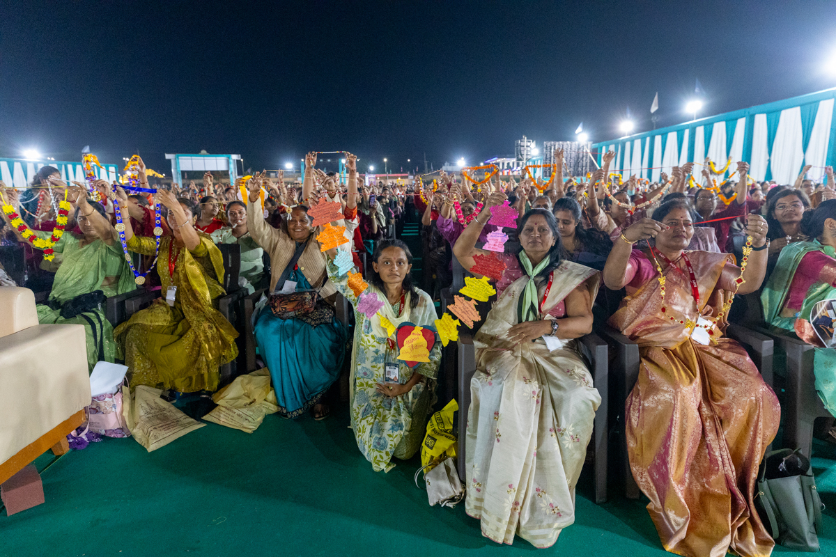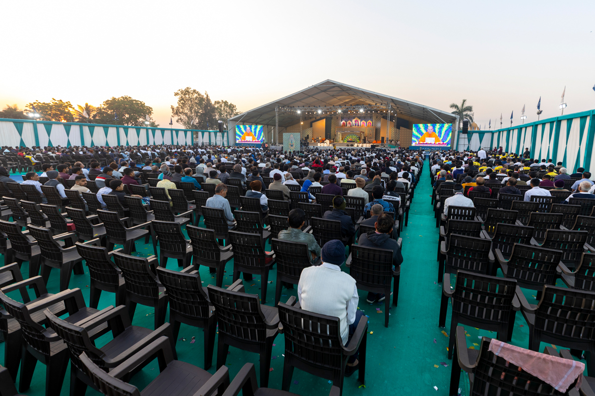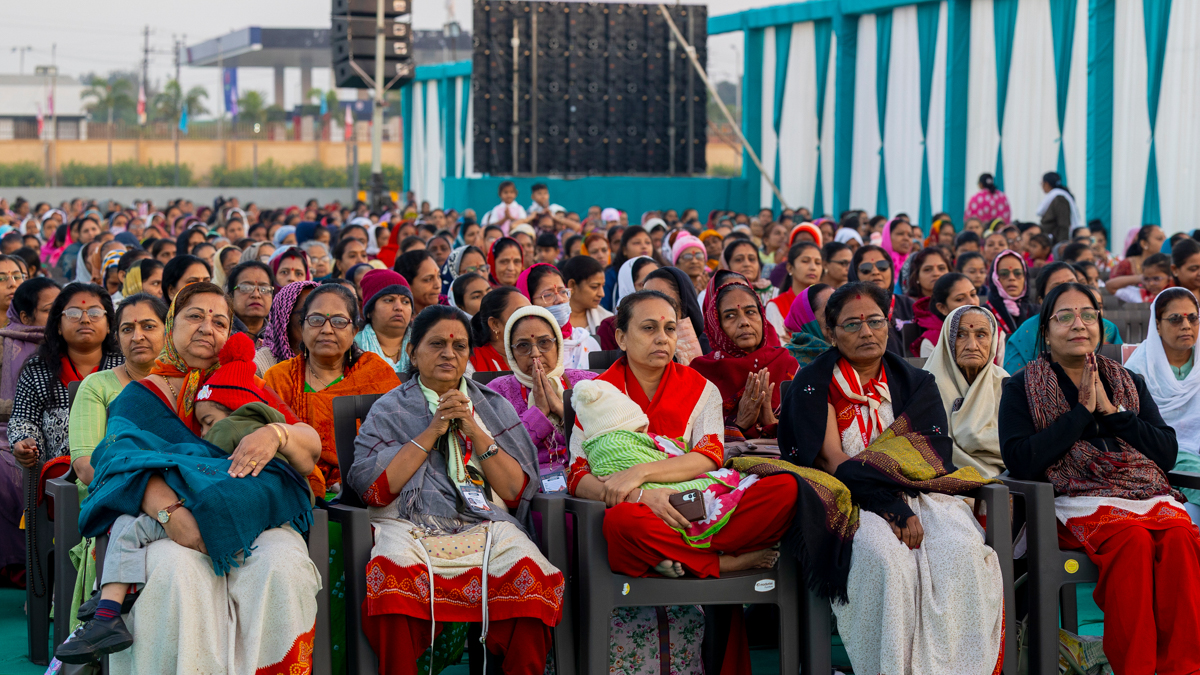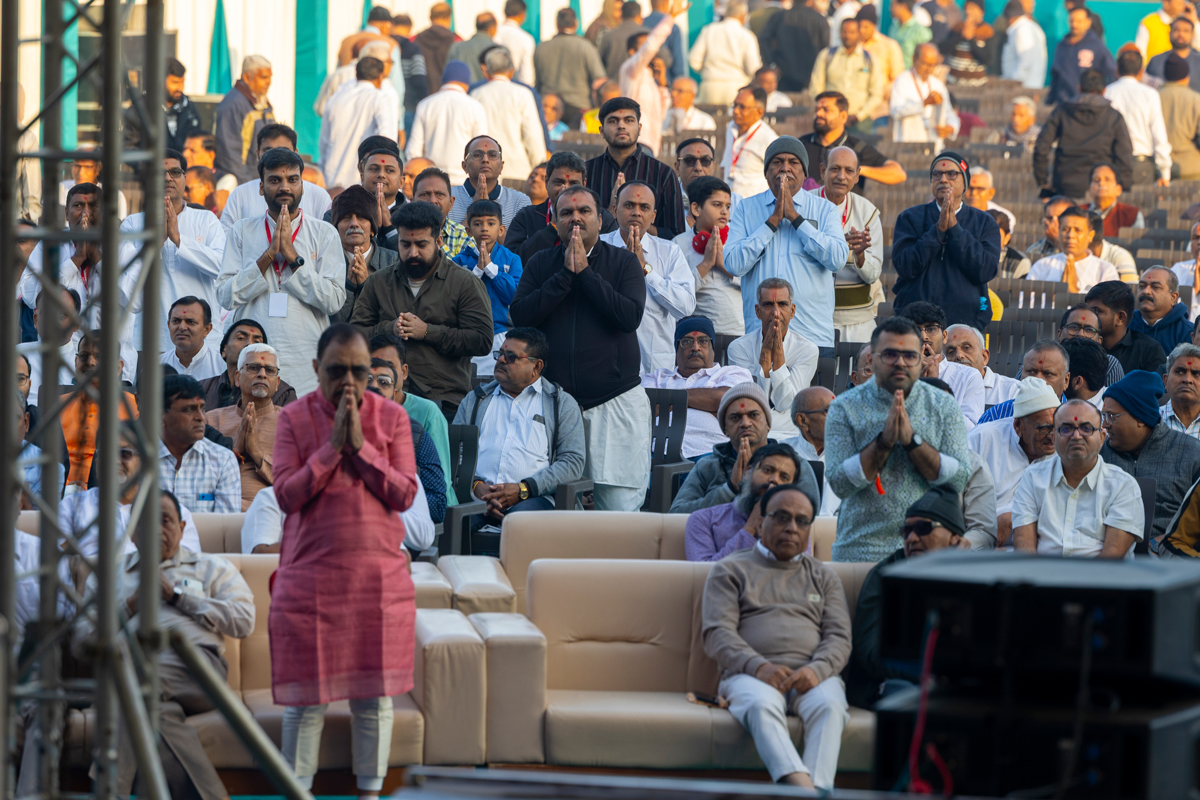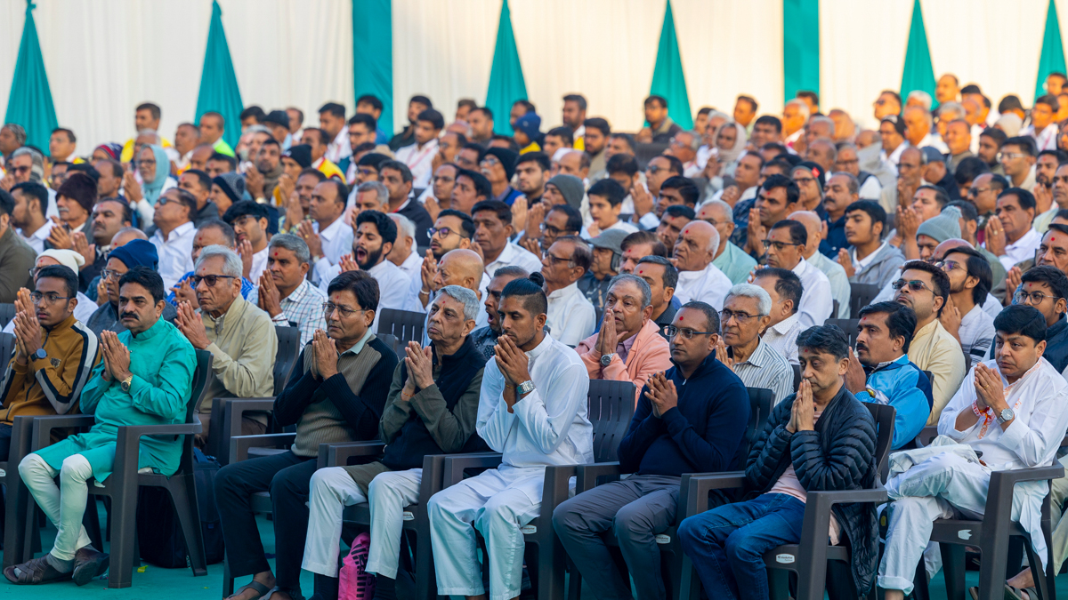 Devotees sing kirtans at the beginning of the evening Gramya Din assembly