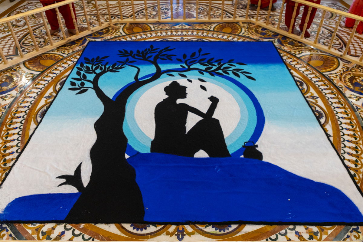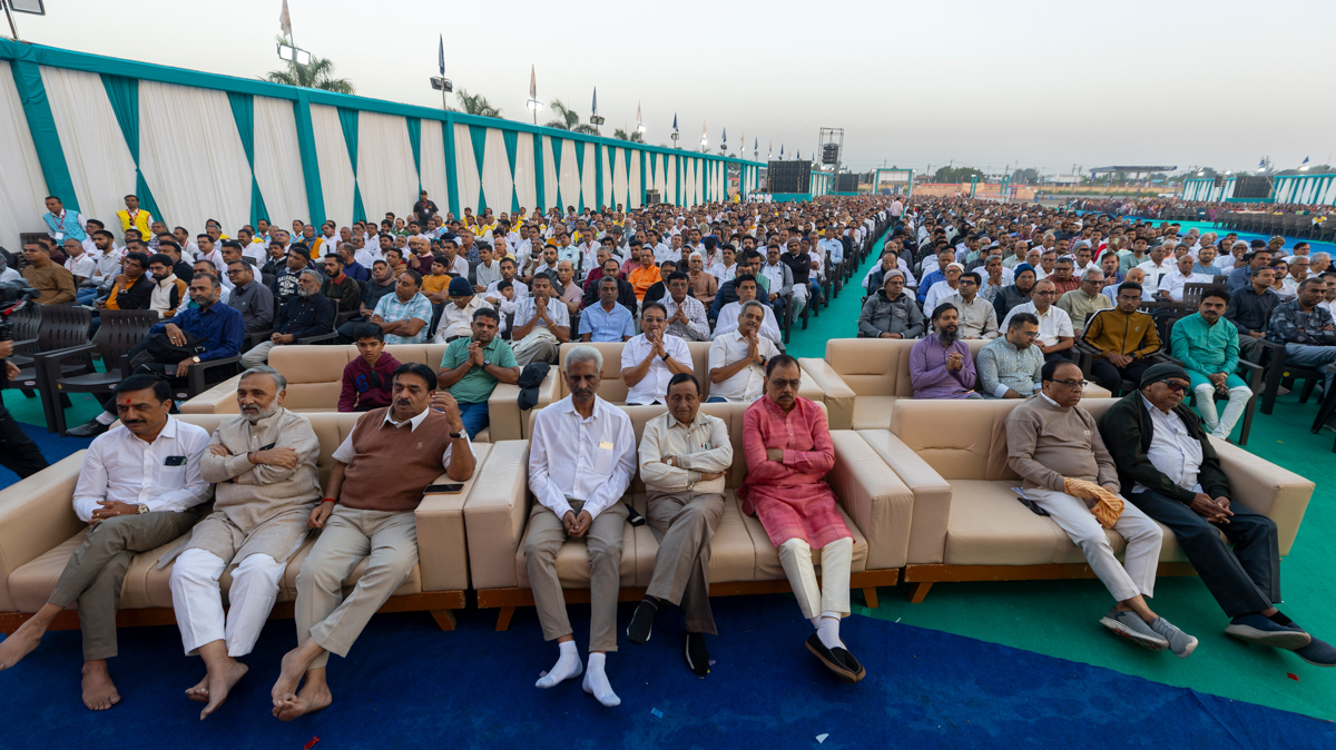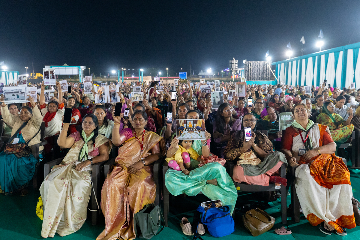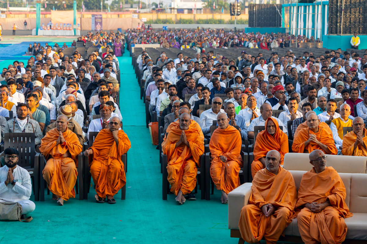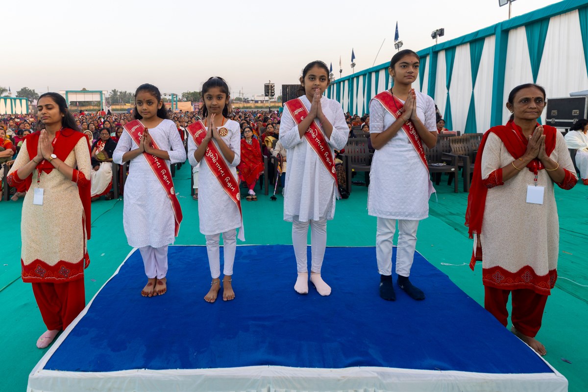 Devotees sing kirtans at the beginning of the evening Gramya Din assembly