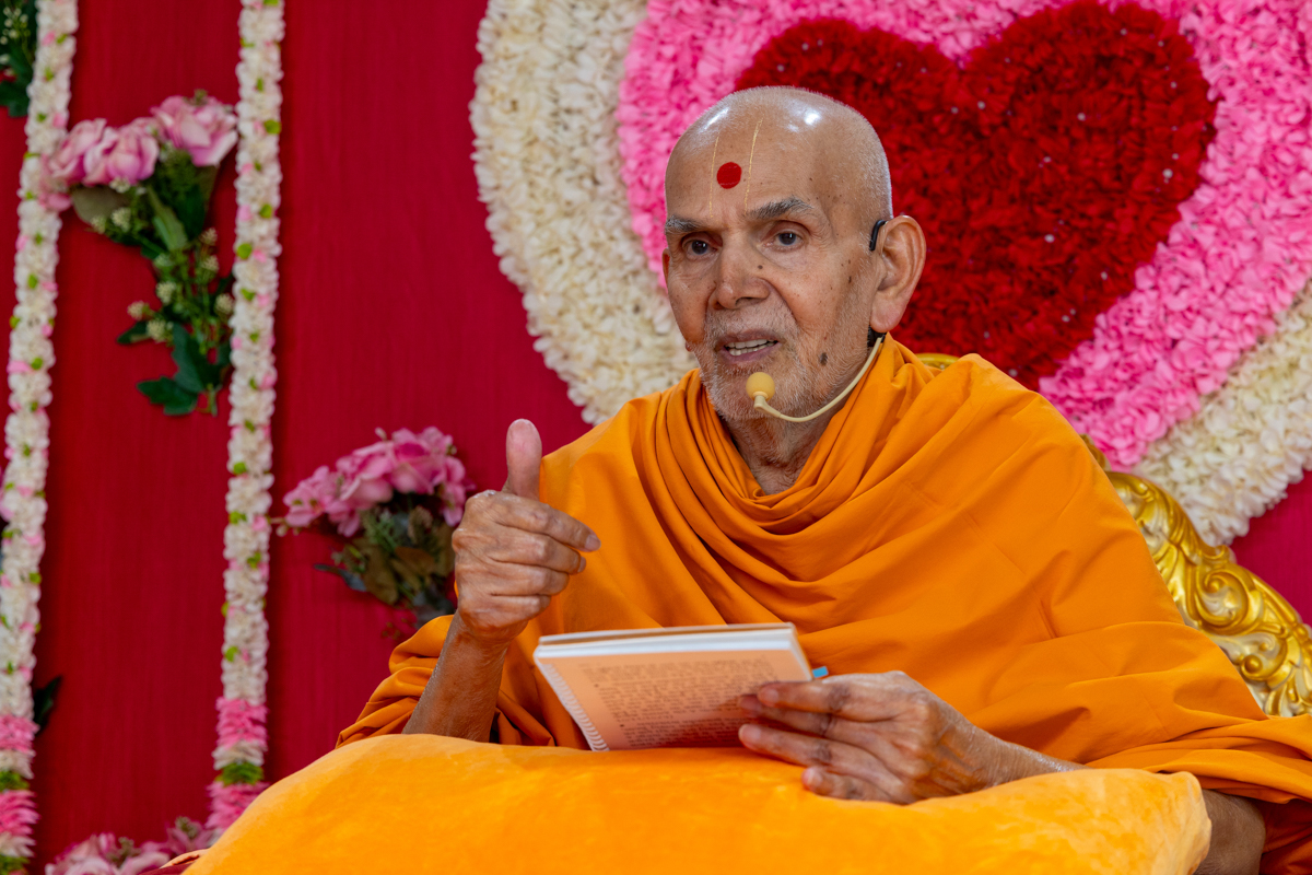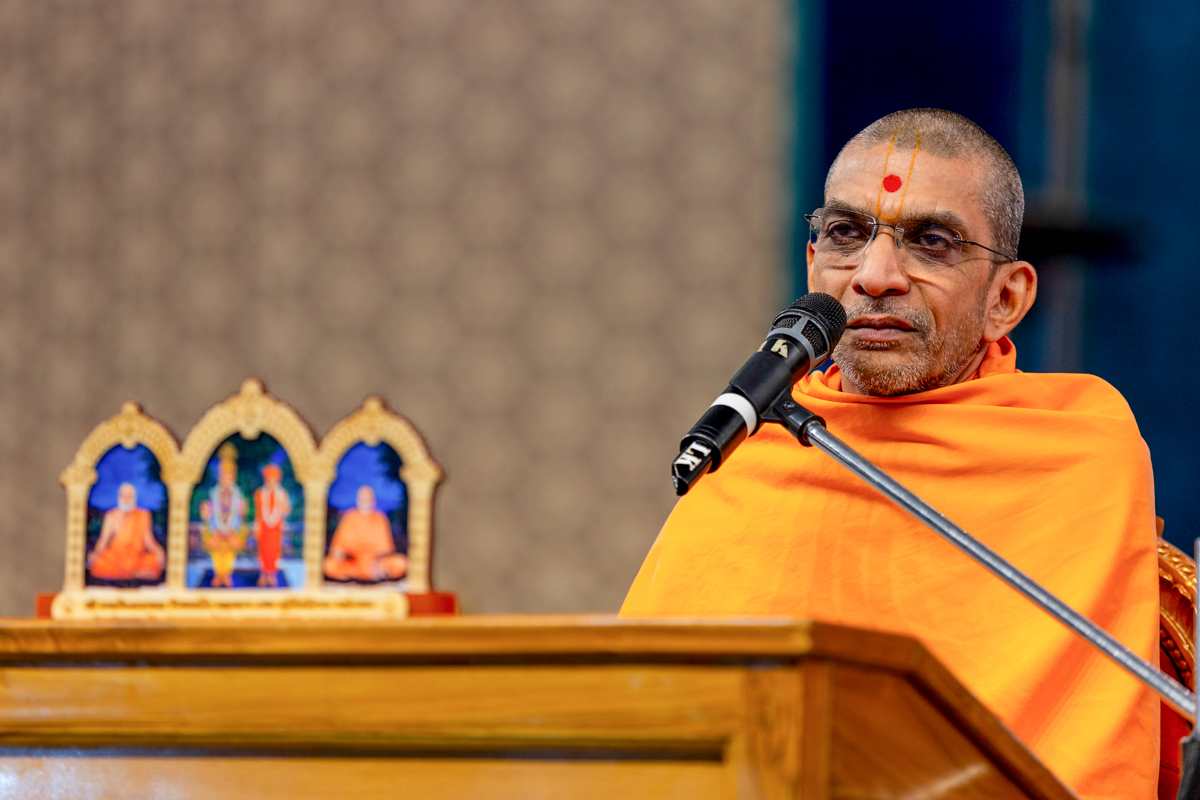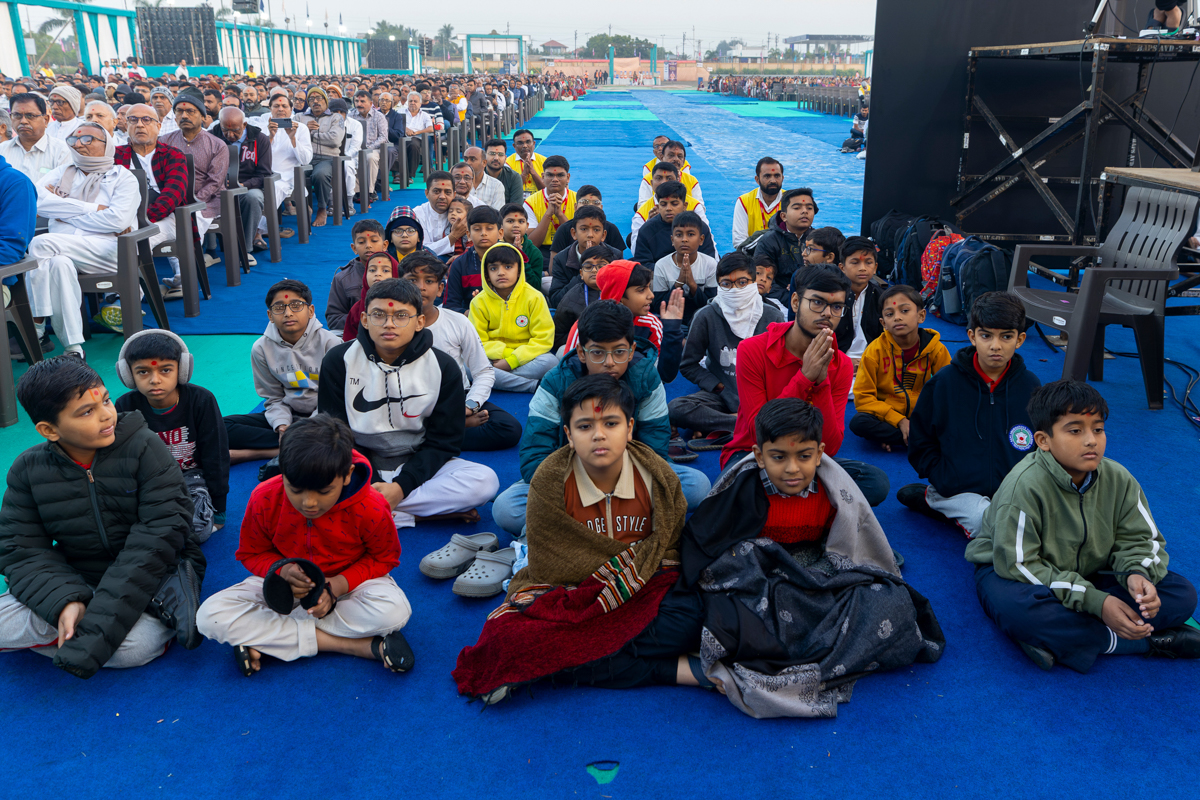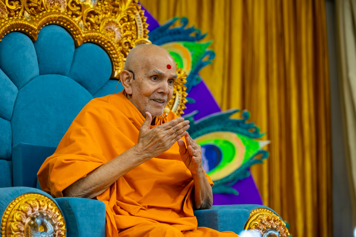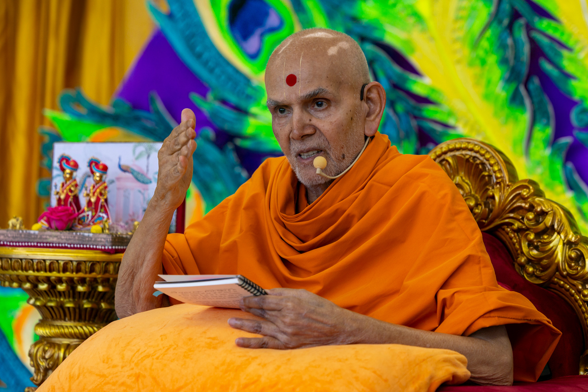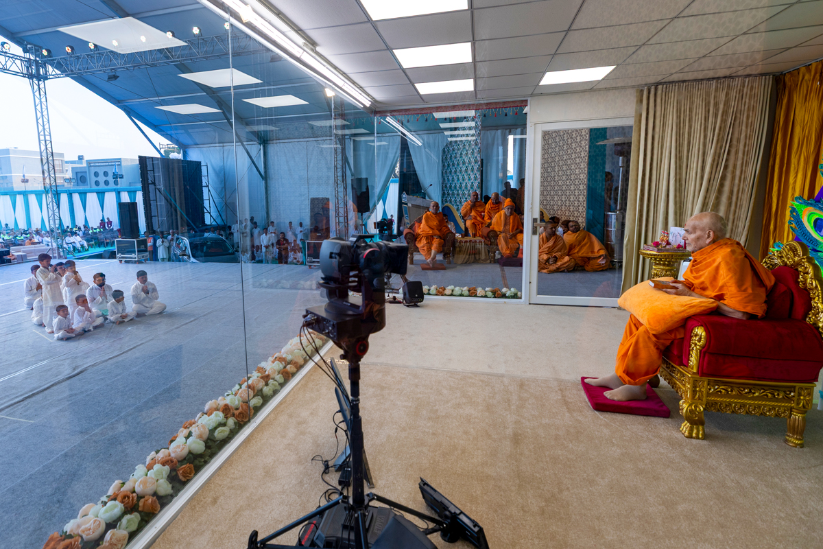 Children lead everyone in reciting the sadhana mantra and daily prayer in Swamishri's puja