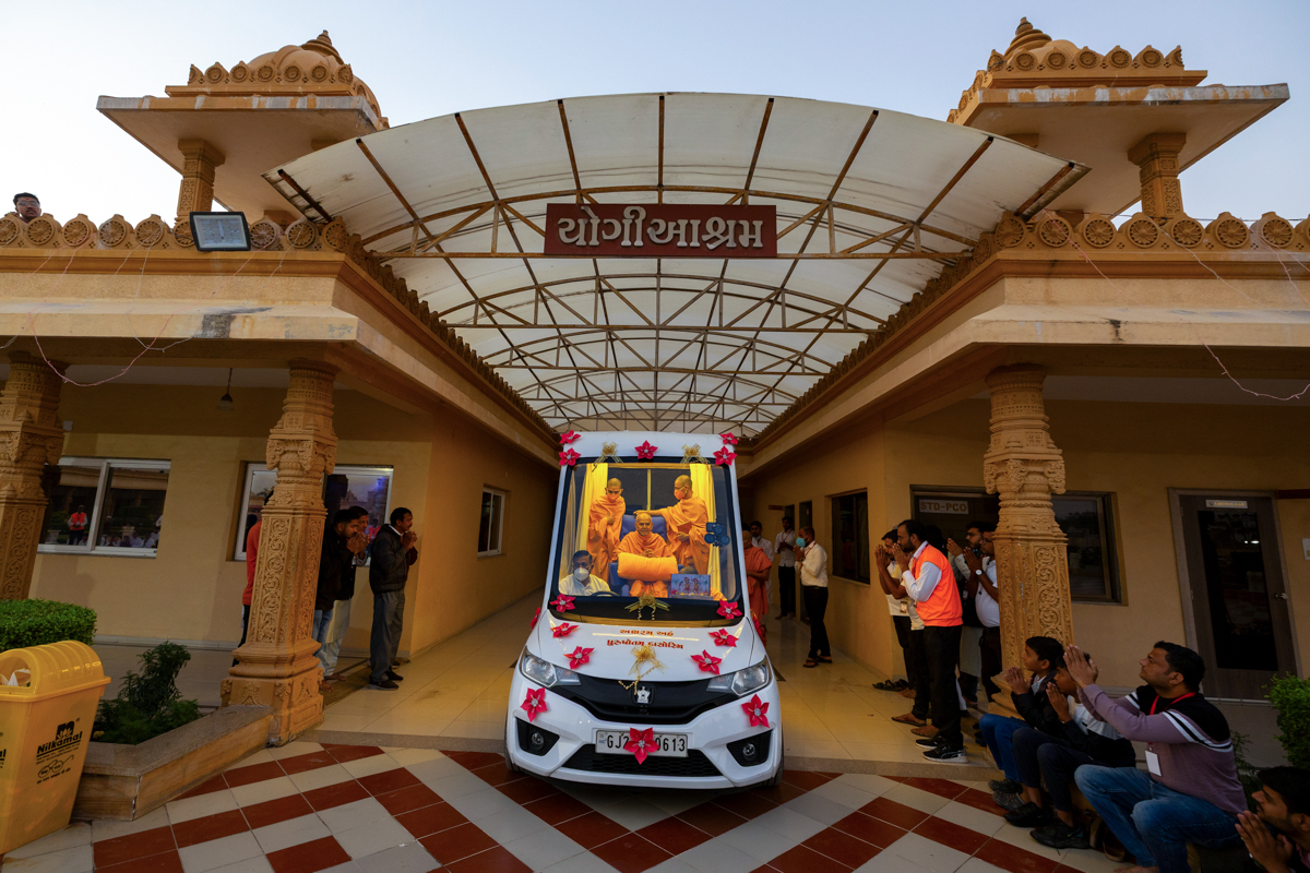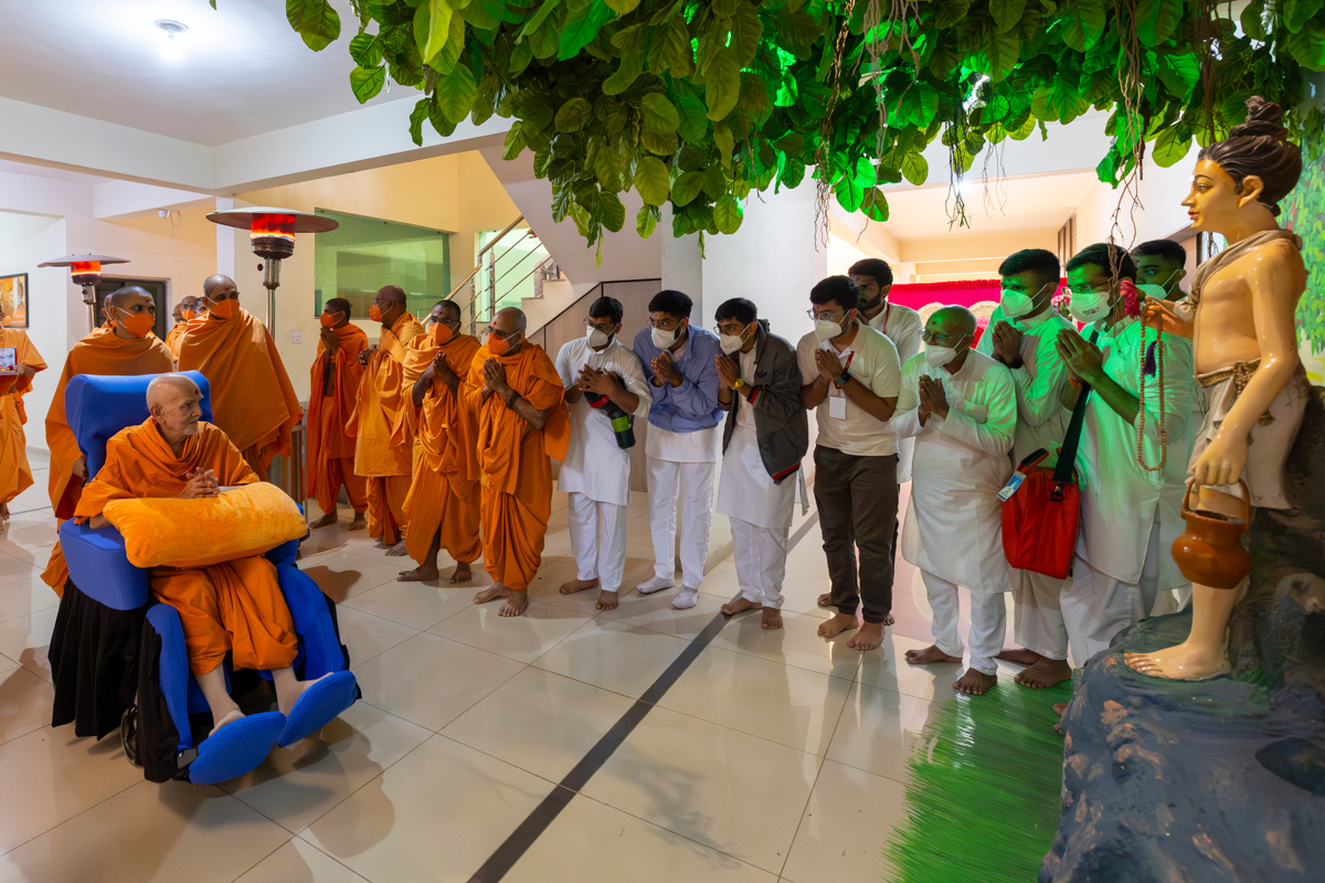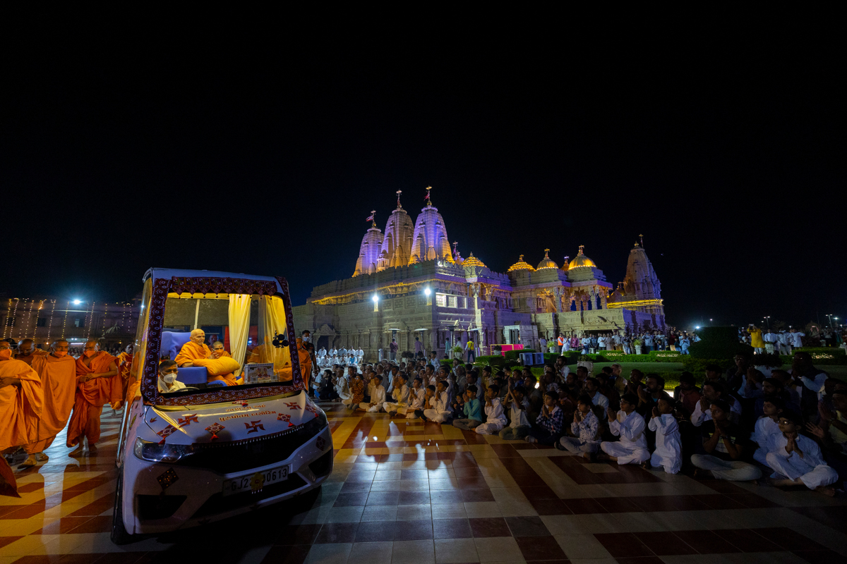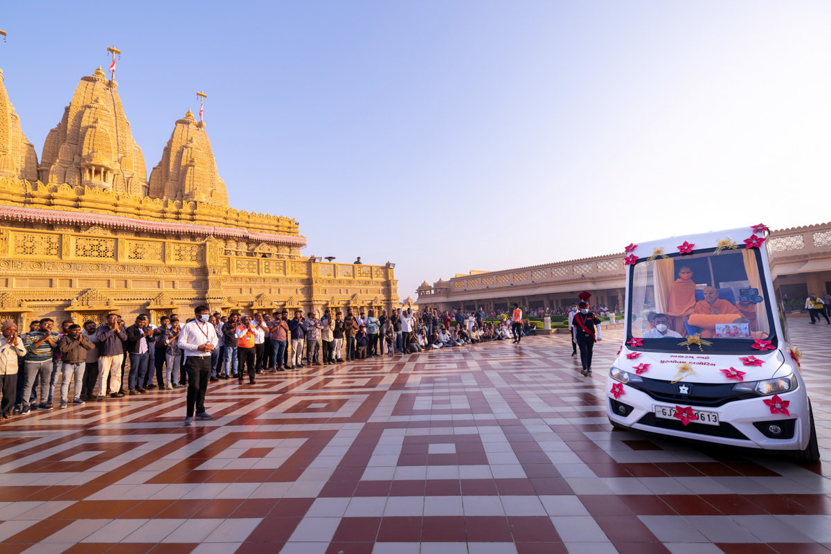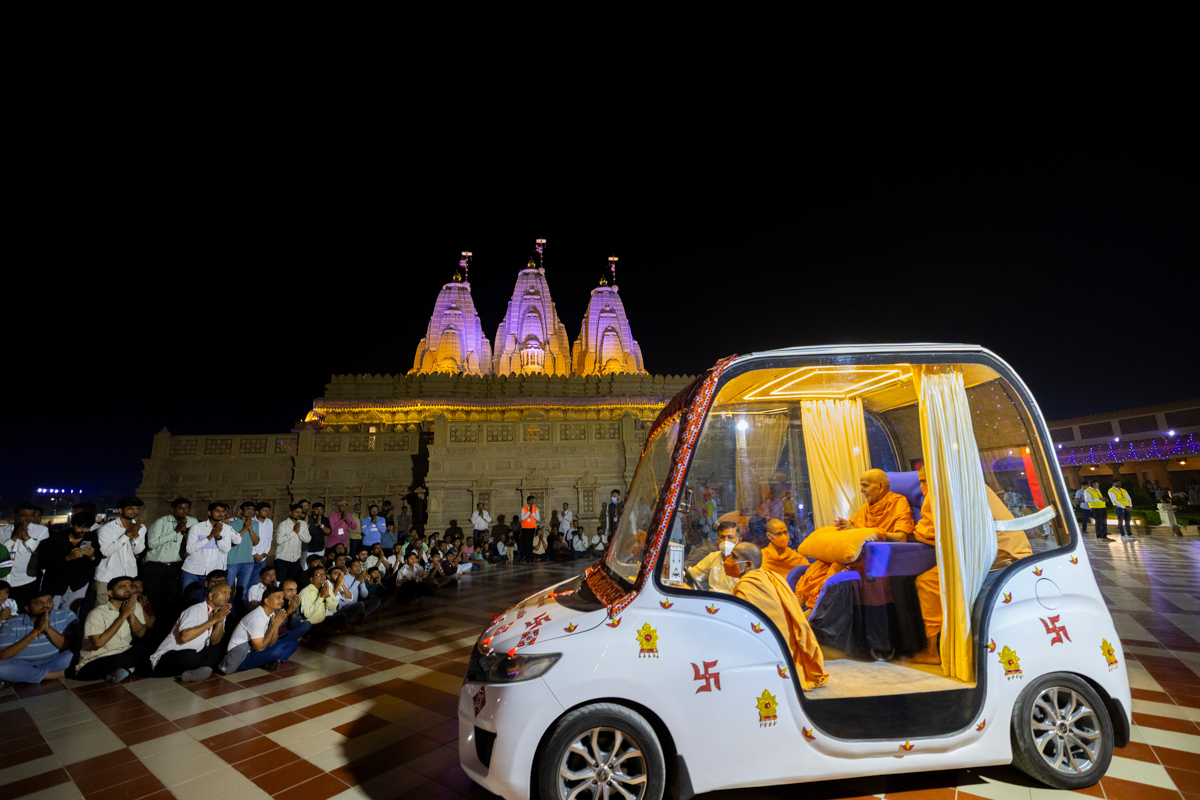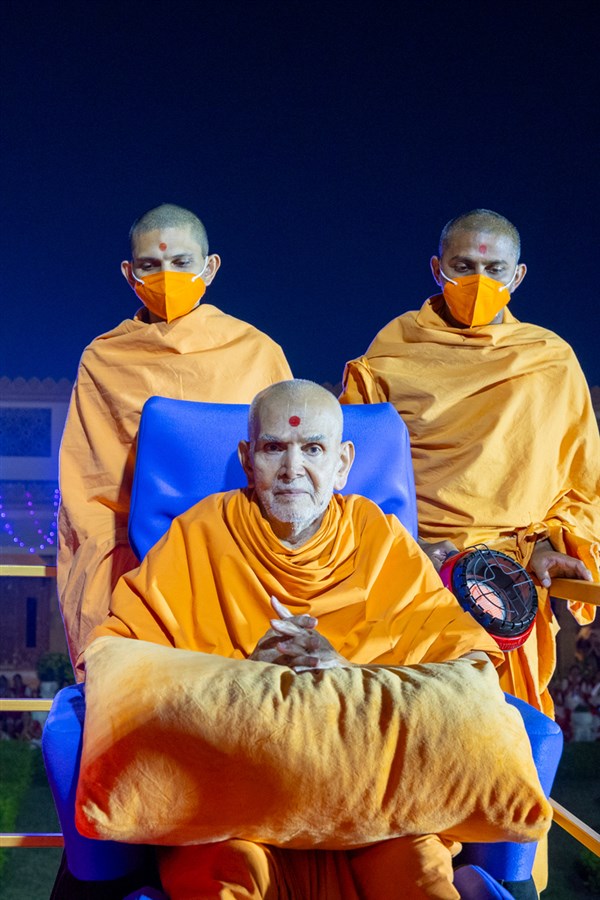 Param Pujya Mahant Swami Maharaj on his way to perform his daily puja