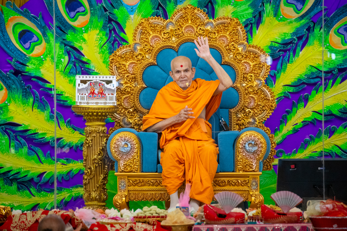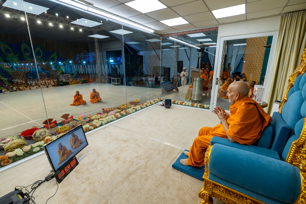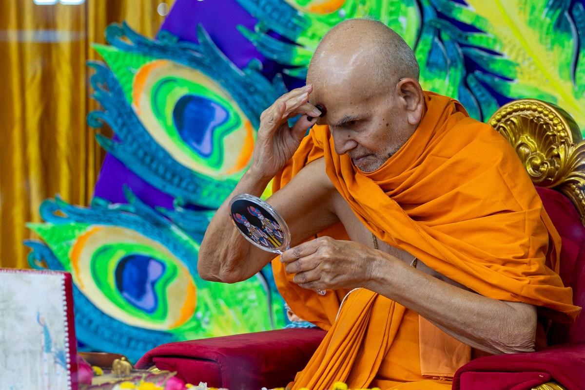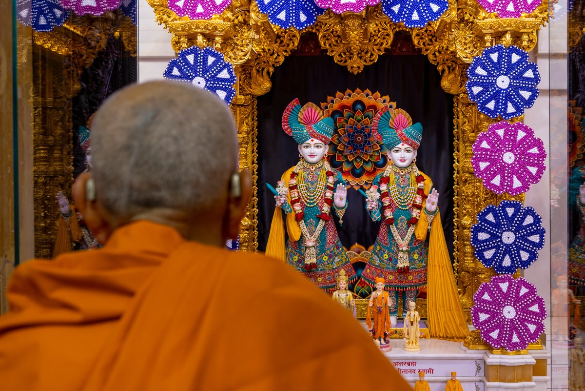 Swamishri engrossed in darshan of Shri Harikrishna Maharaj, Bhagwan Shri Krishna and Shri Radhaji