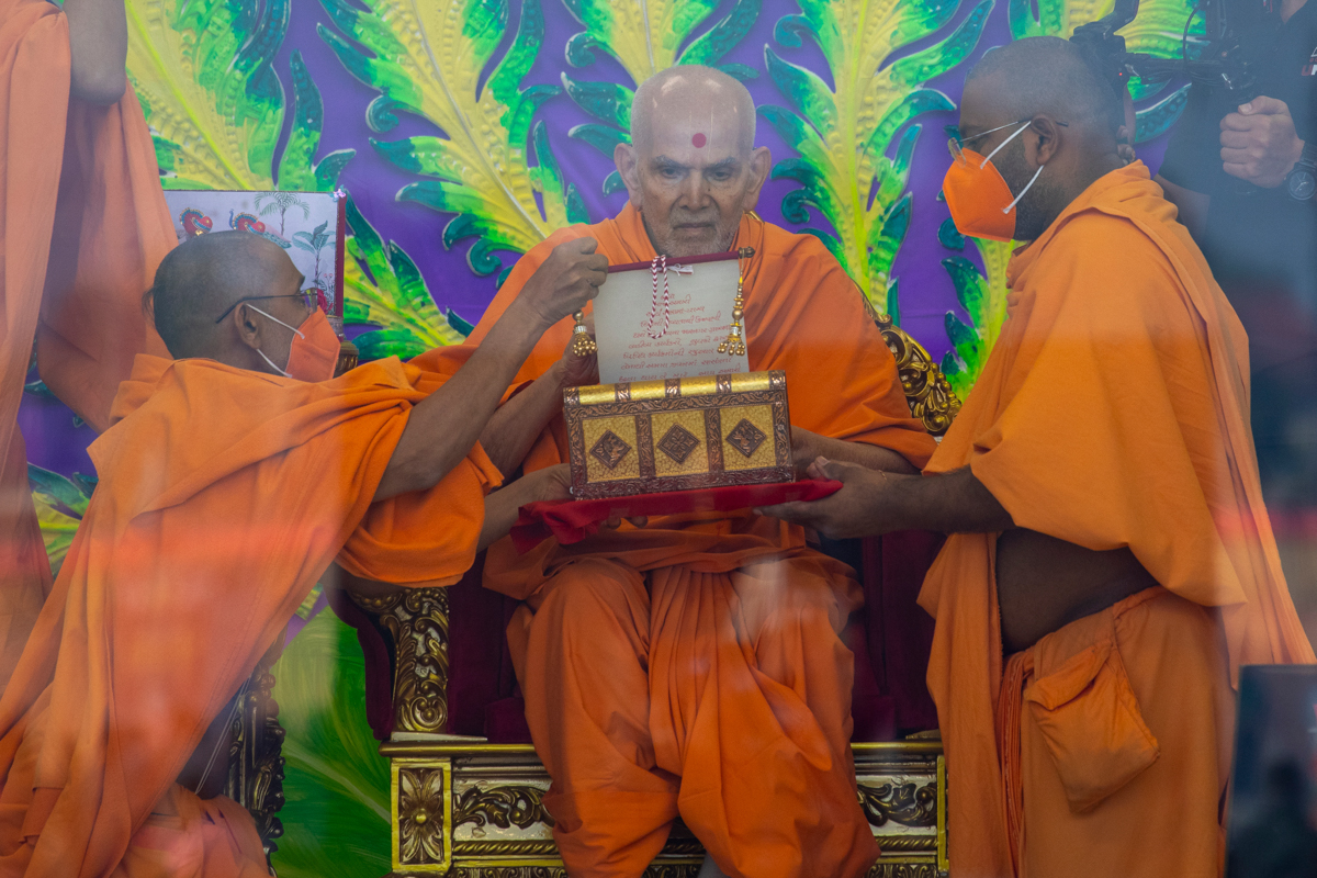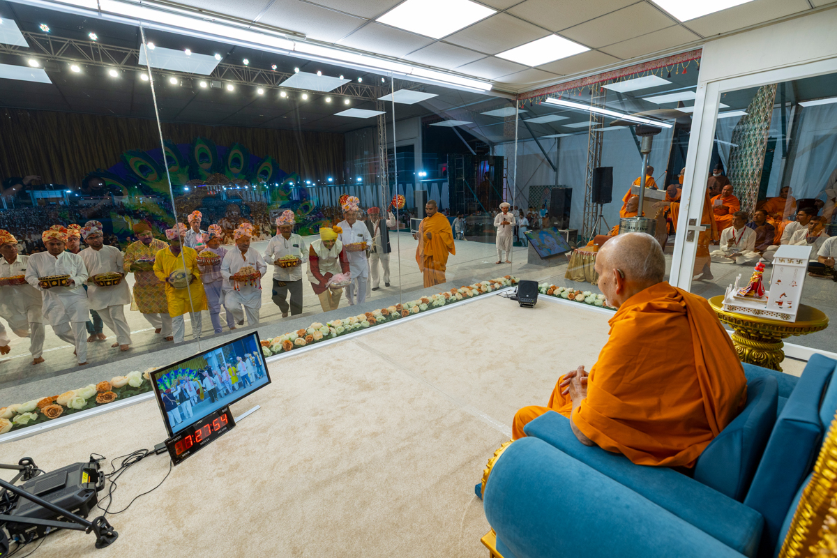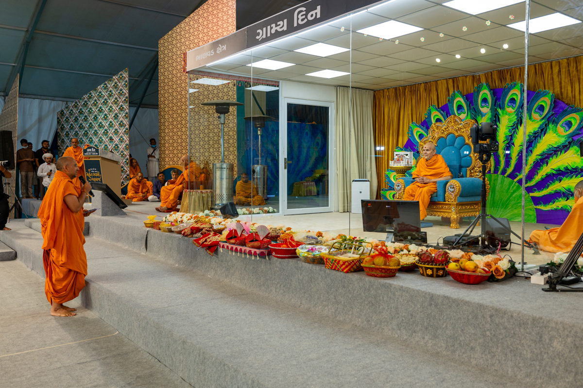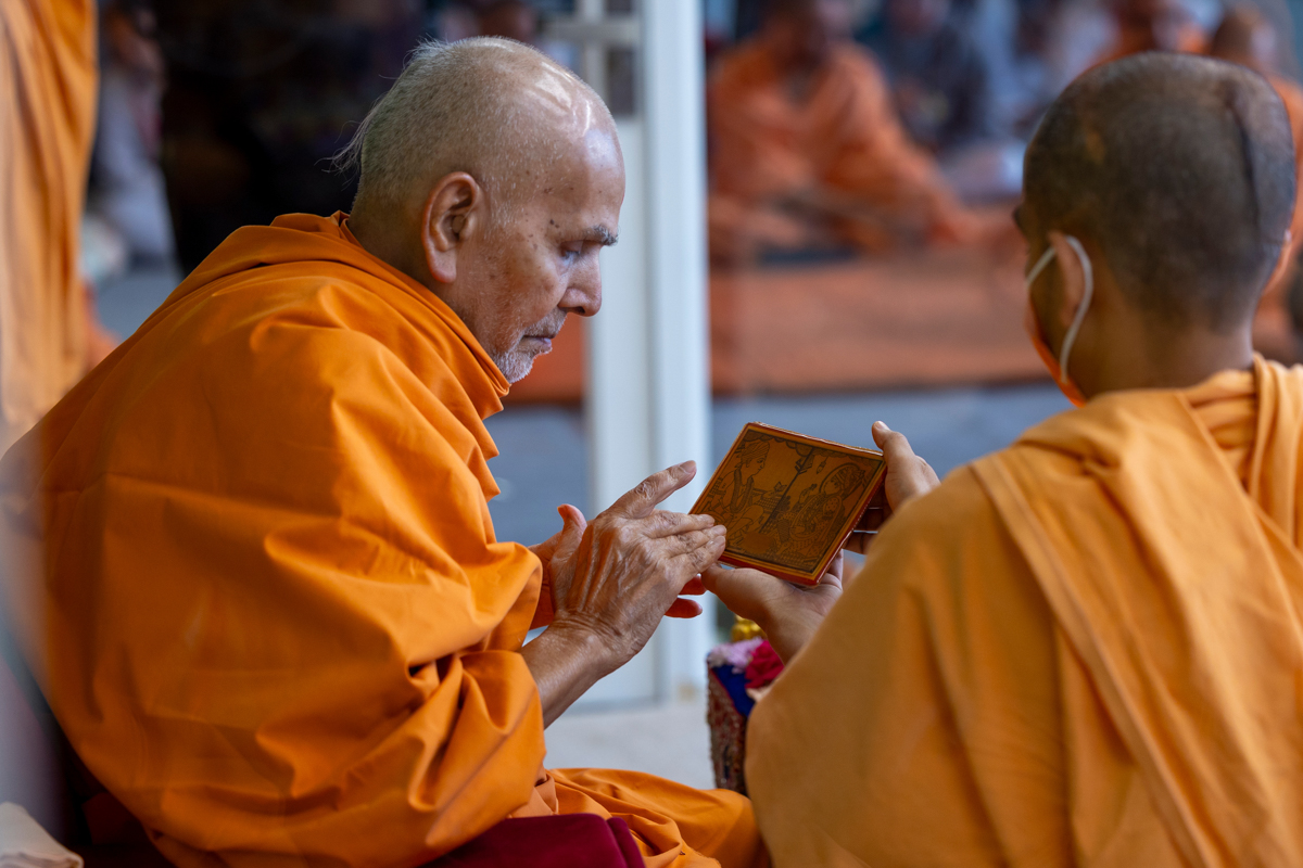 Swamis present an invitation card to Swamishri for the evening Gramya Din assembly