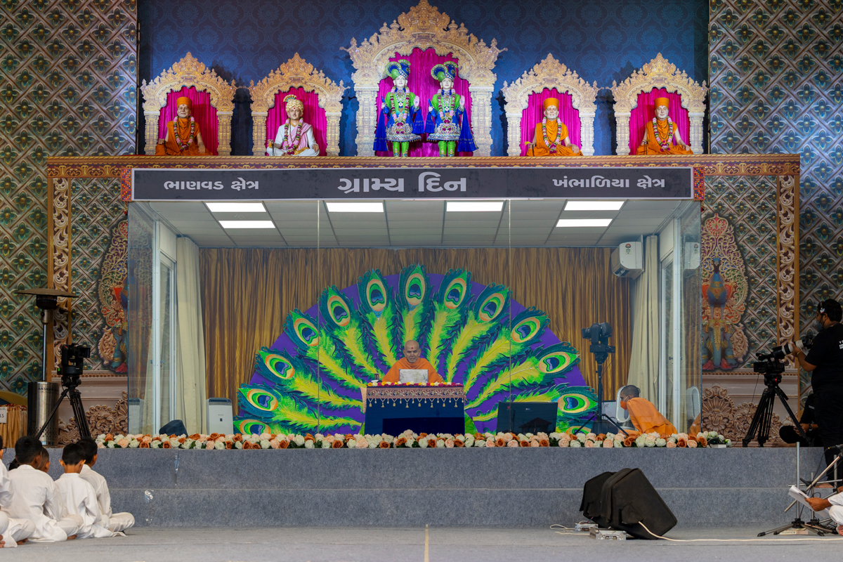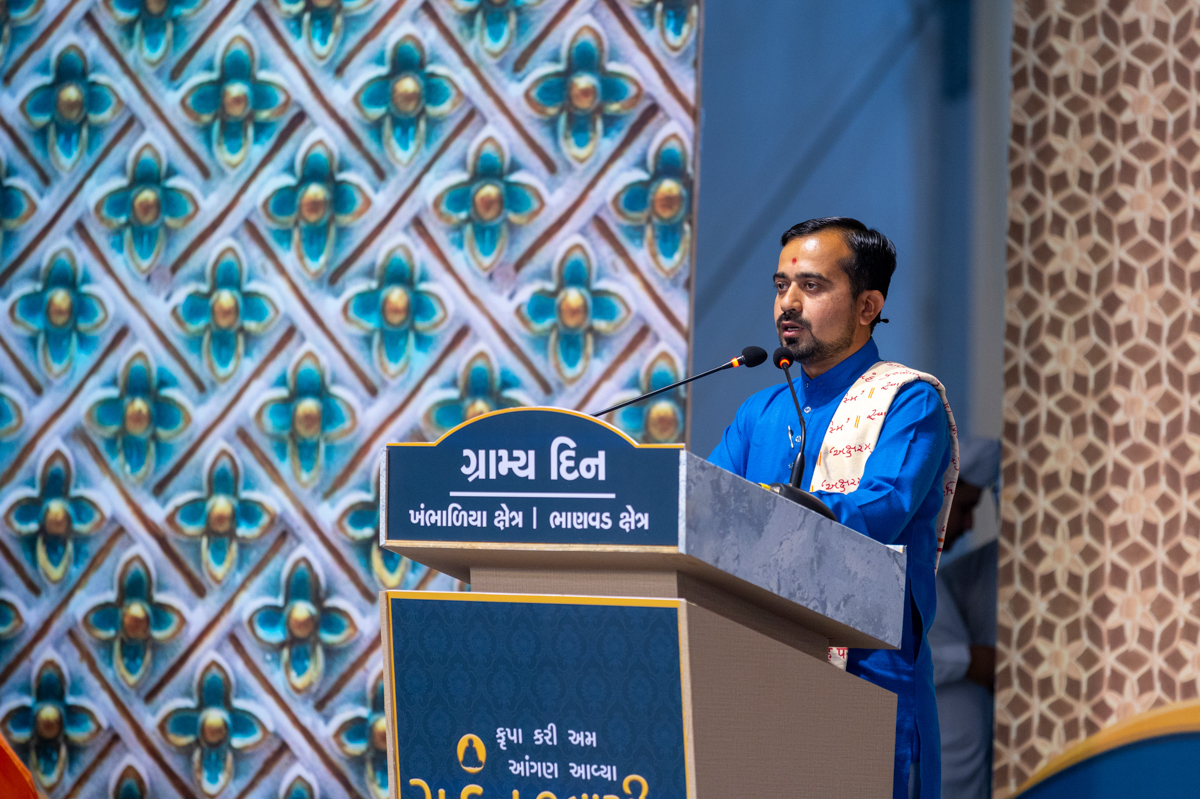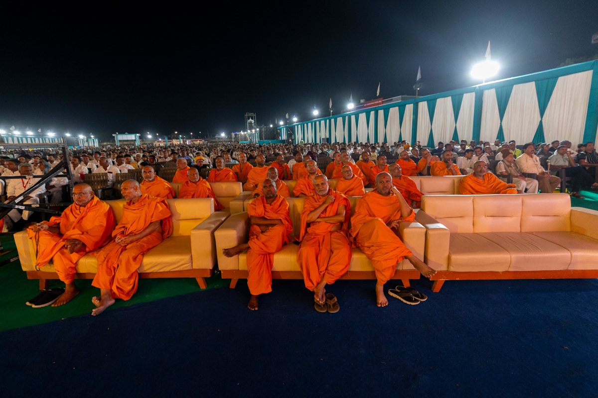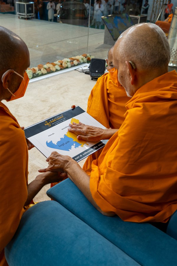 Swamis present an invitation card to Swamishri for the evening Gramya Din assembly