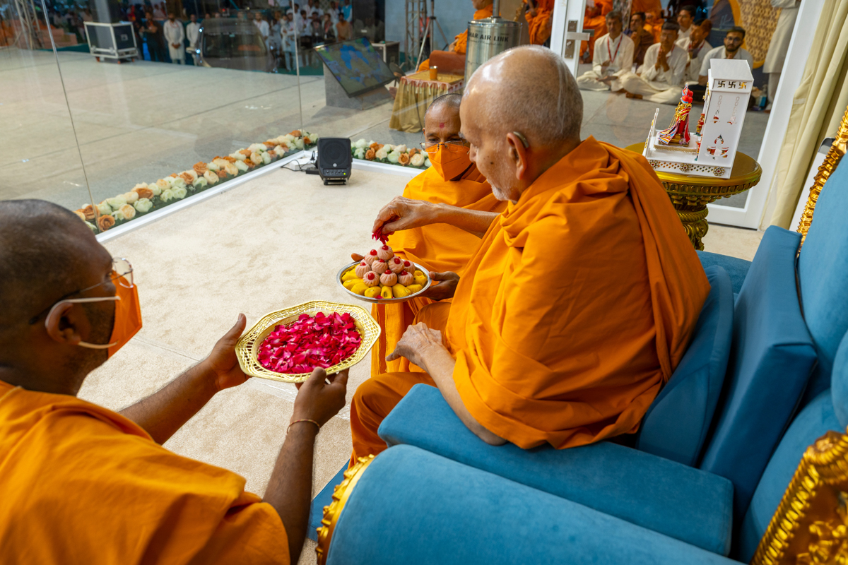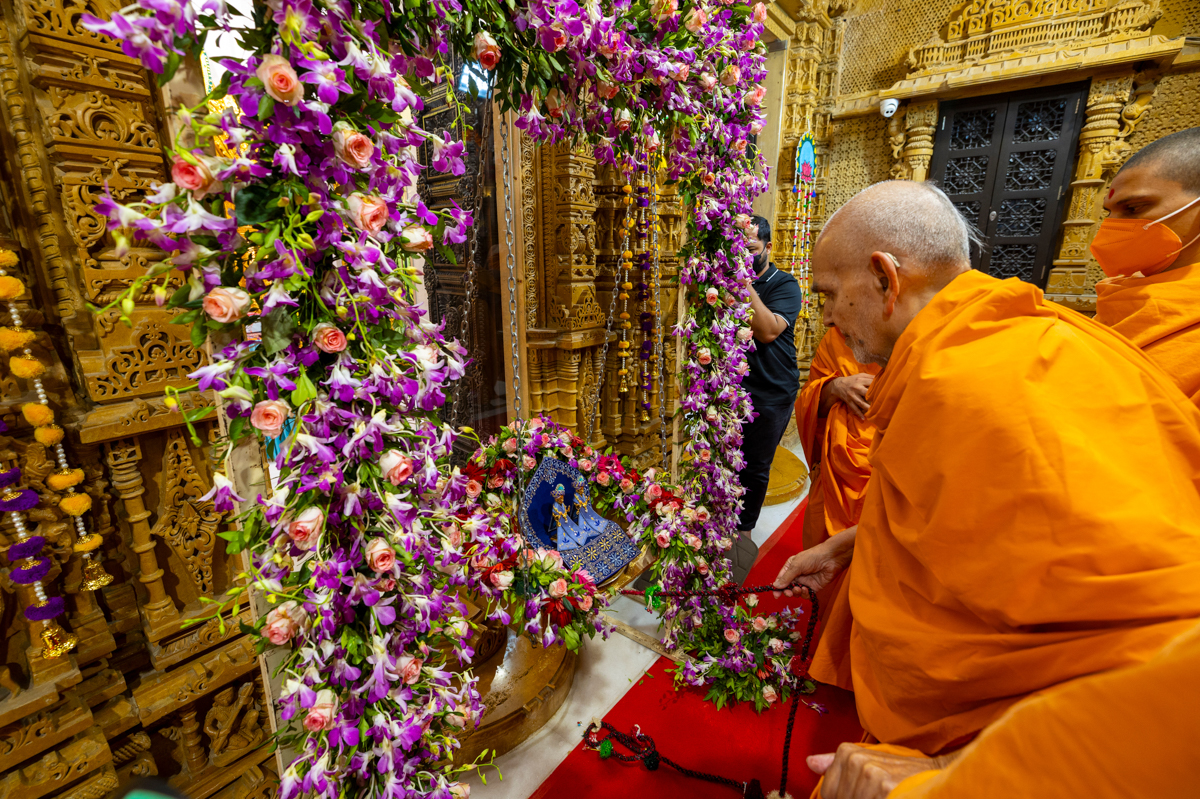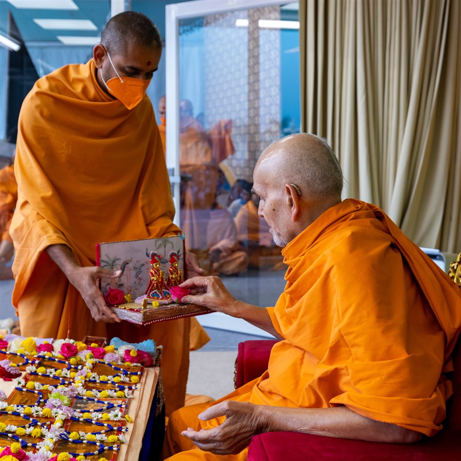 Swamishri places a flower at the feet of Shri Harikrishna Maharaj and Shri Gunatitanand Swami Maharaj