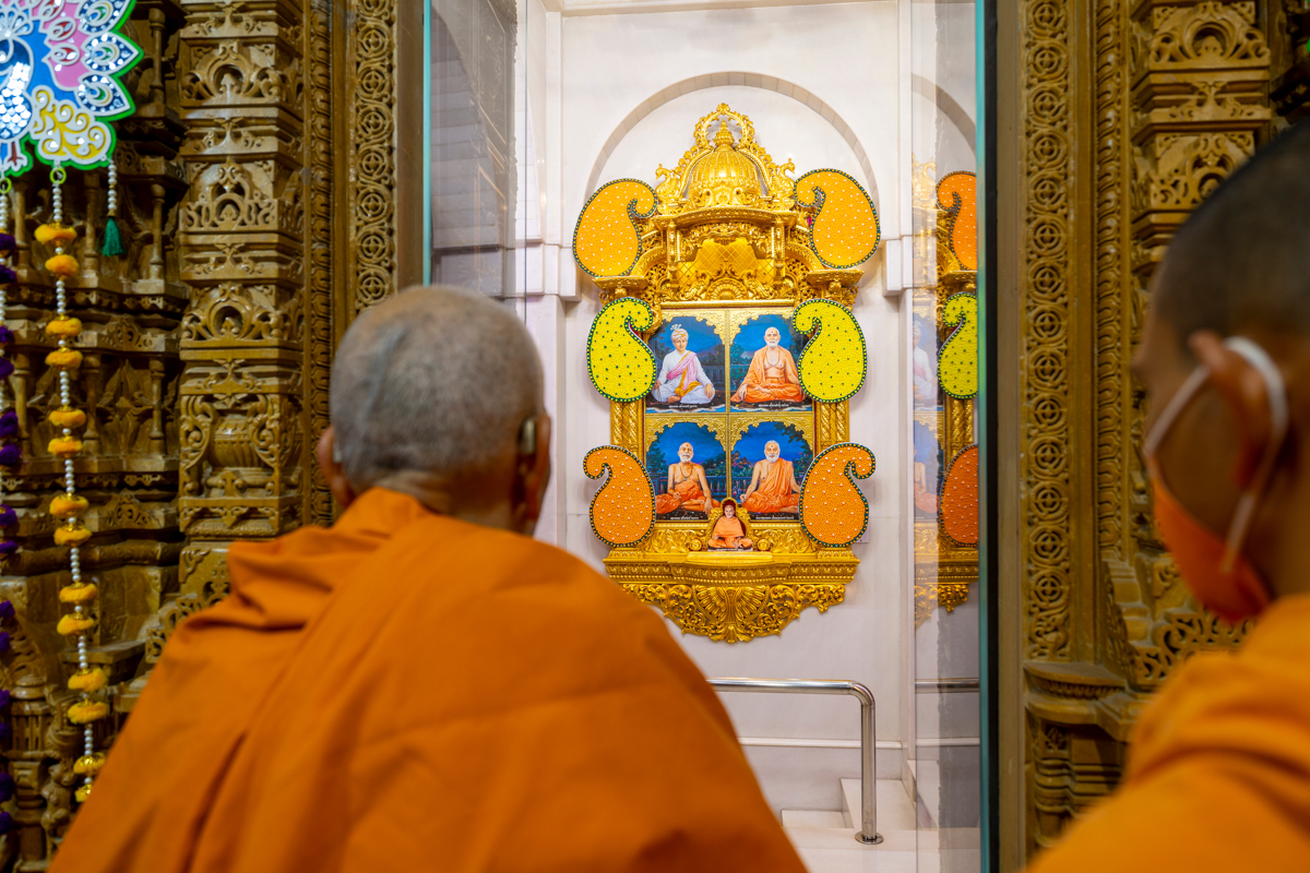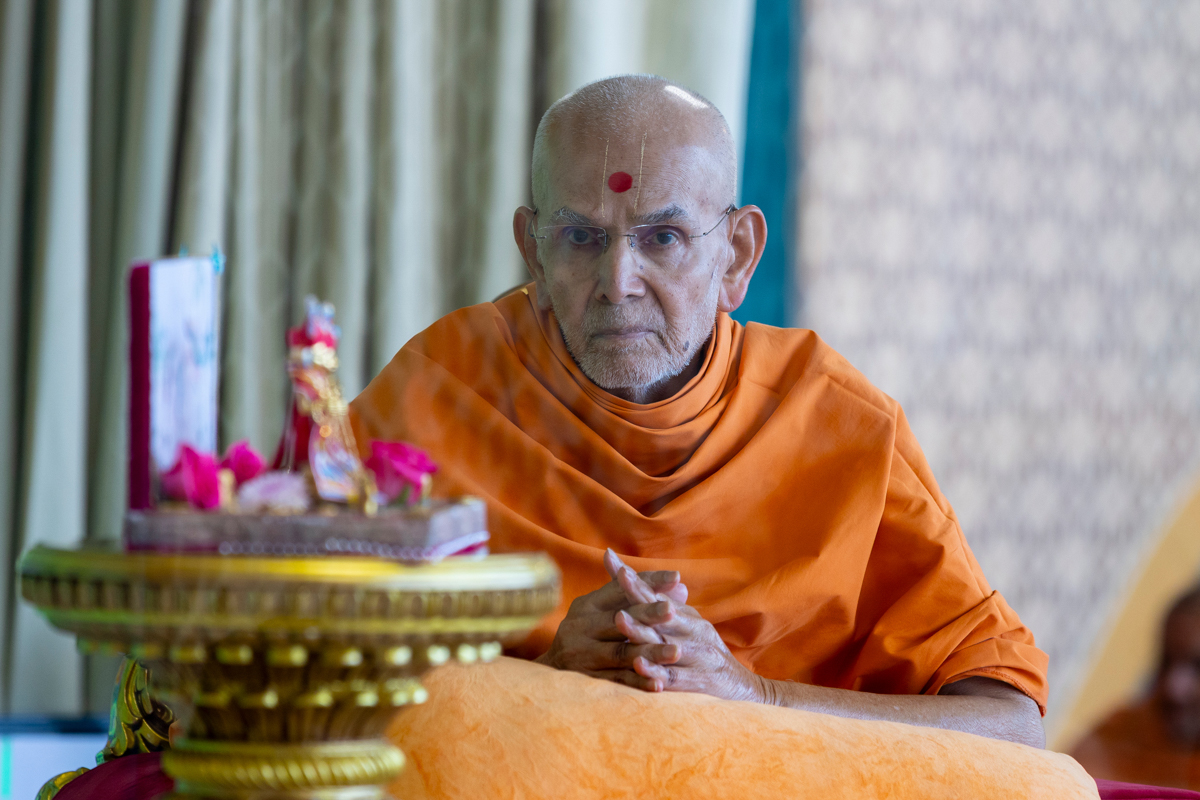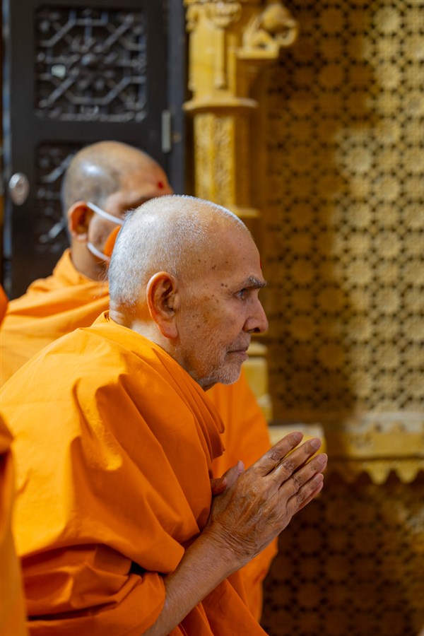 Swamishri engrossed in darshan of Bhagwan Swaminarayan and Aksharbrahma Gunatitanand Swami