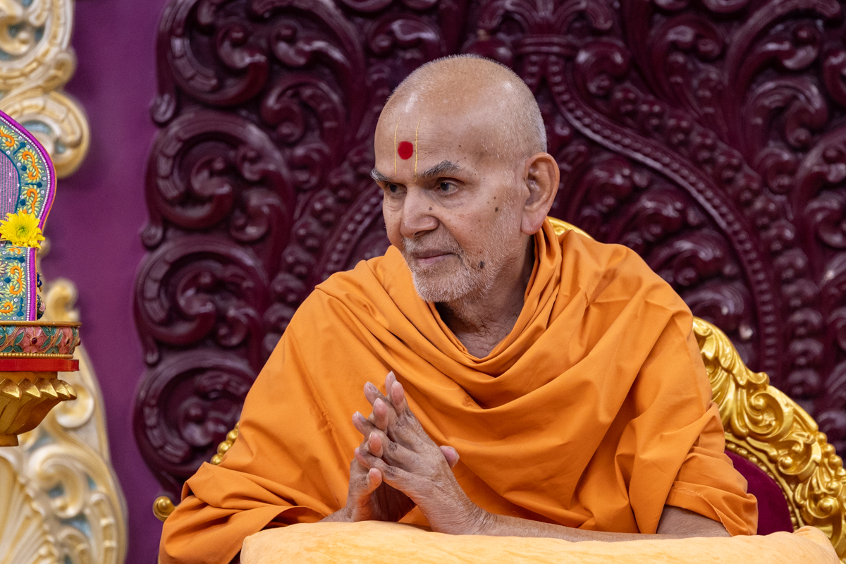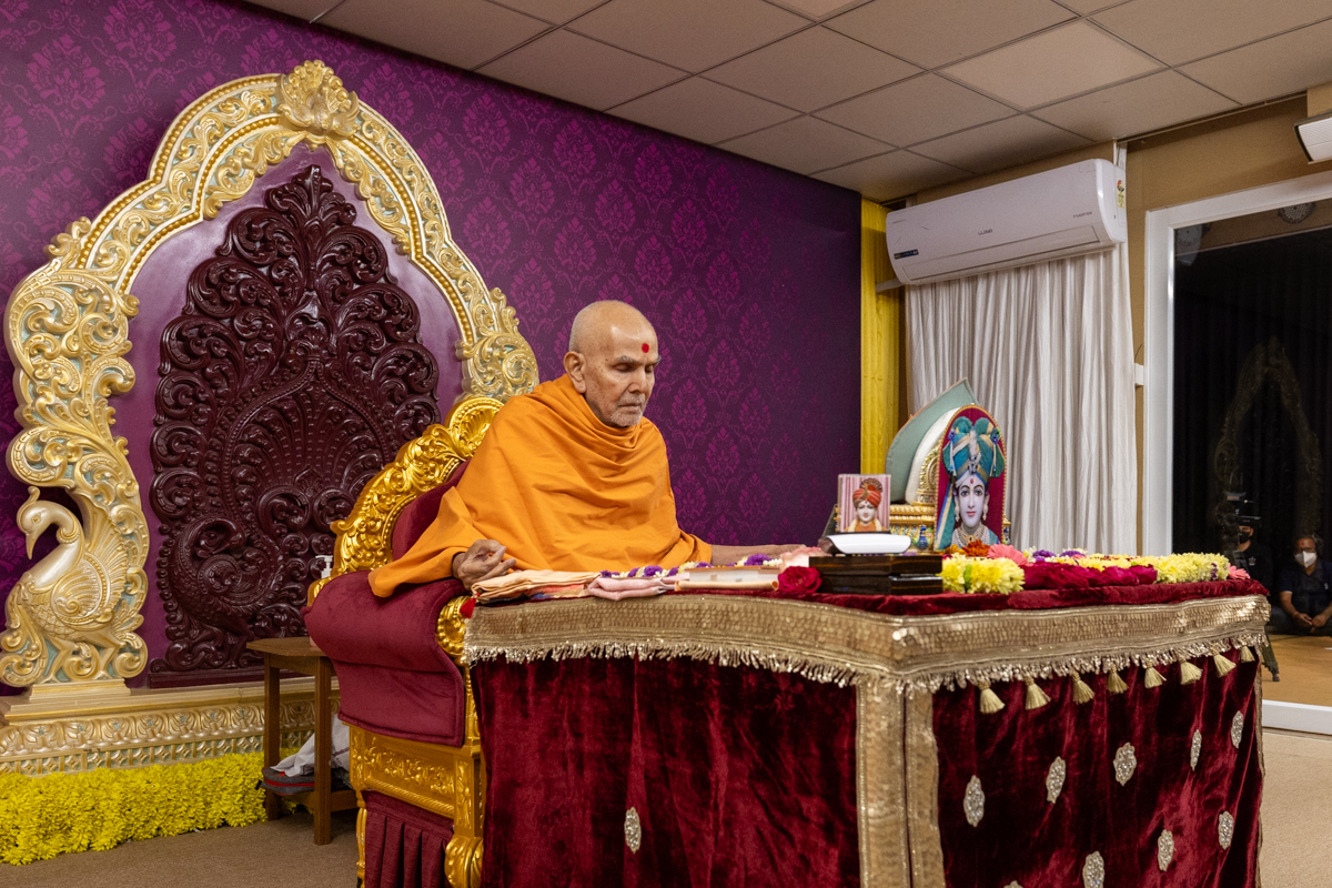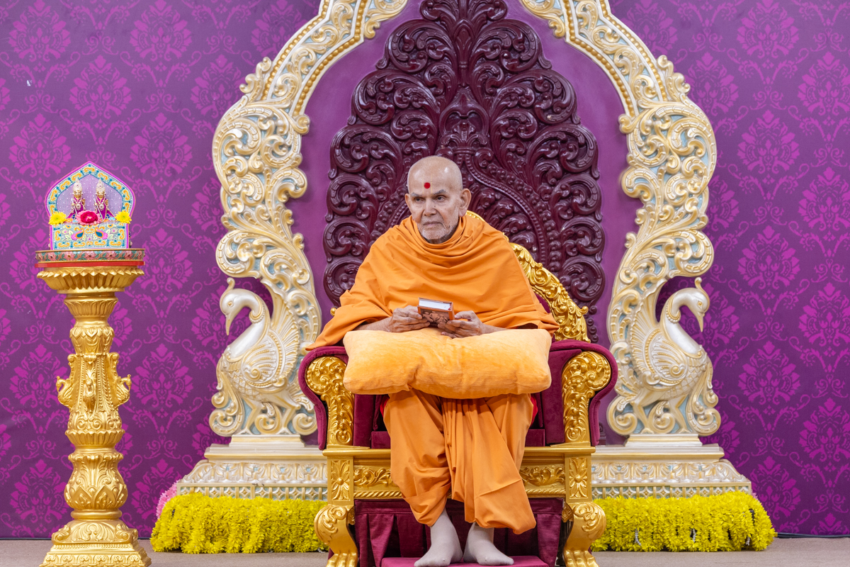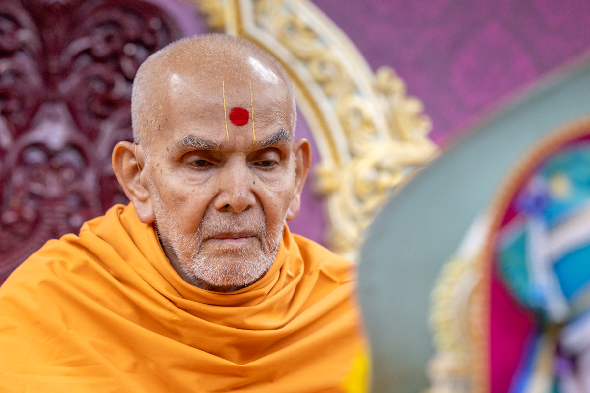 Swamishri engrossed in darshan of Shri Harikrishna Maharaj and Shri Gunatitanand Swami Maharaj
