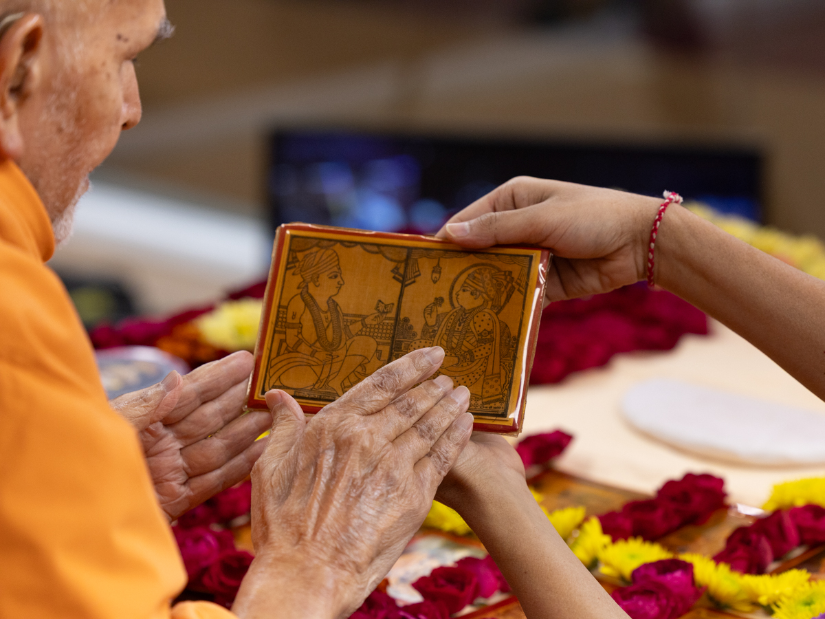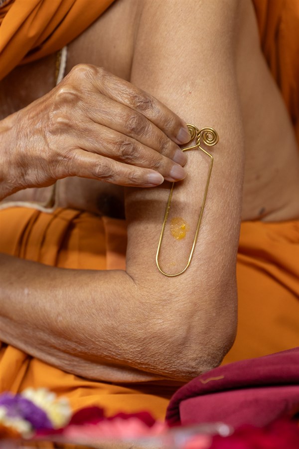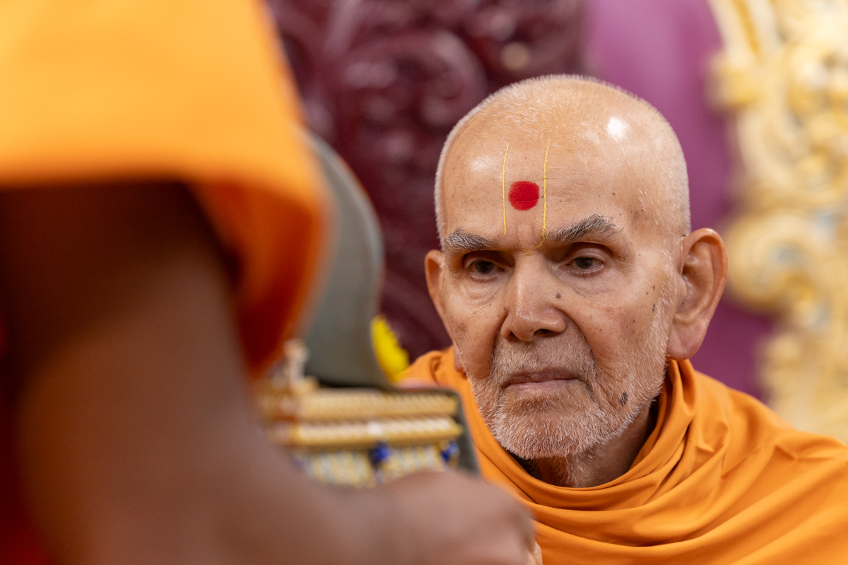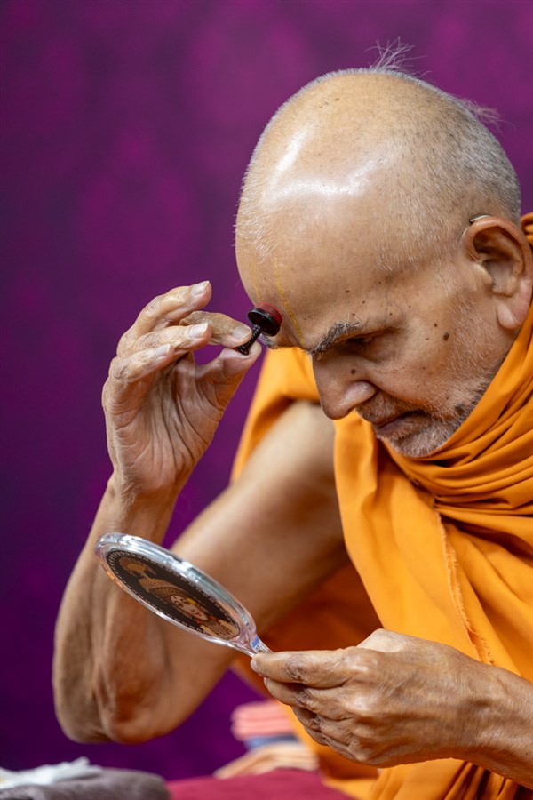 Param Pujya Mahant Swami Maharaj applies a tilak on his forehead