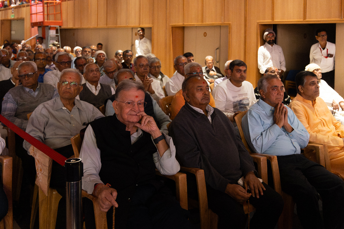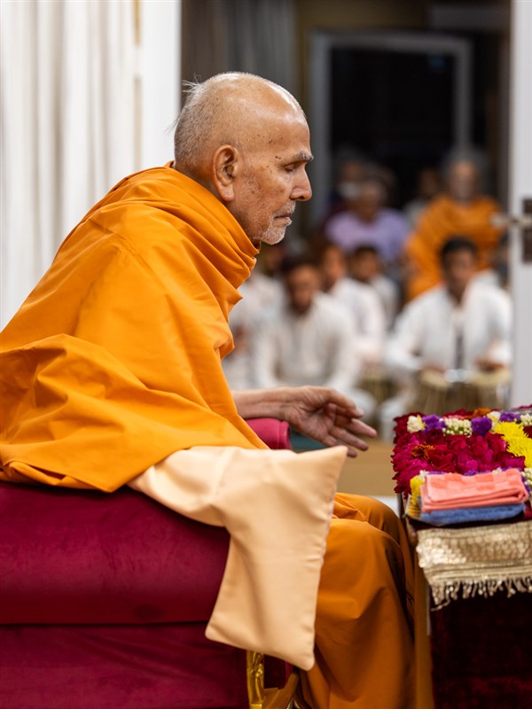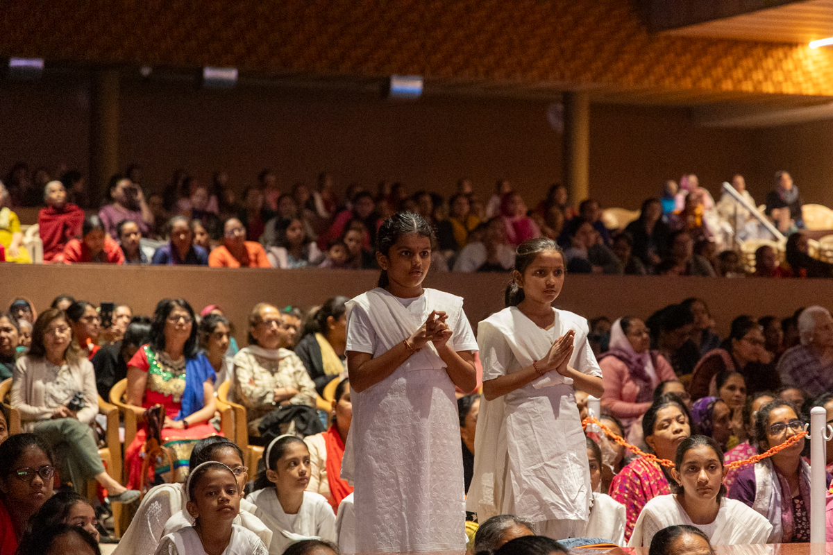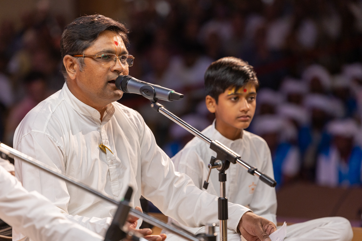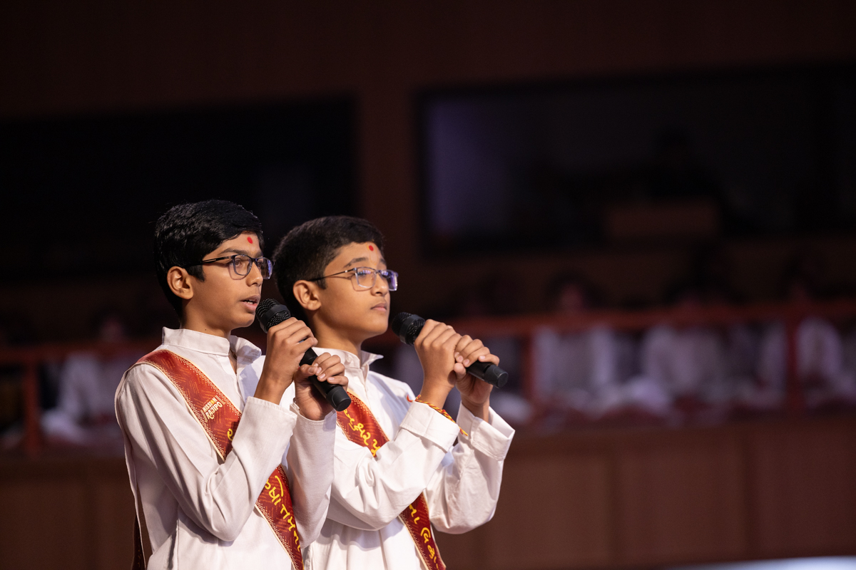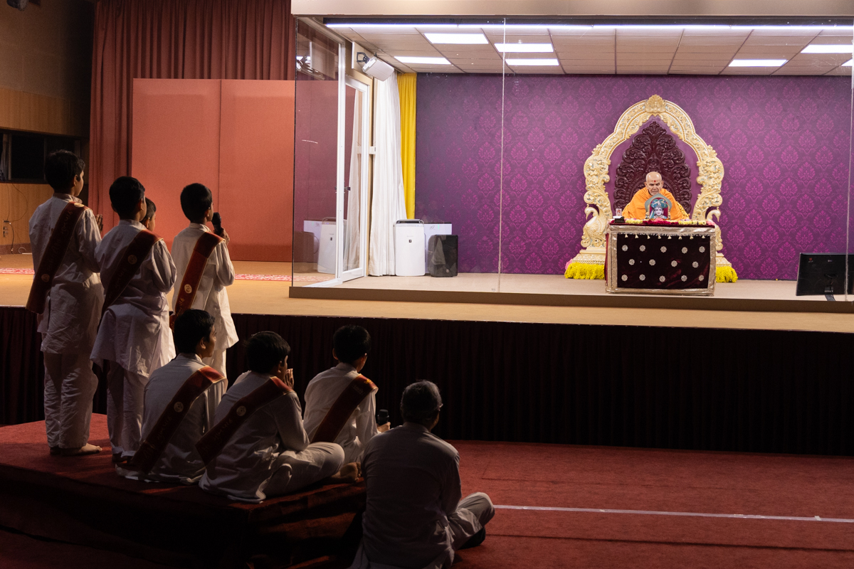 Children lead everyone in reciting the sadhana mantra and daily prayer in Swamishri's puja
