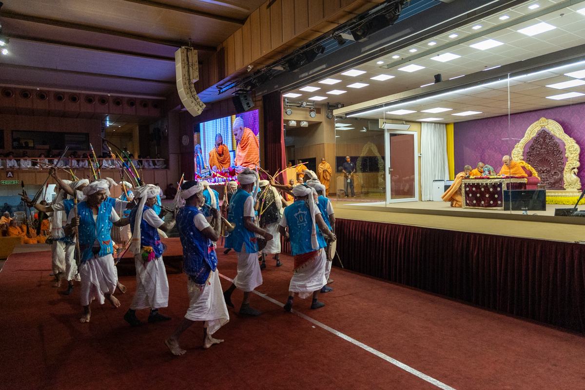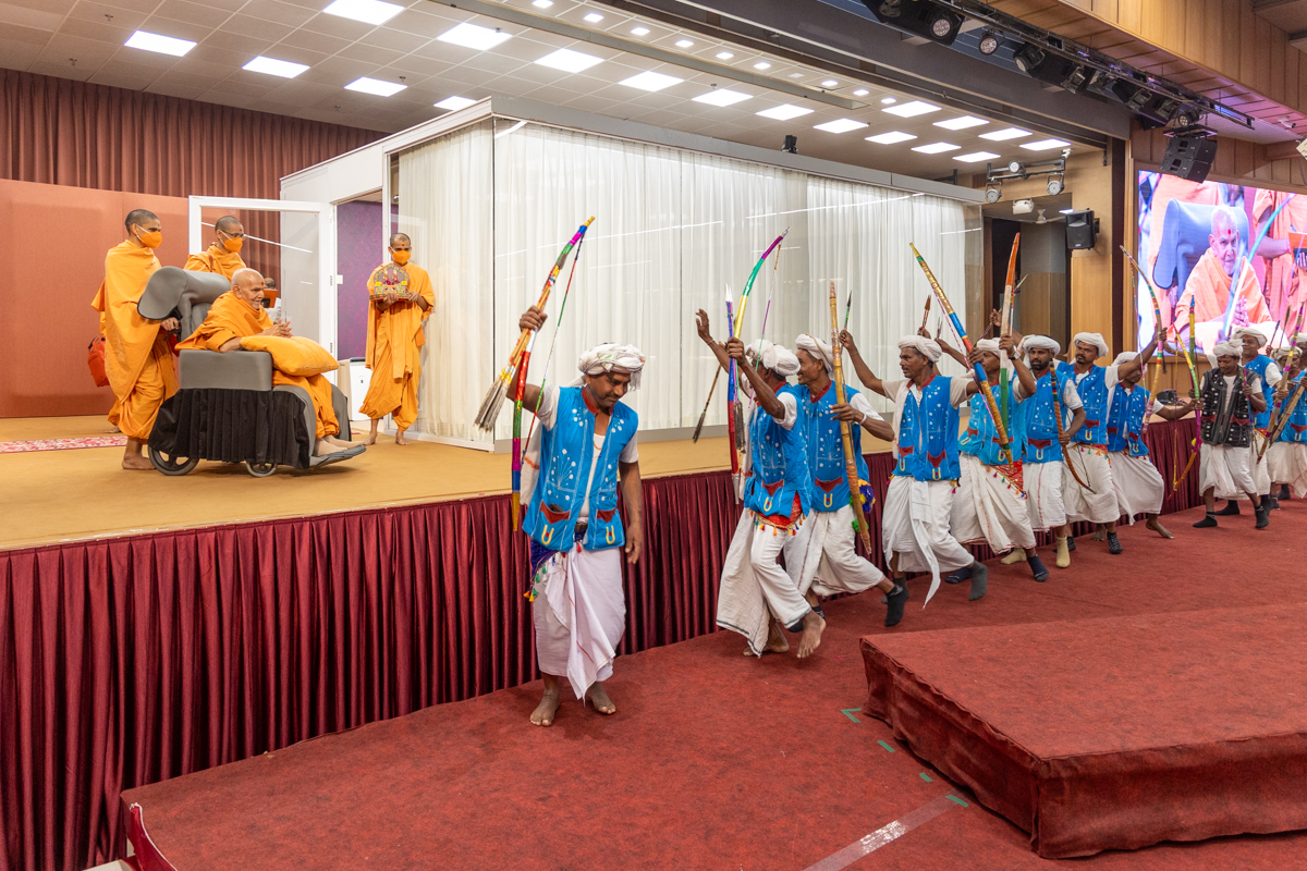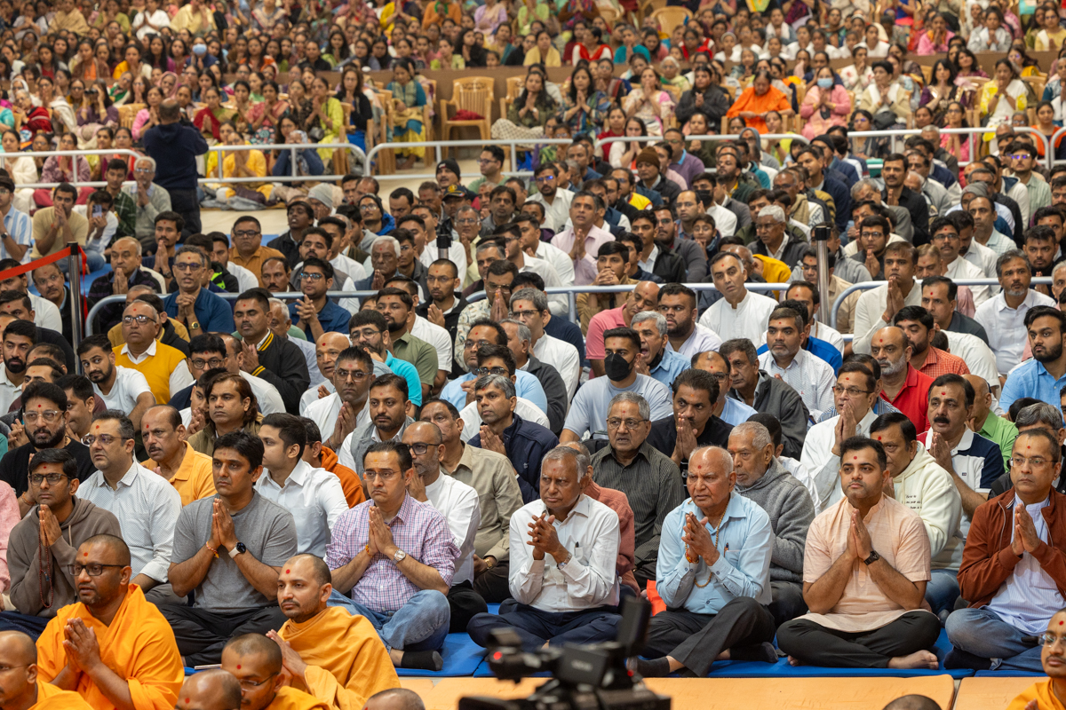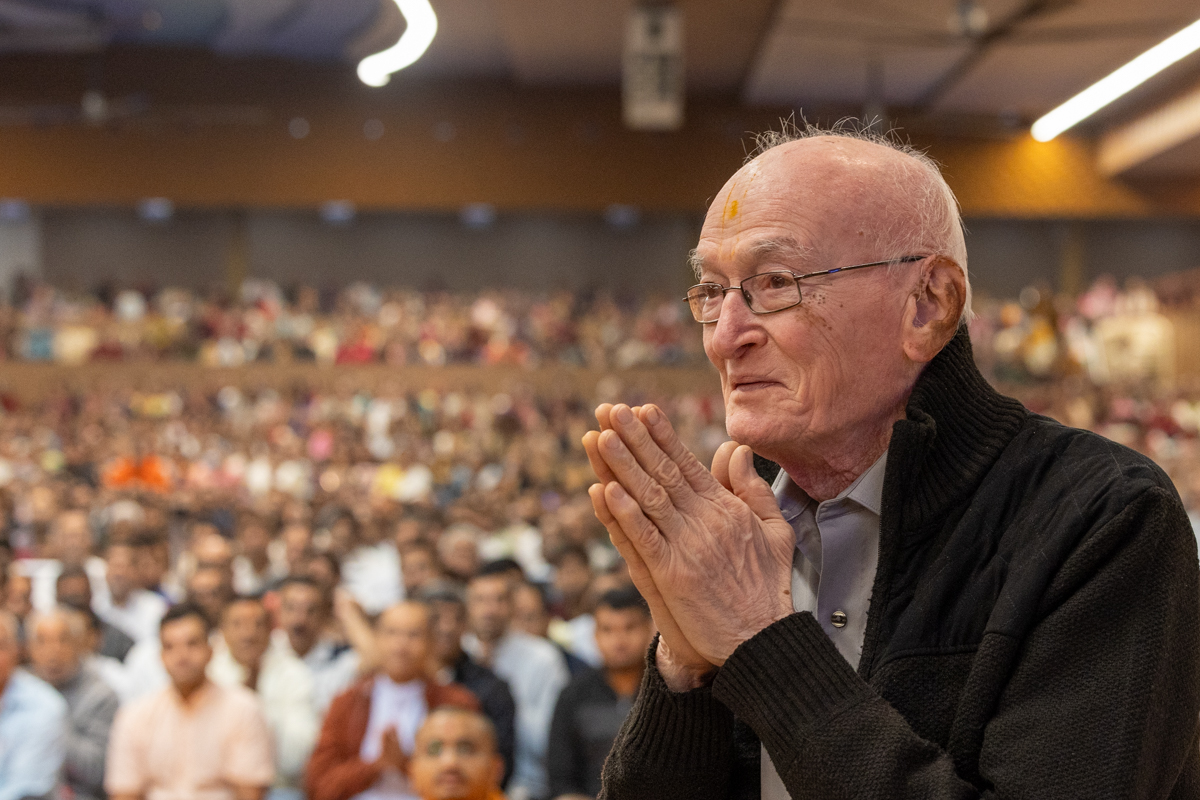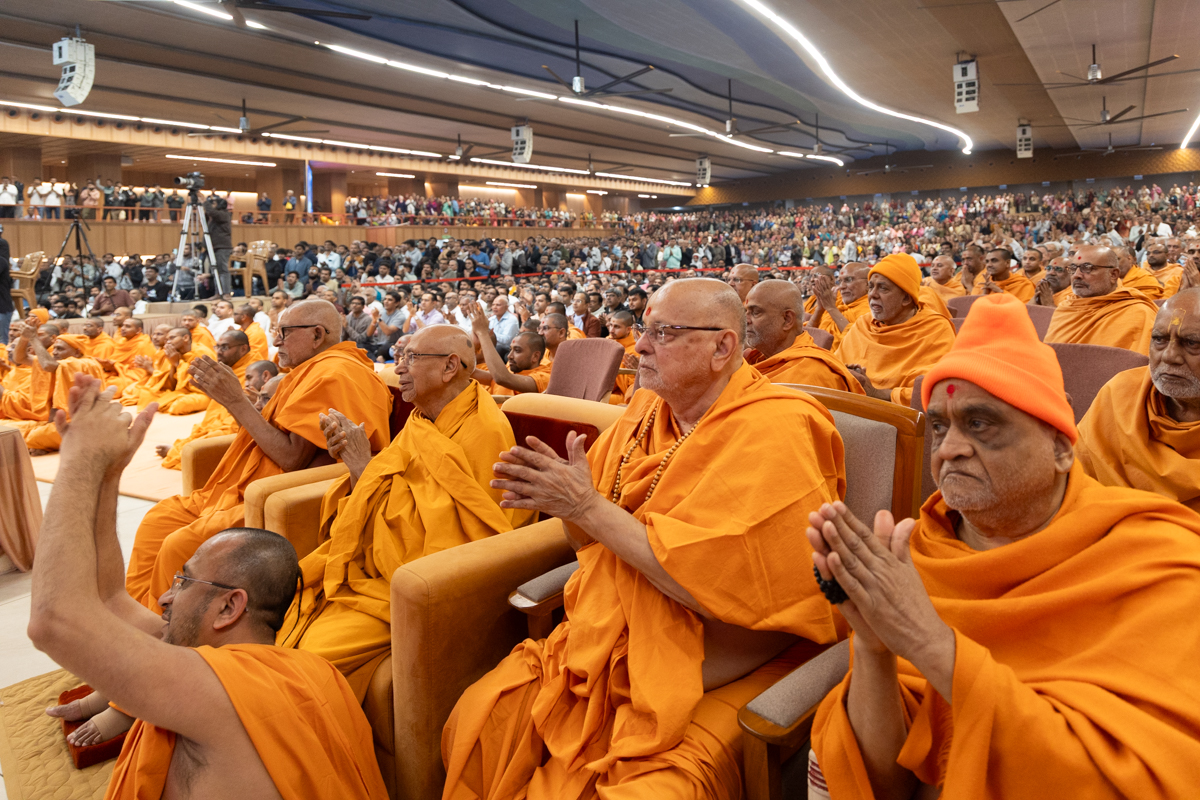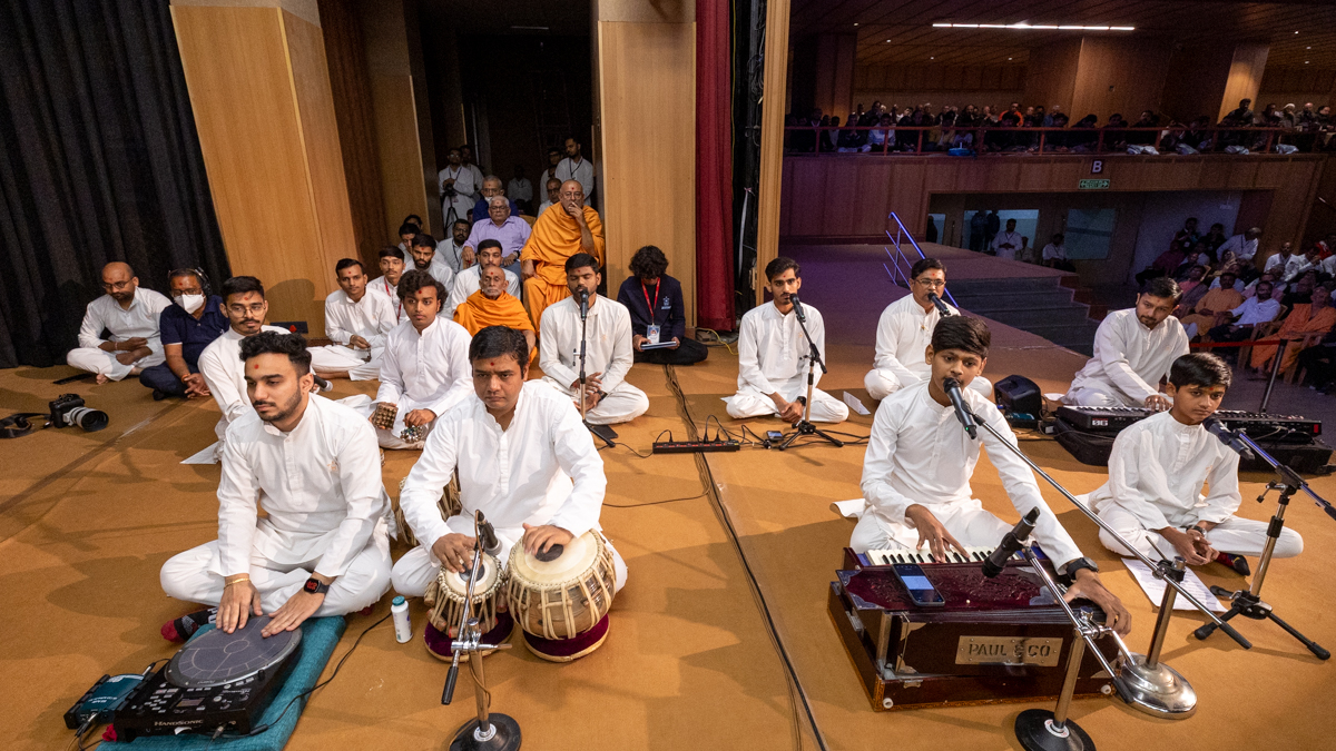 Children lead everyone in reciting the sadhana mantra and daily prayer in Swamishri's puja