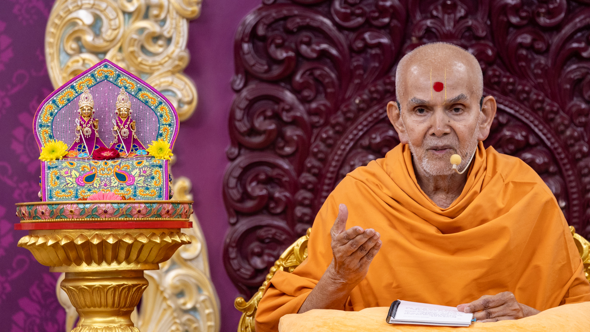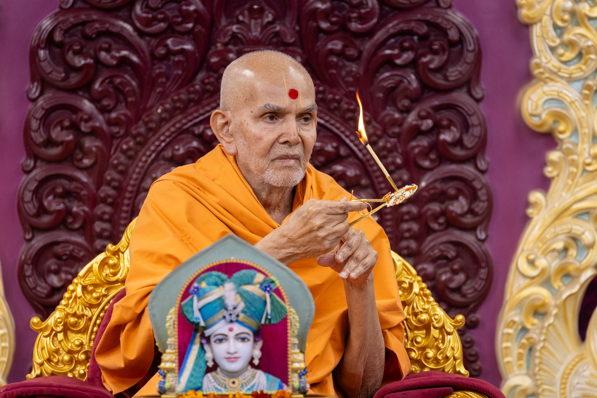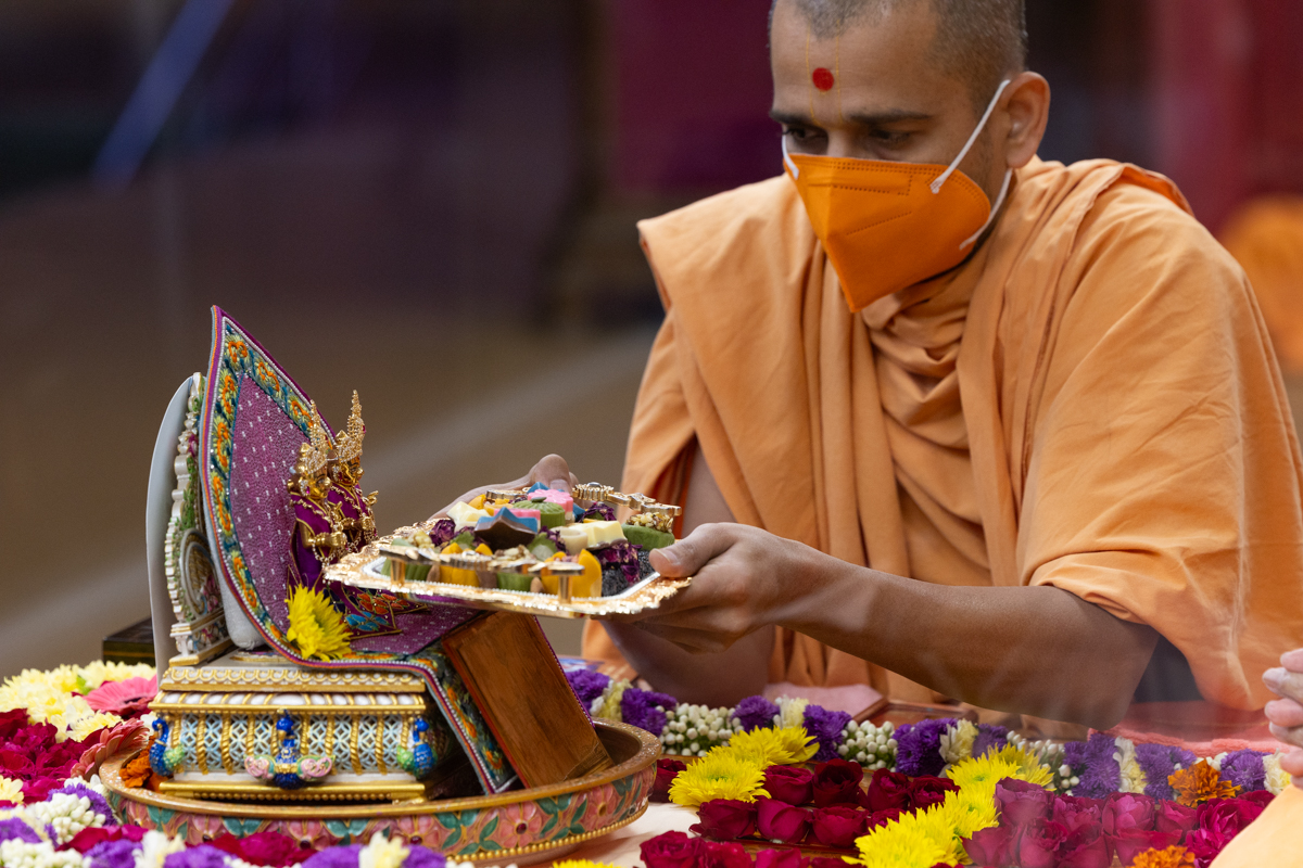 Swamishri offers thal to Shri Harikrishna Maharaj and Shri Gunatitanand Swami Maharaj