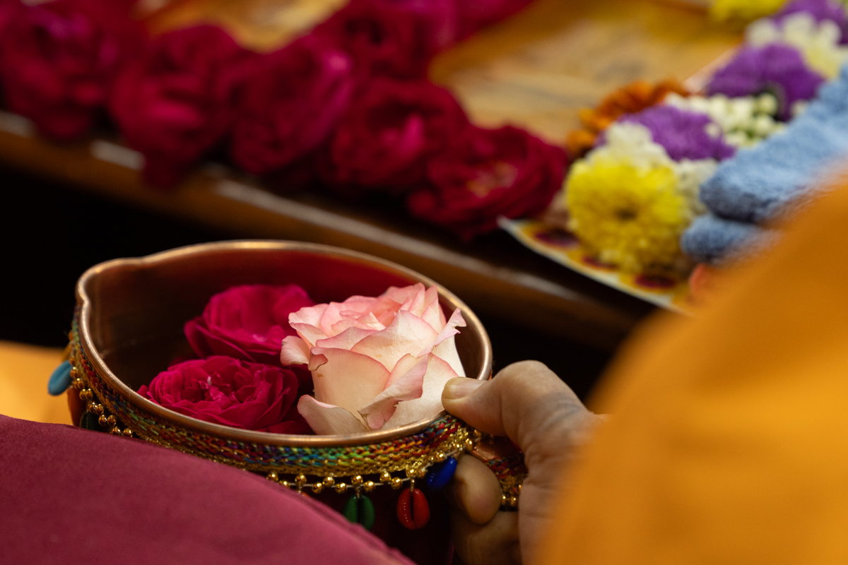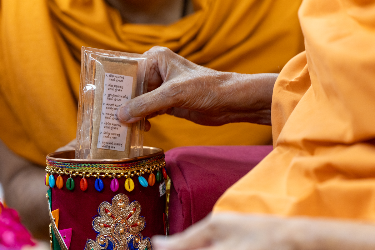 Swamishri sanctifies water with the holy relics of Bhagwan Swaminarayan and the Guru Parampara