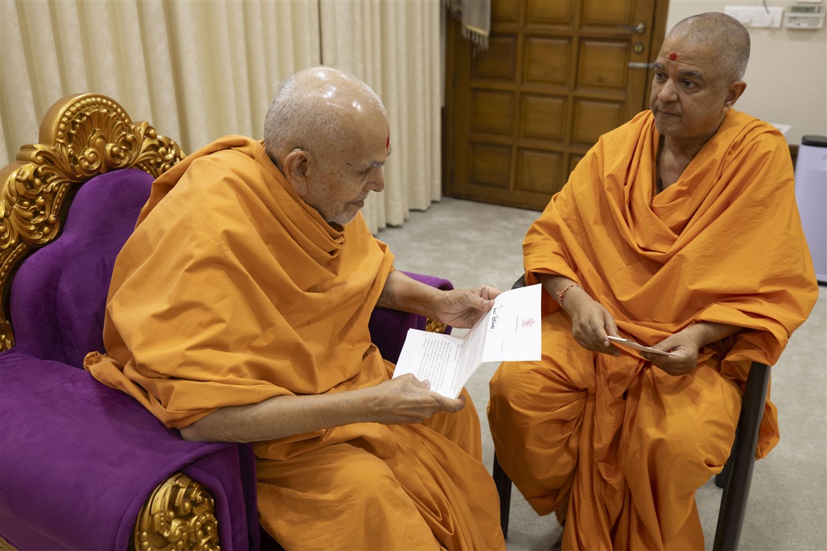Swamishri reading a heartfelt letter received from His Majesty King Charles, reflecting mutual respect, goodwill, and shared values of service, harmony, and global well-being