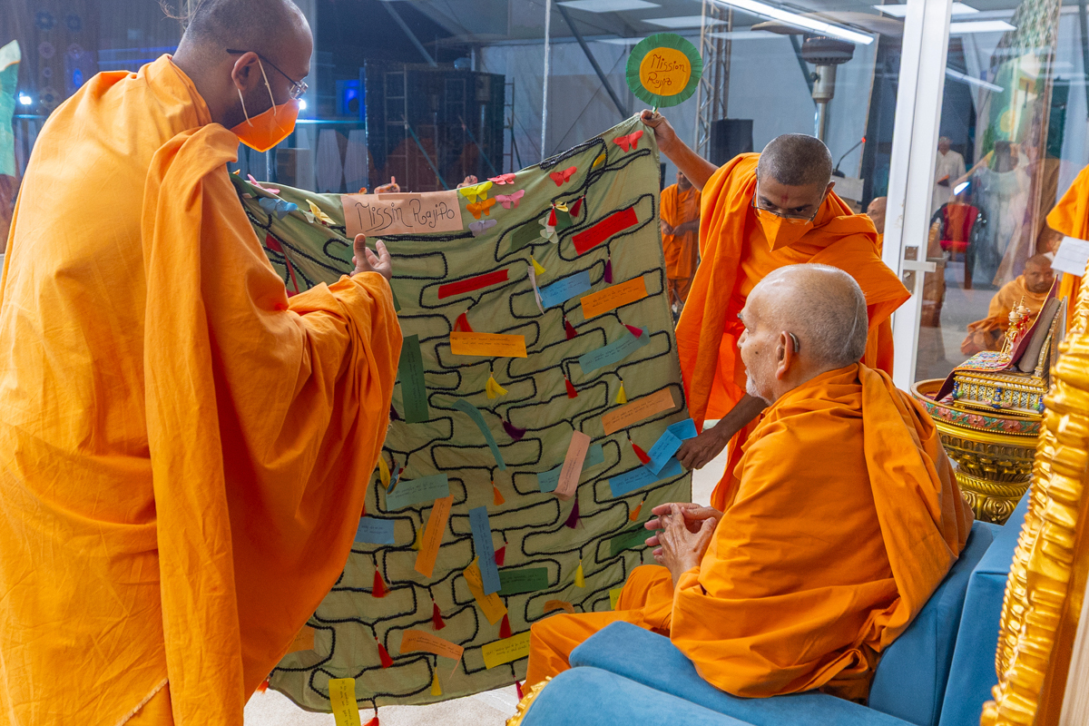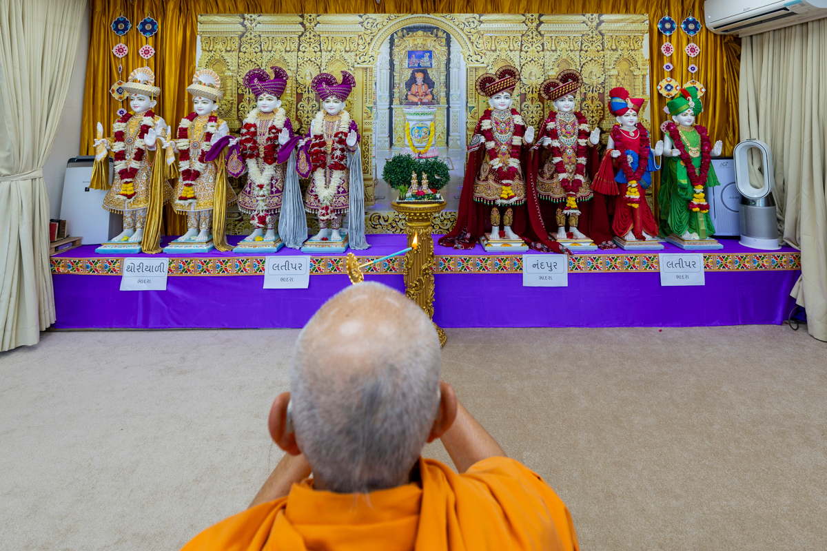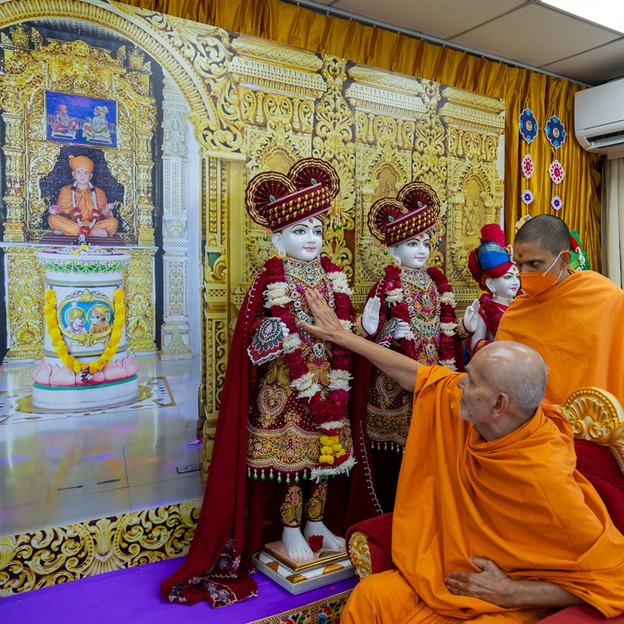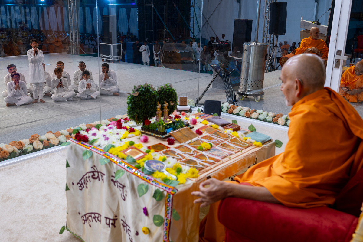 Pujya Ghanshyamcharan Swami, Pujya Viveksagar Swami, swamis and youths doing Swamishri's puja darshan