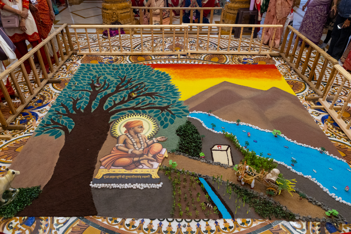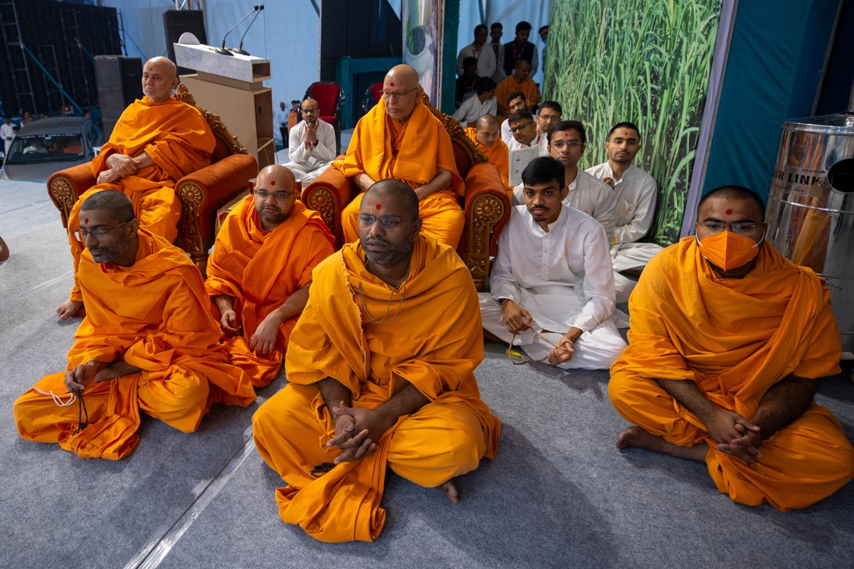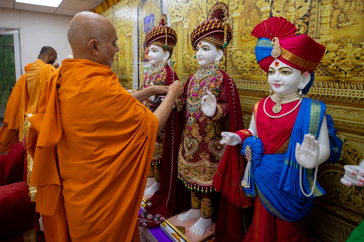 Pujya Ghanshyamcharan Swami, Pujya Viveksagar Swami, swamis and youths doing Swamishri's puja darshan