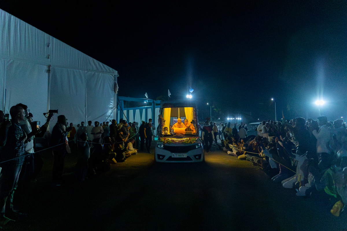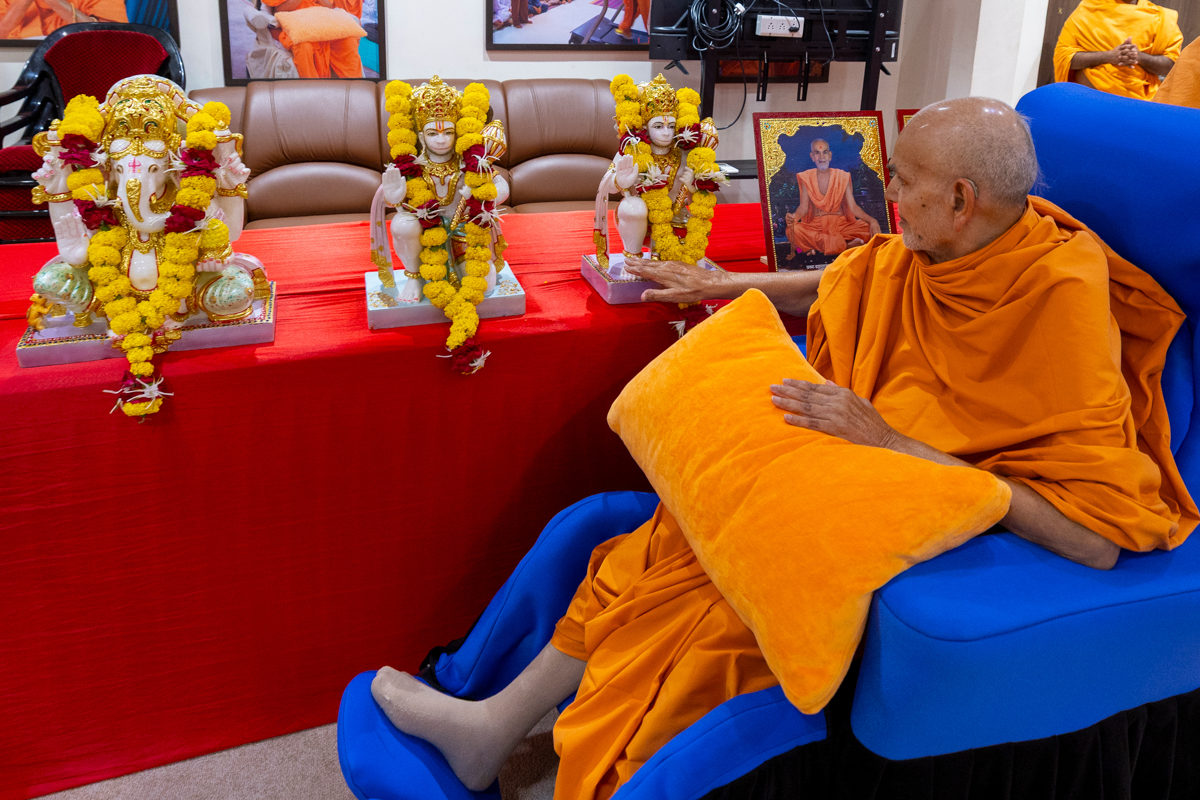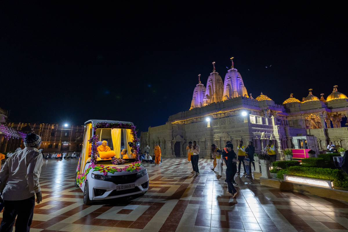 Param Pujya Mahant Swami Maharaj on his way to perform his daily puja