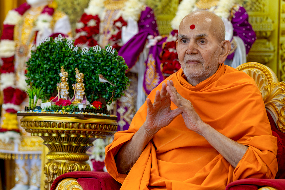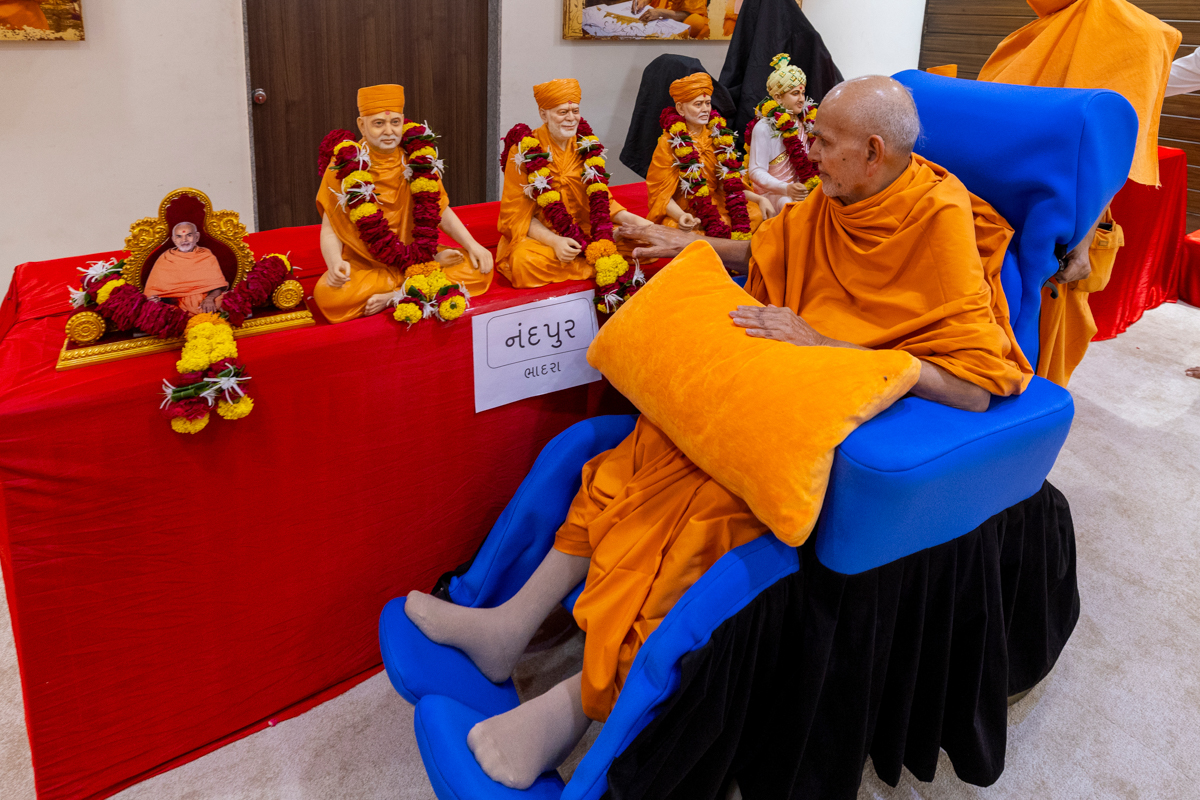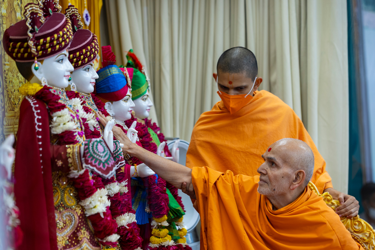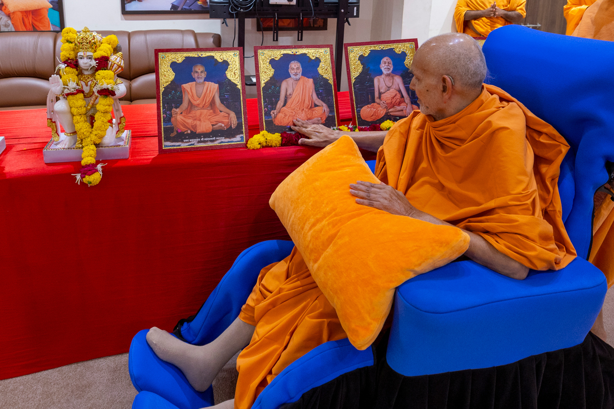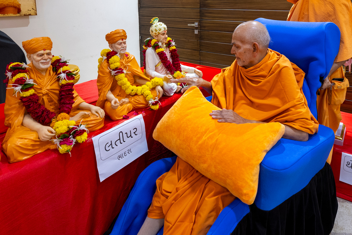 Swamishri engrossed in darshan of Shri Harikrishna Maharaj and Shri Gunatitanand Swami Maharaj