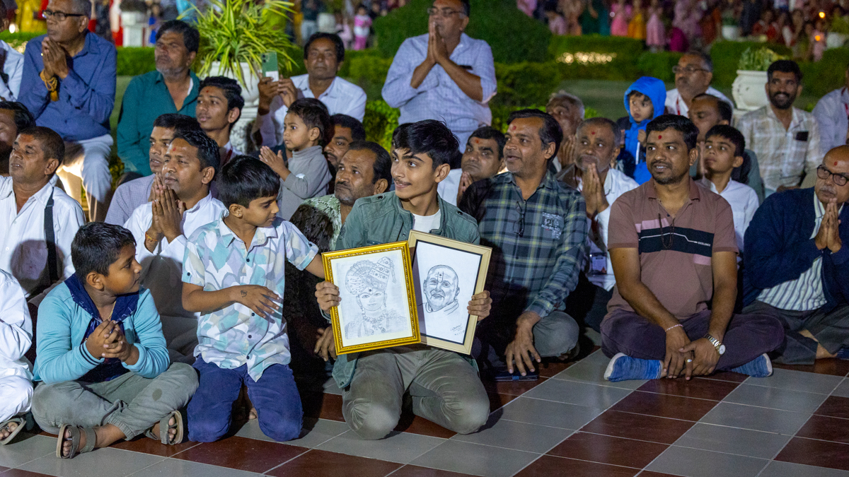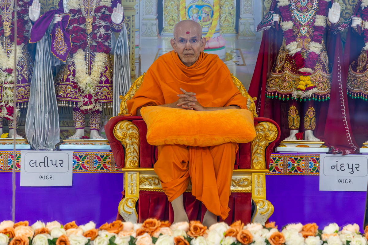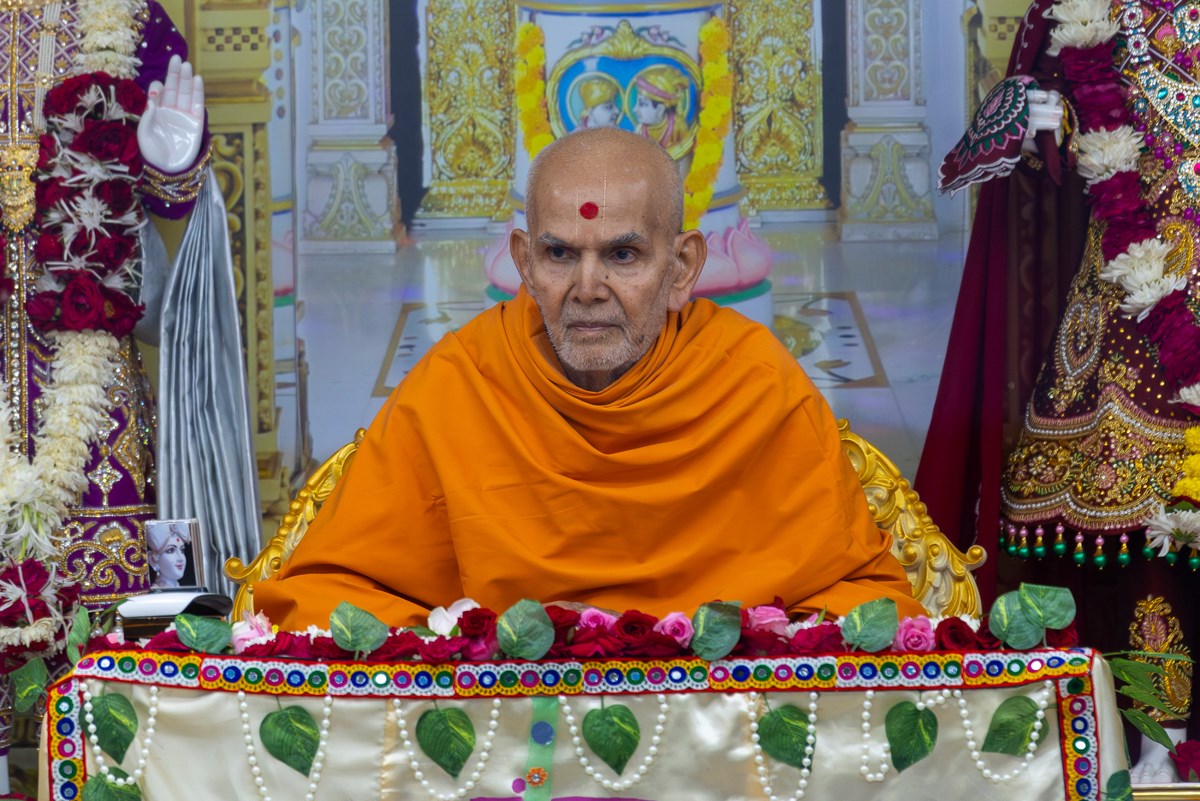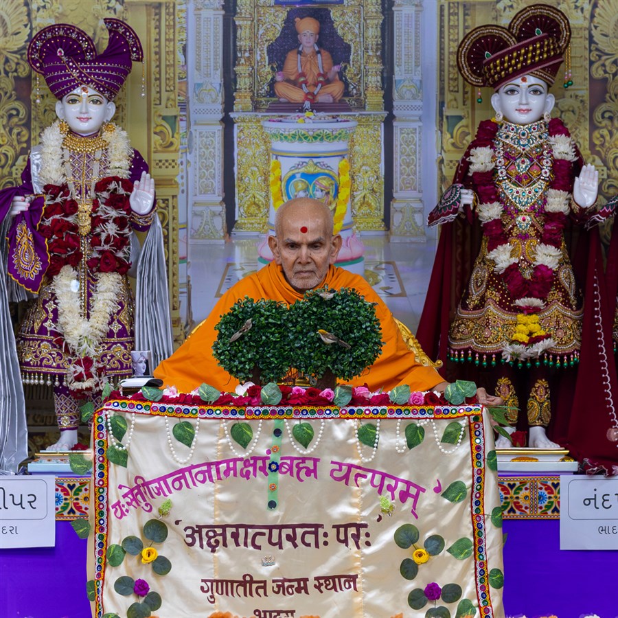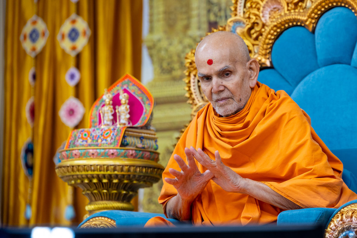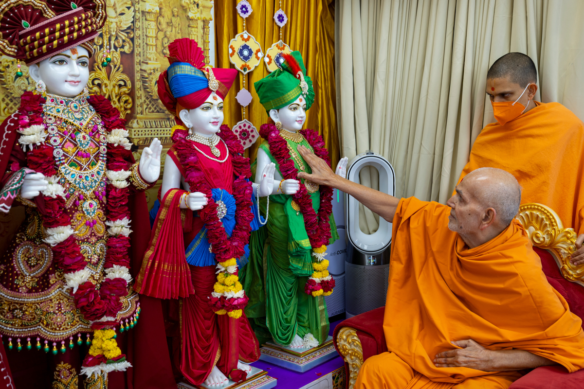 Swamishri engrossed in darshan of Shri Harikrishna Maharaj and Shri Gunatitanand Swami Maharaj